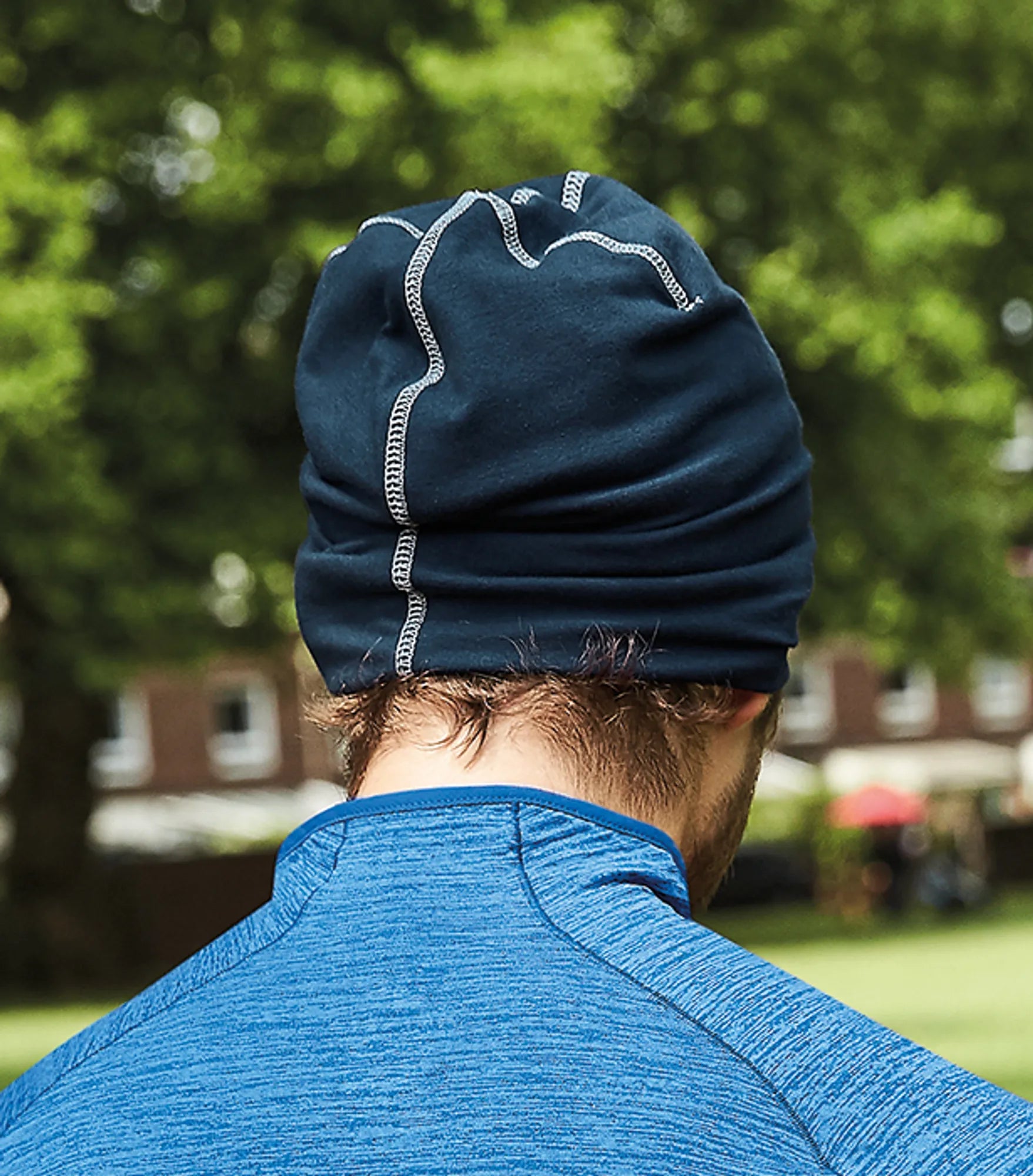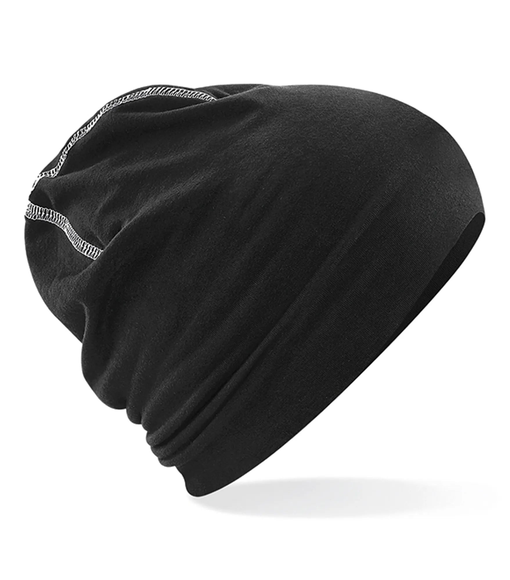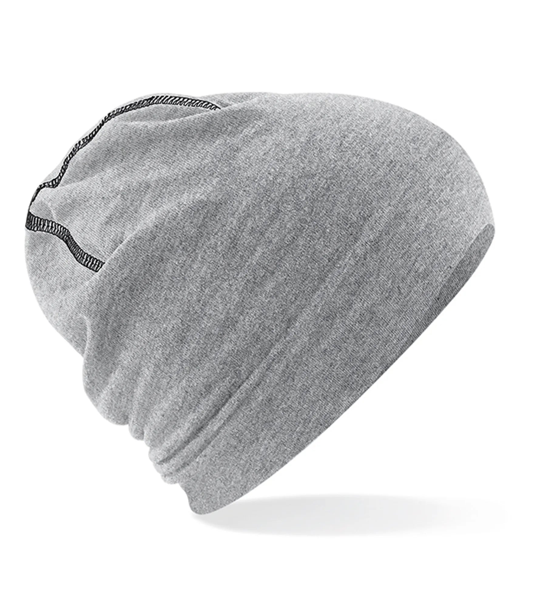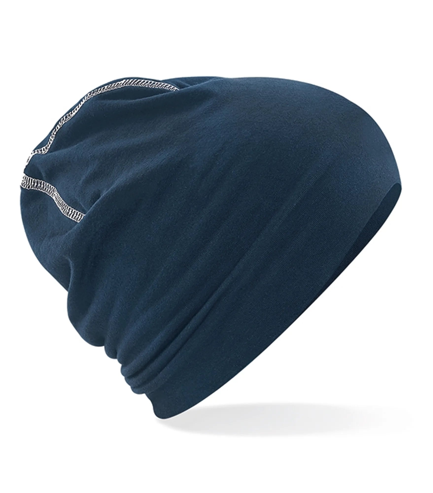 Tät dubbelstickad bomullsmössa med elastan med overlockdetaljer. Rebrandable.