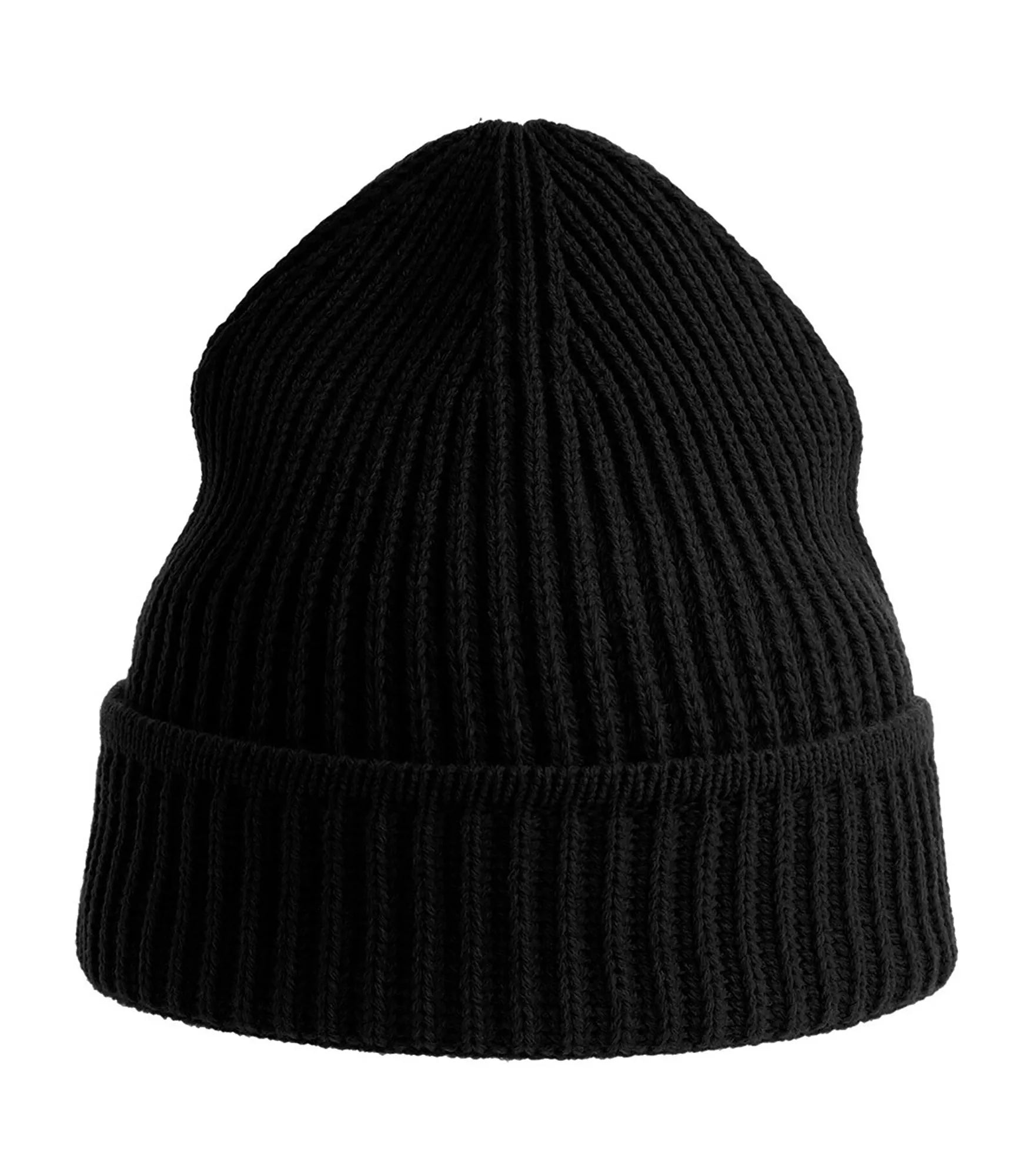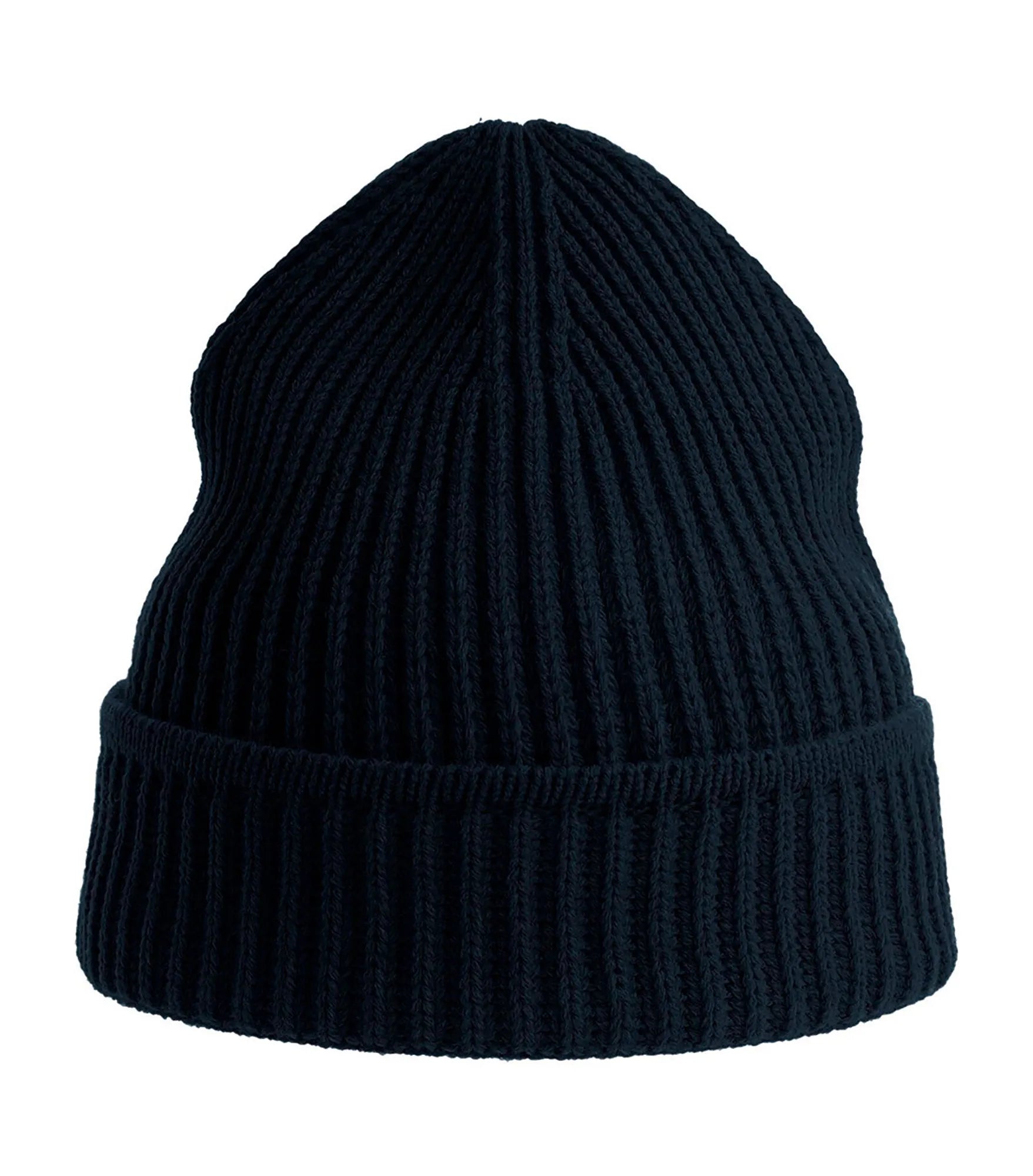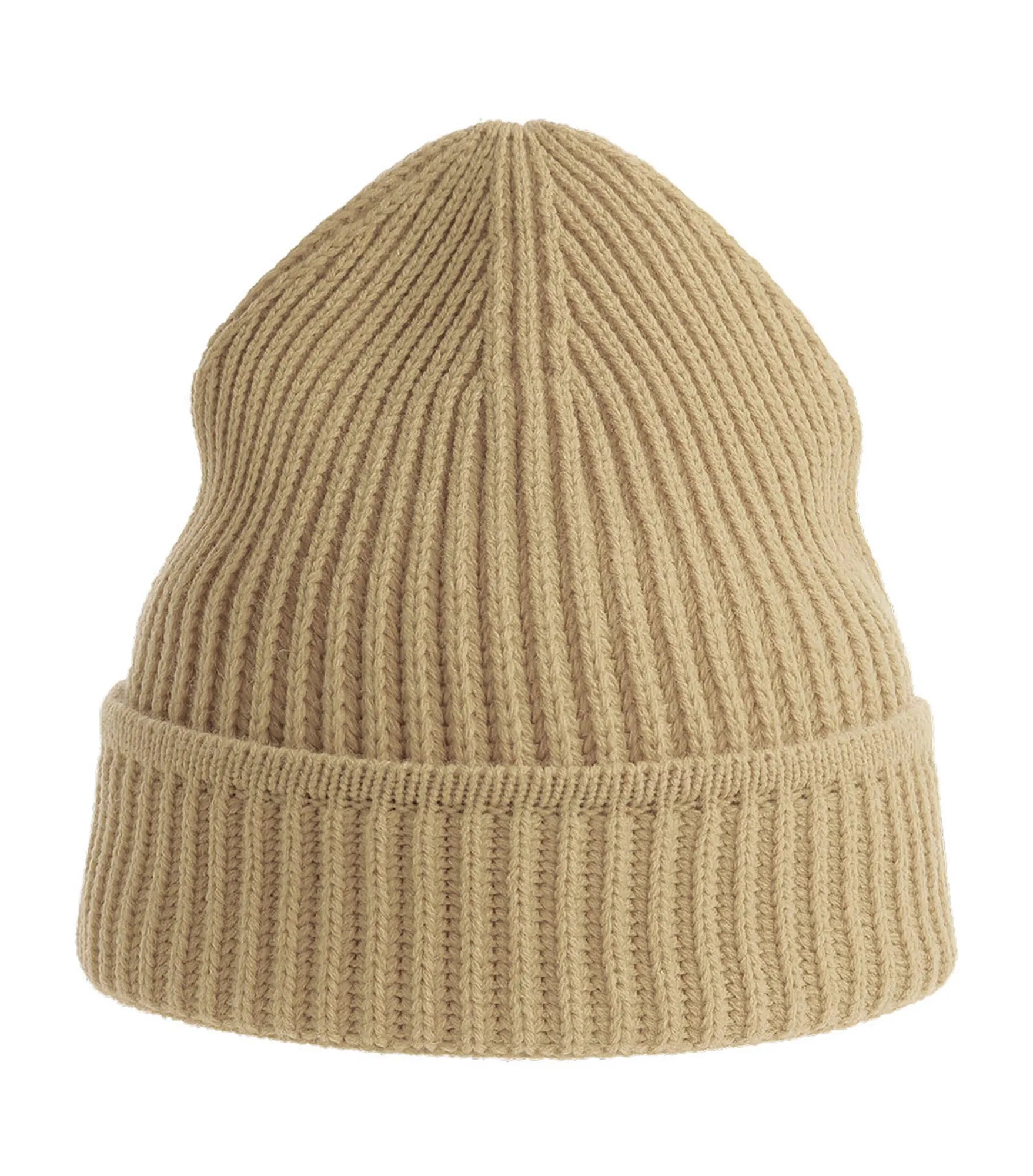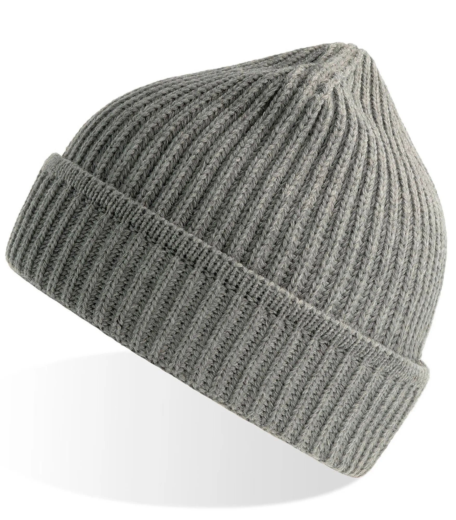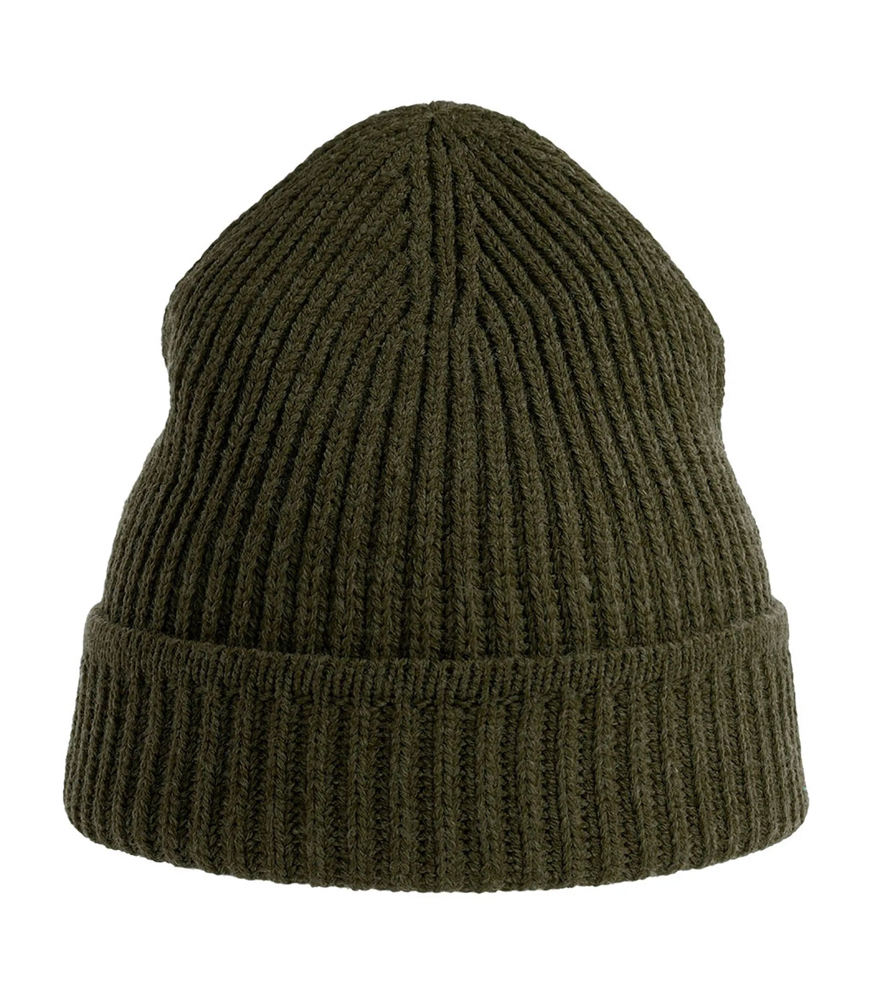 Ribbstickad mössa med uppvik, tillverkad av återvunnet material. Ribbstickad mudd på uppviket.