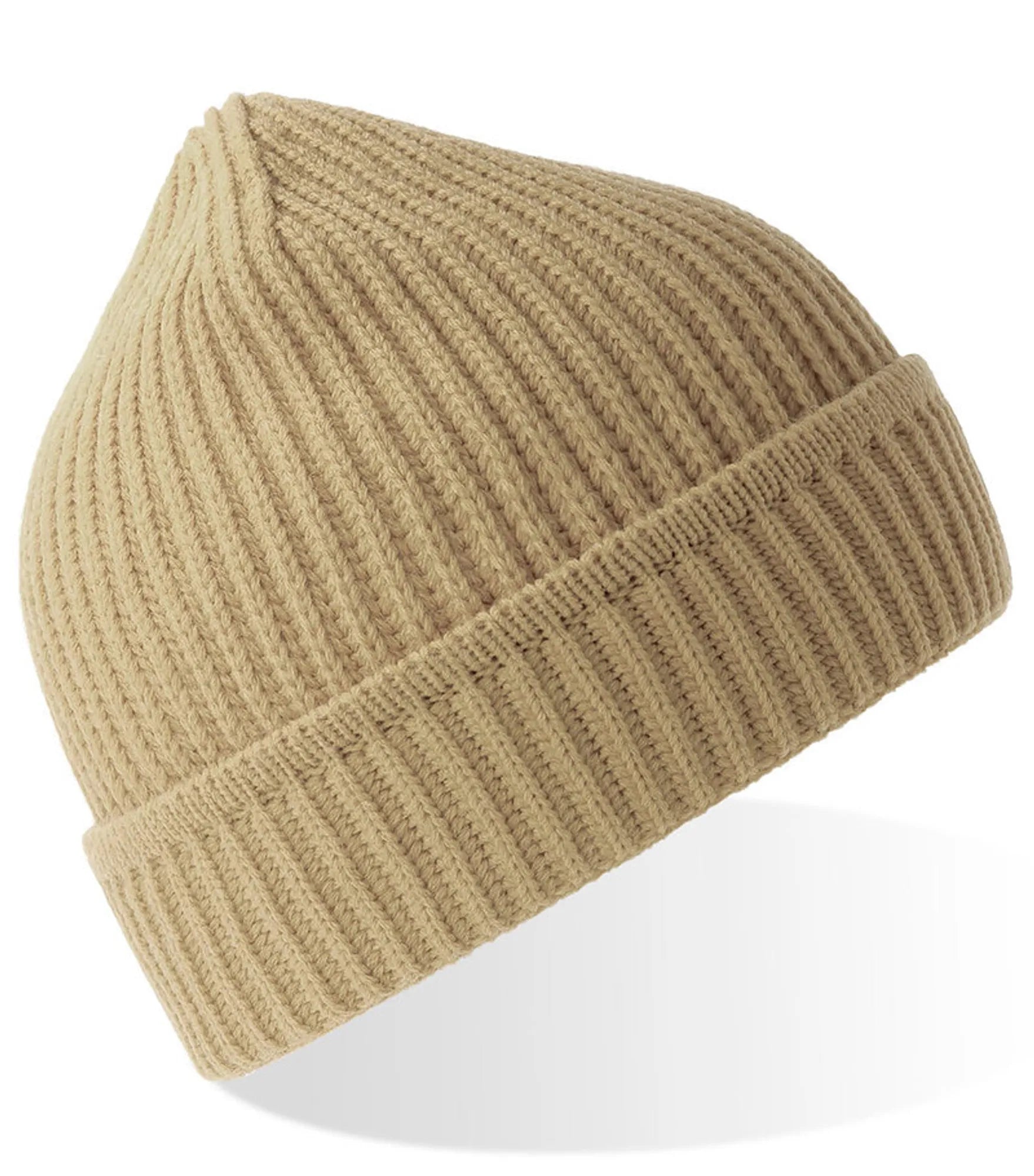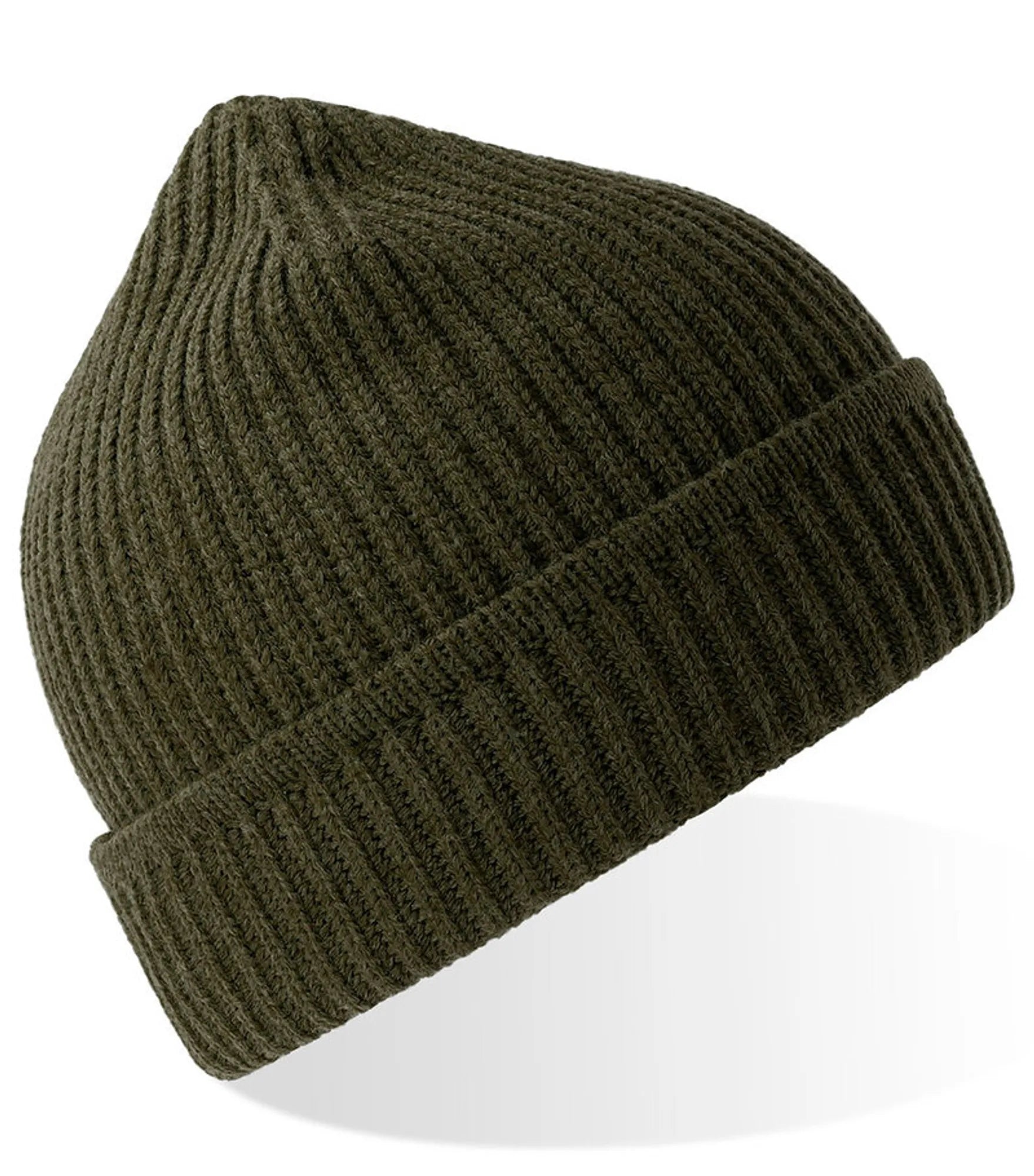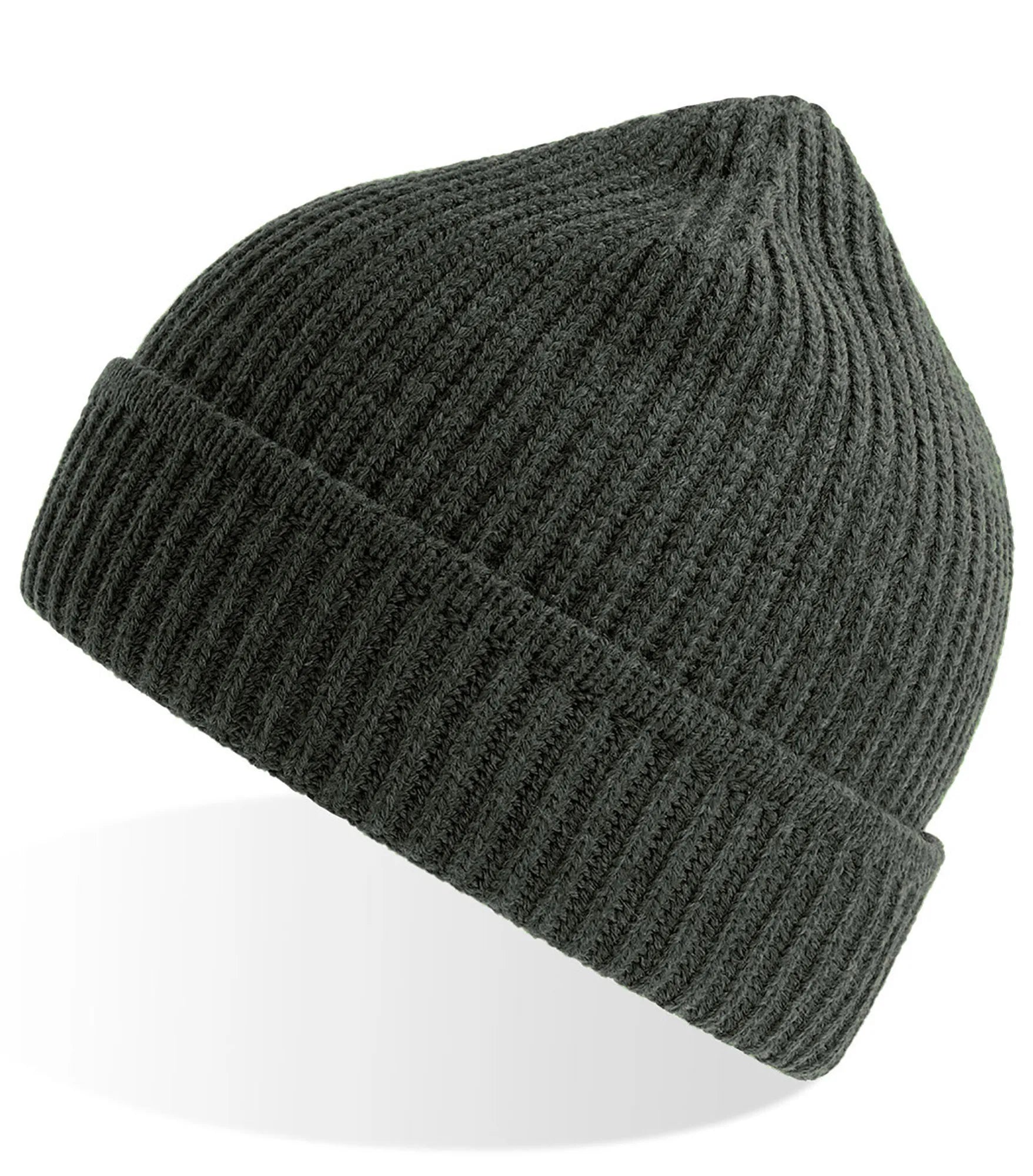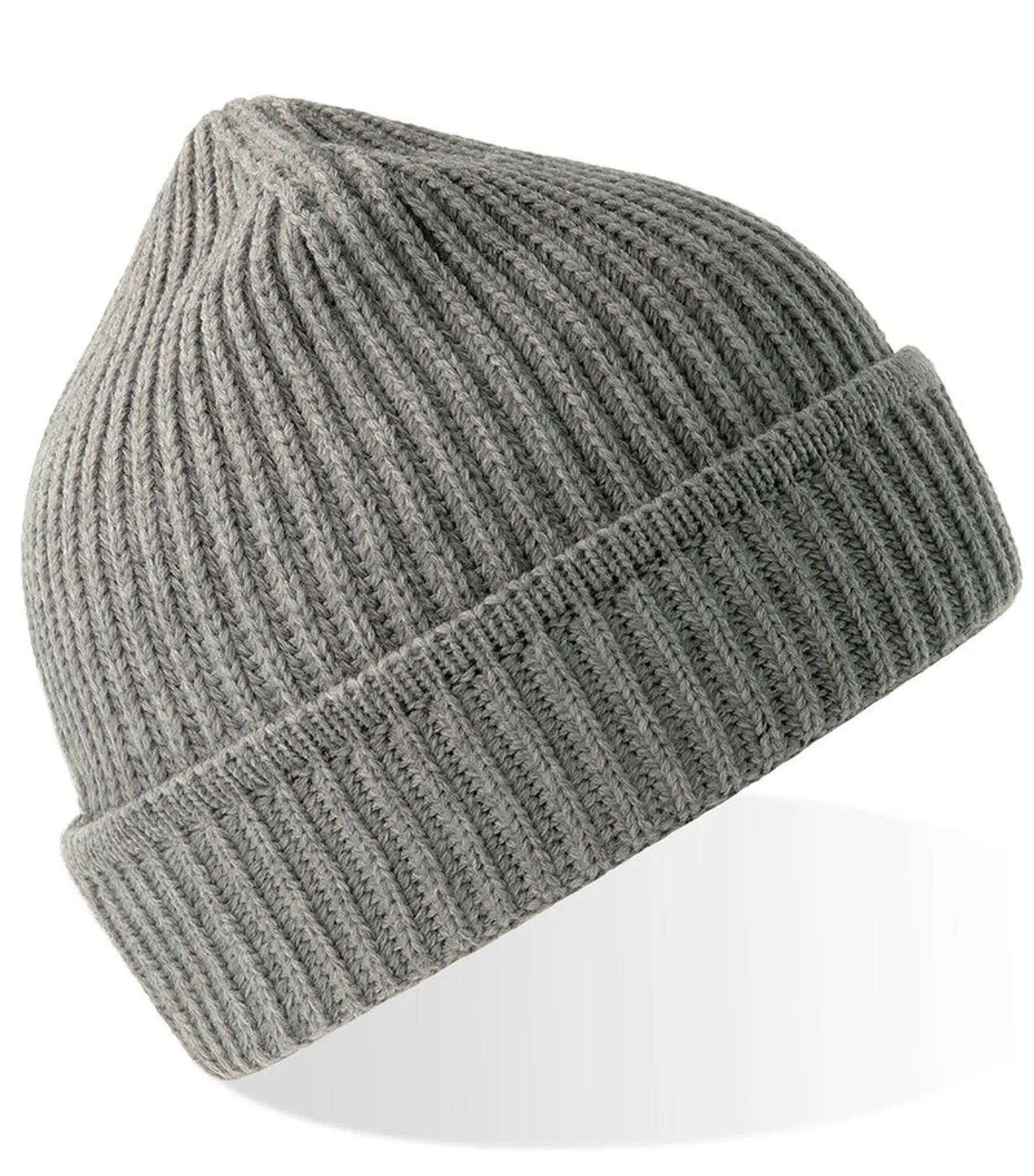 Ribbstickad mössa med uppvik, tillverkad av återvunnet material. Ribbstickad mudd på uppviket.
