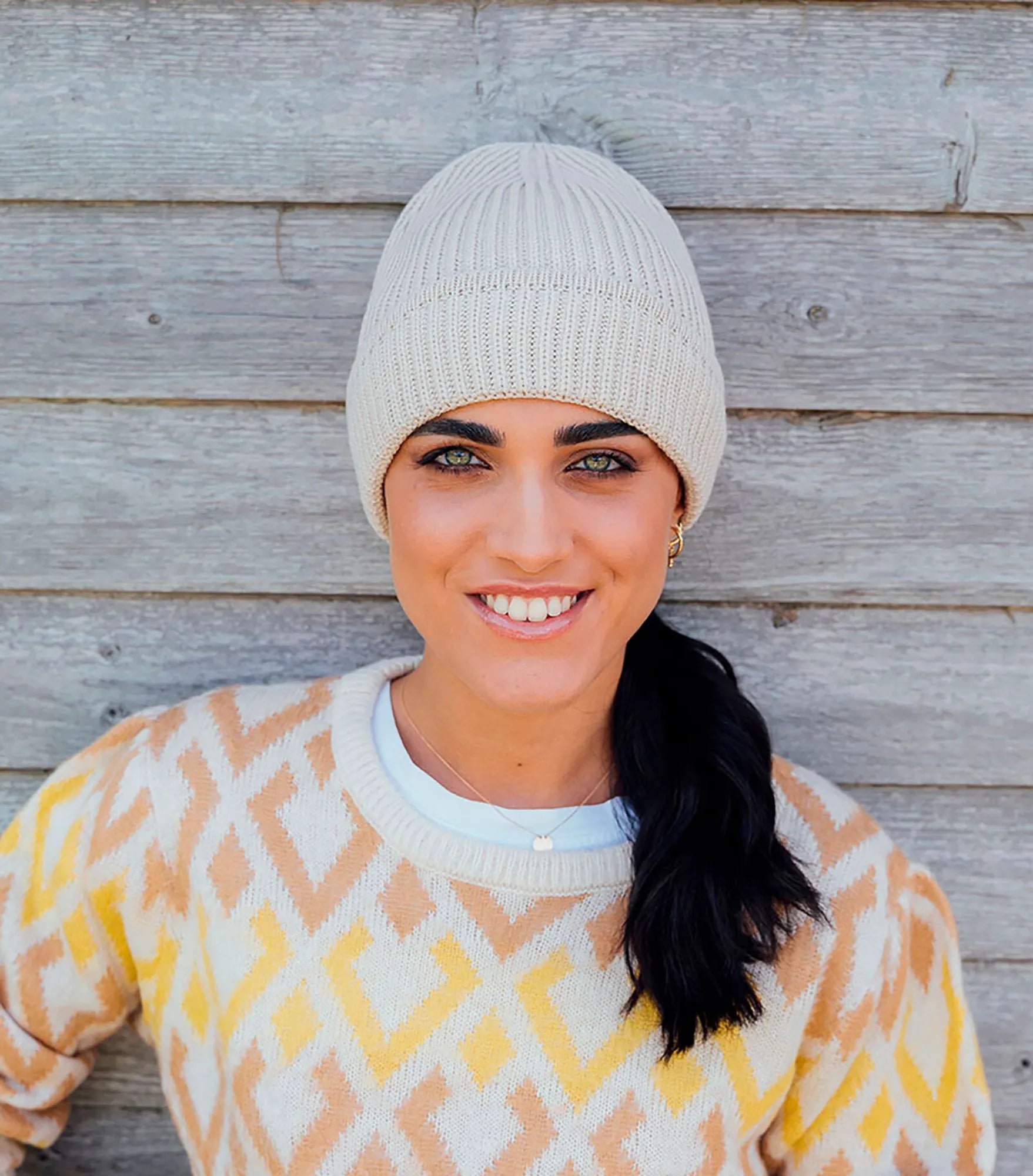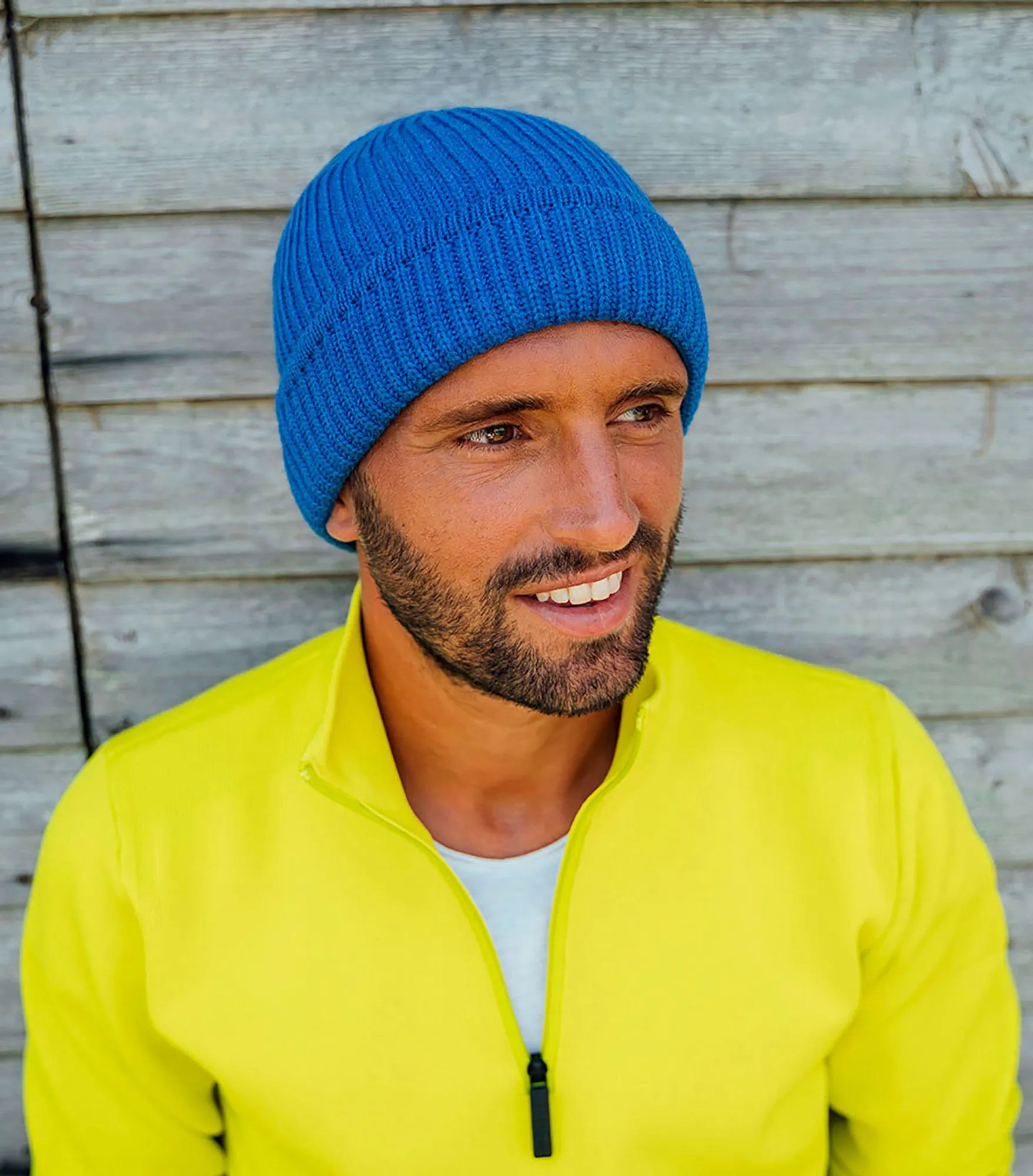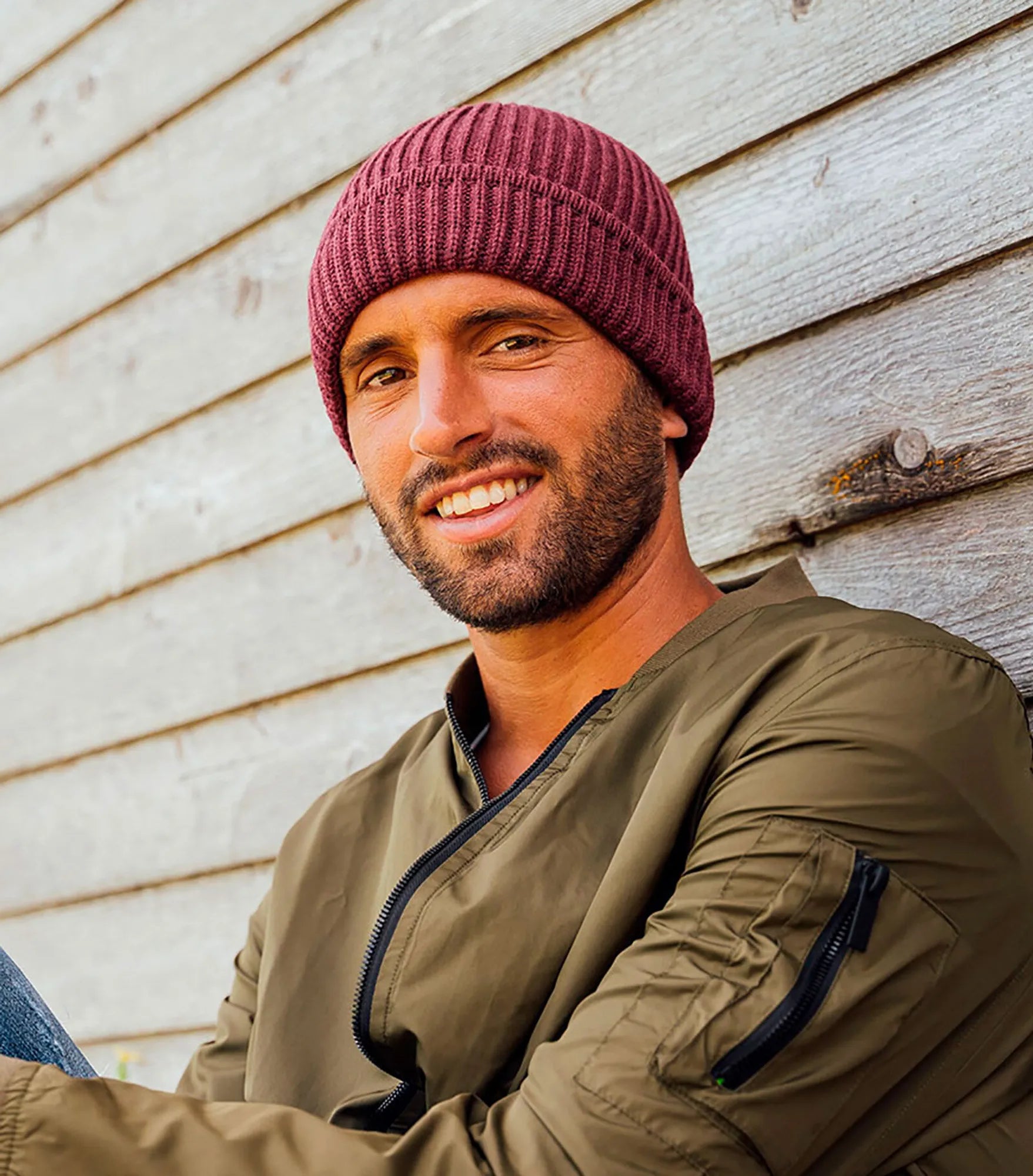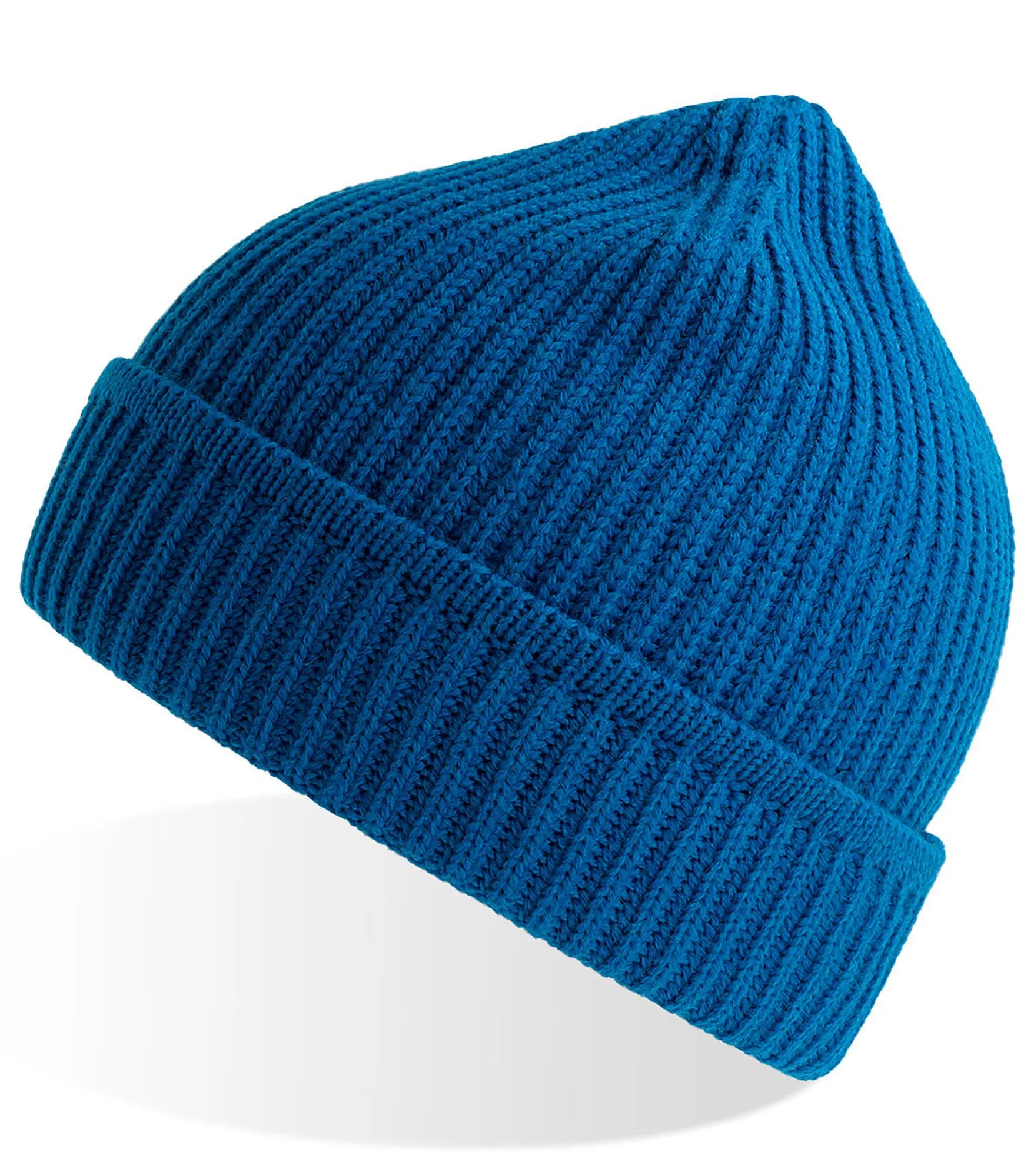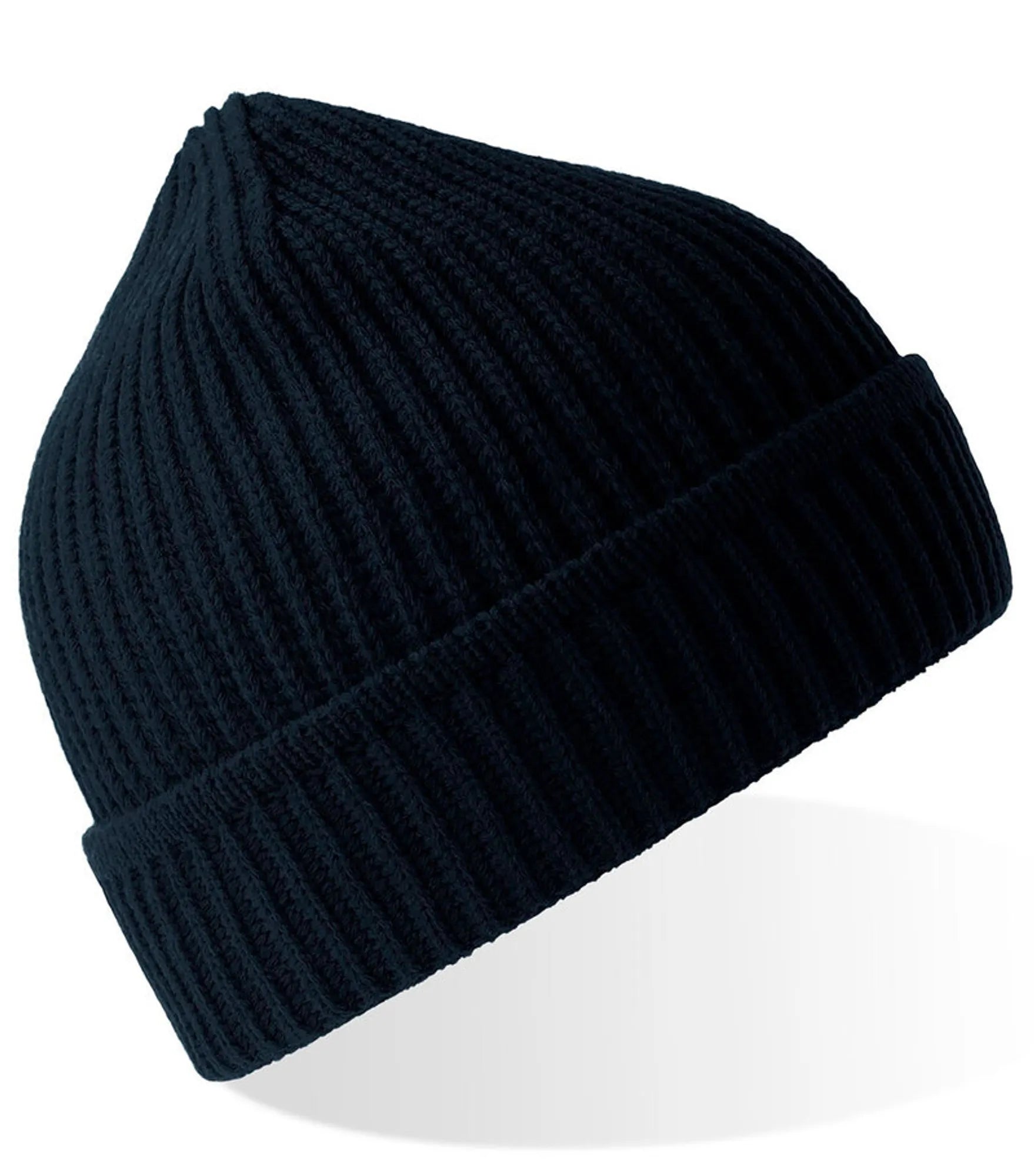 Ribbstickad mössa med uppvik, tillverkad av återvunnet material. Ribbstickad mudd på uppviket.