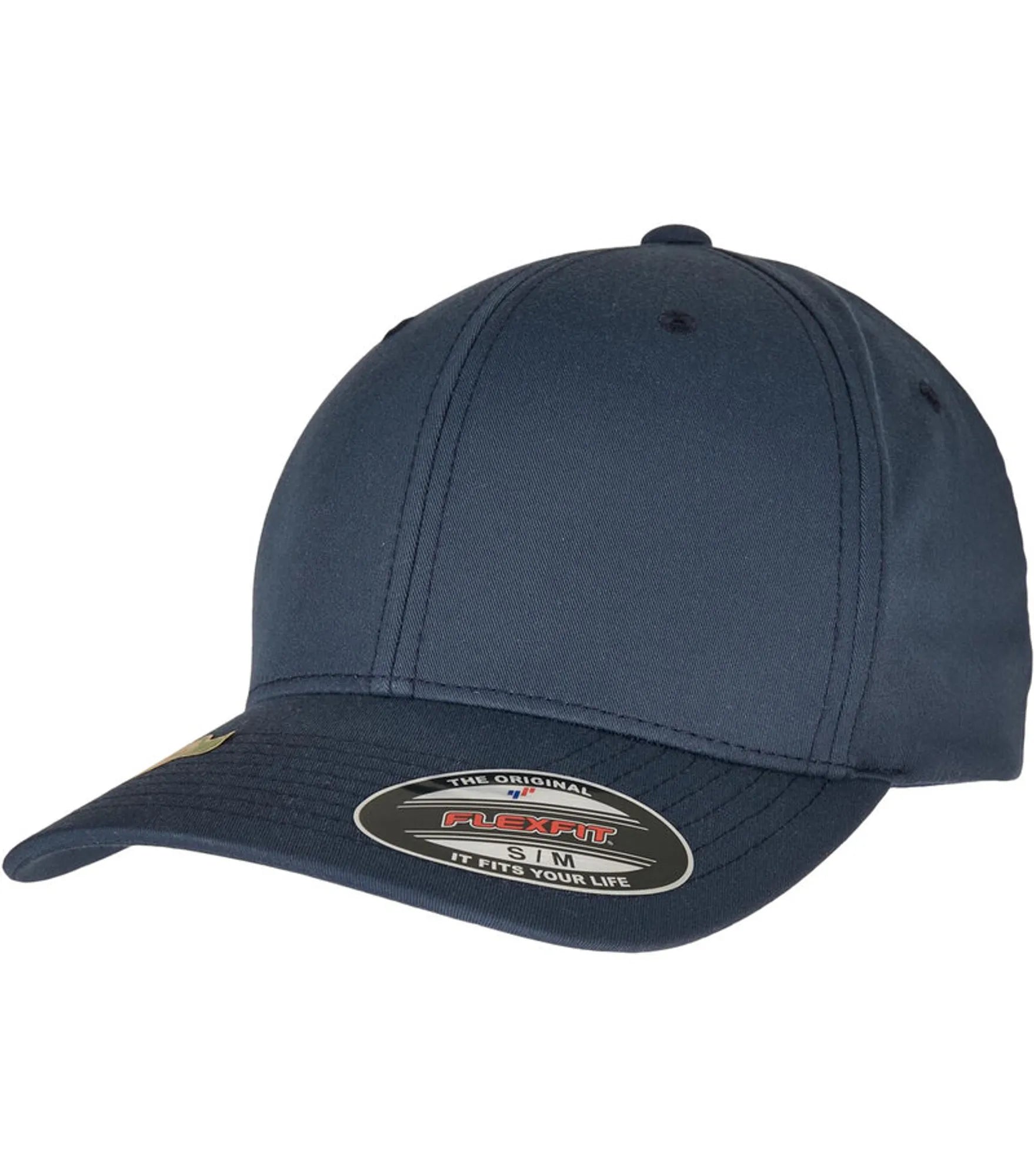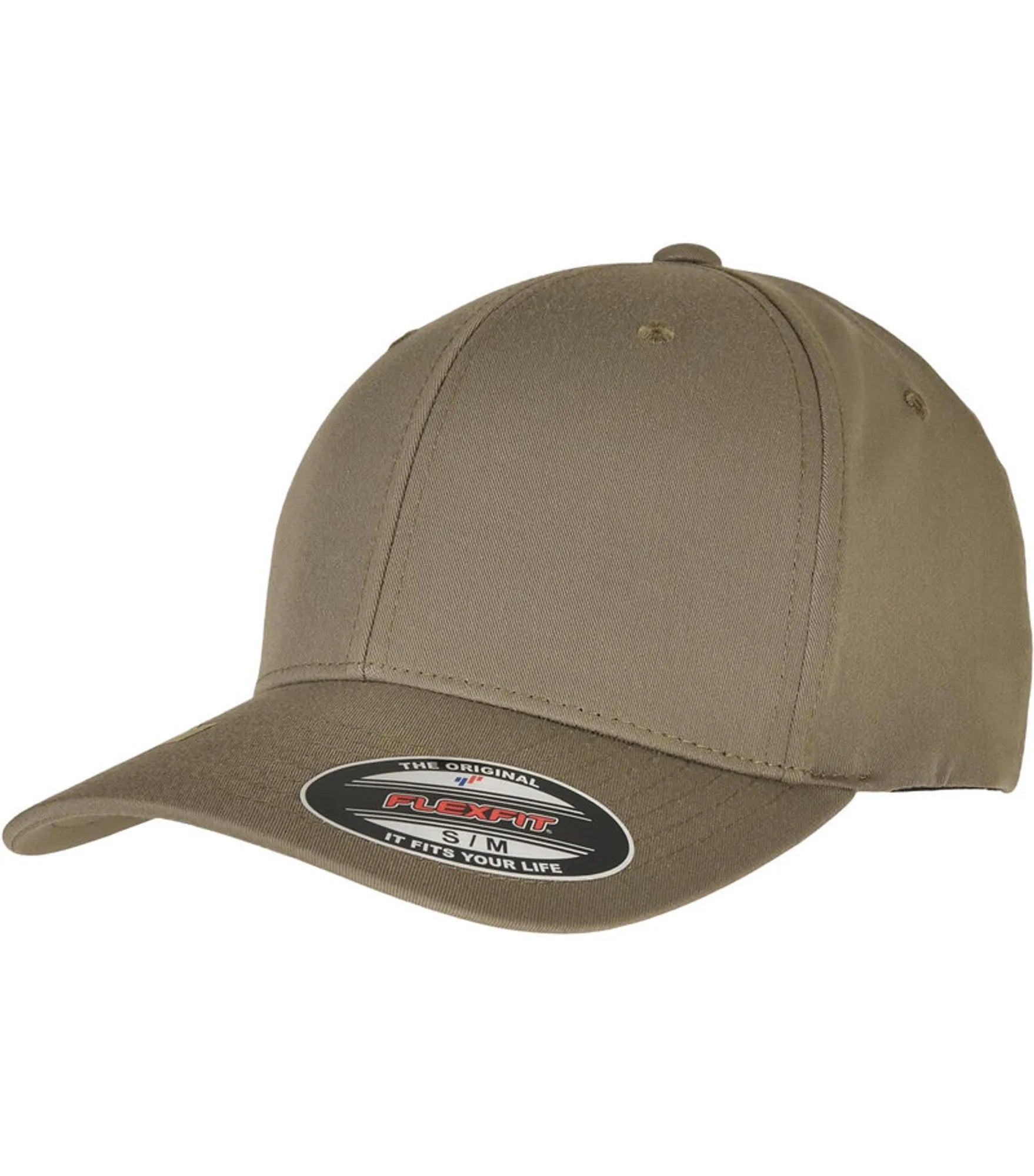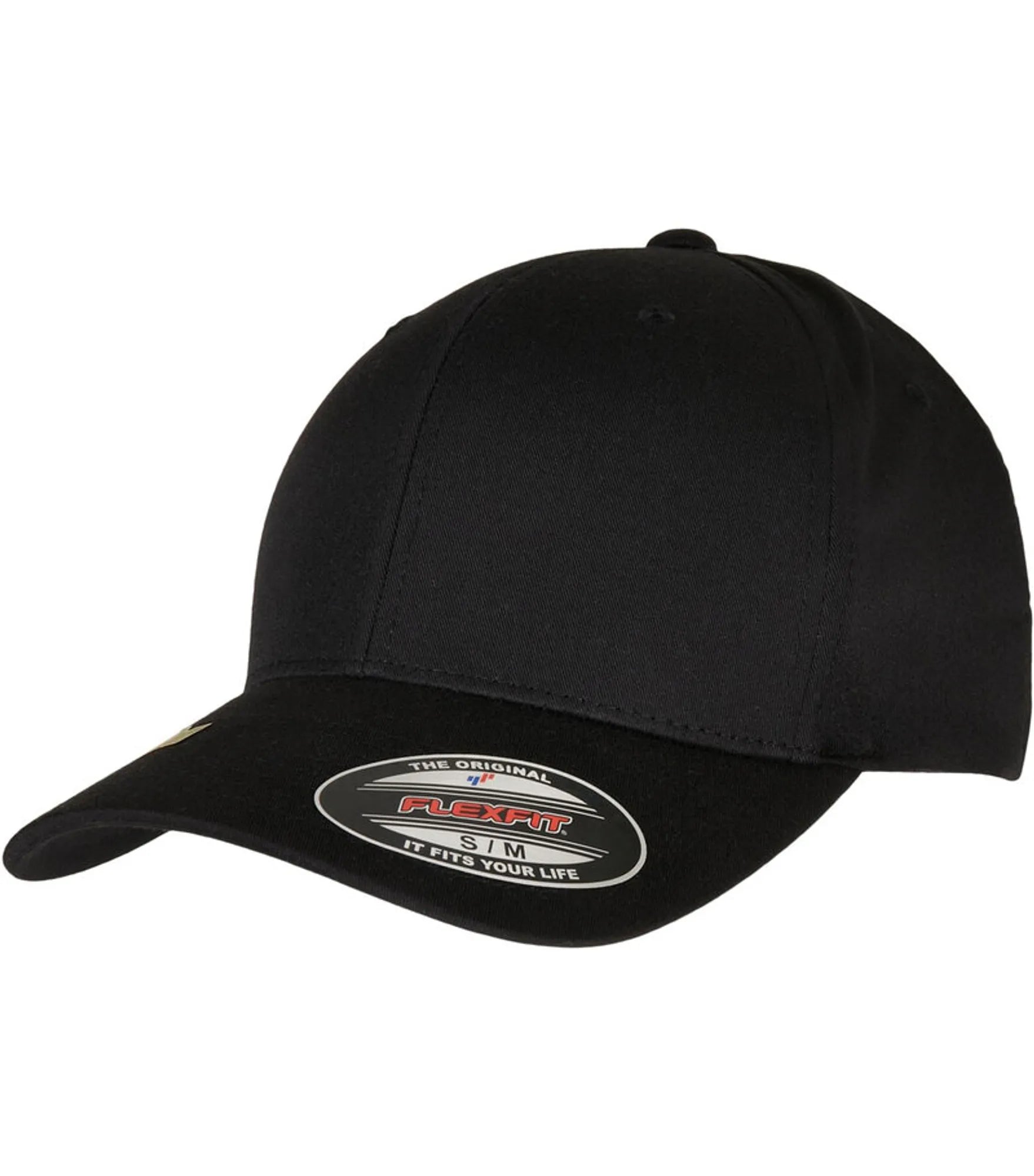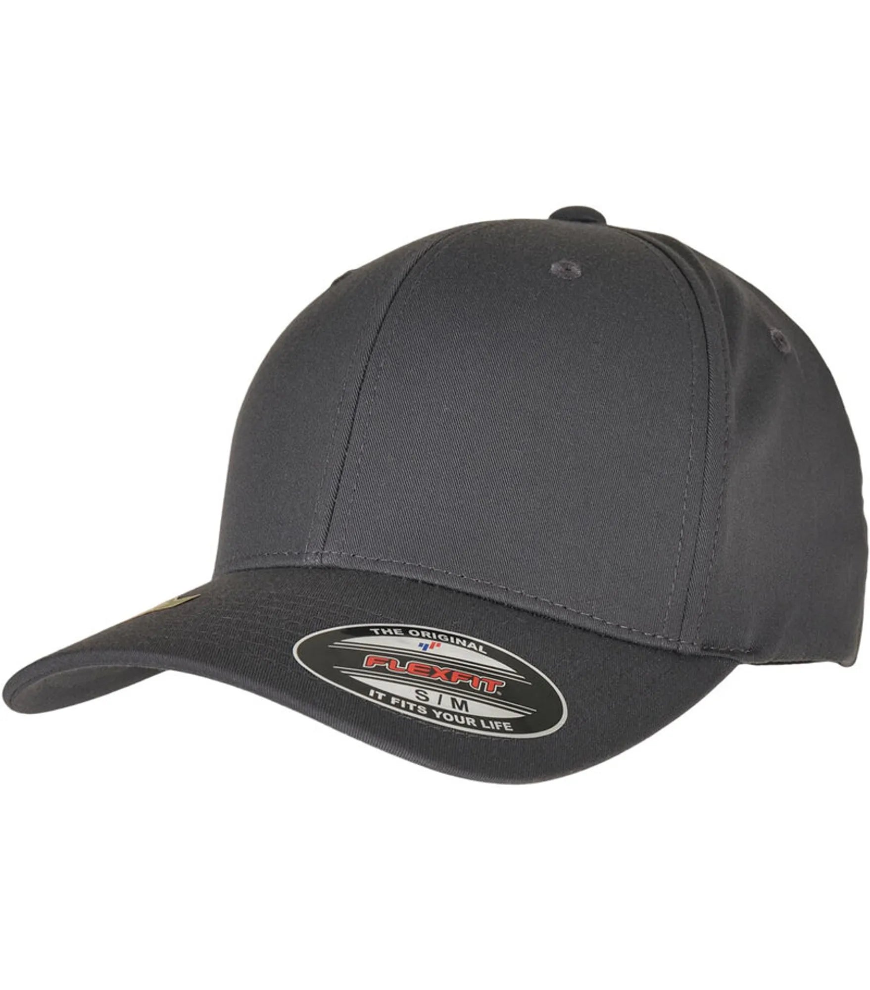 Cap med 6 paneler og bøyd brem, uten spenne (FLEXFIT). Finnes i størrelse S/M og L/XL.