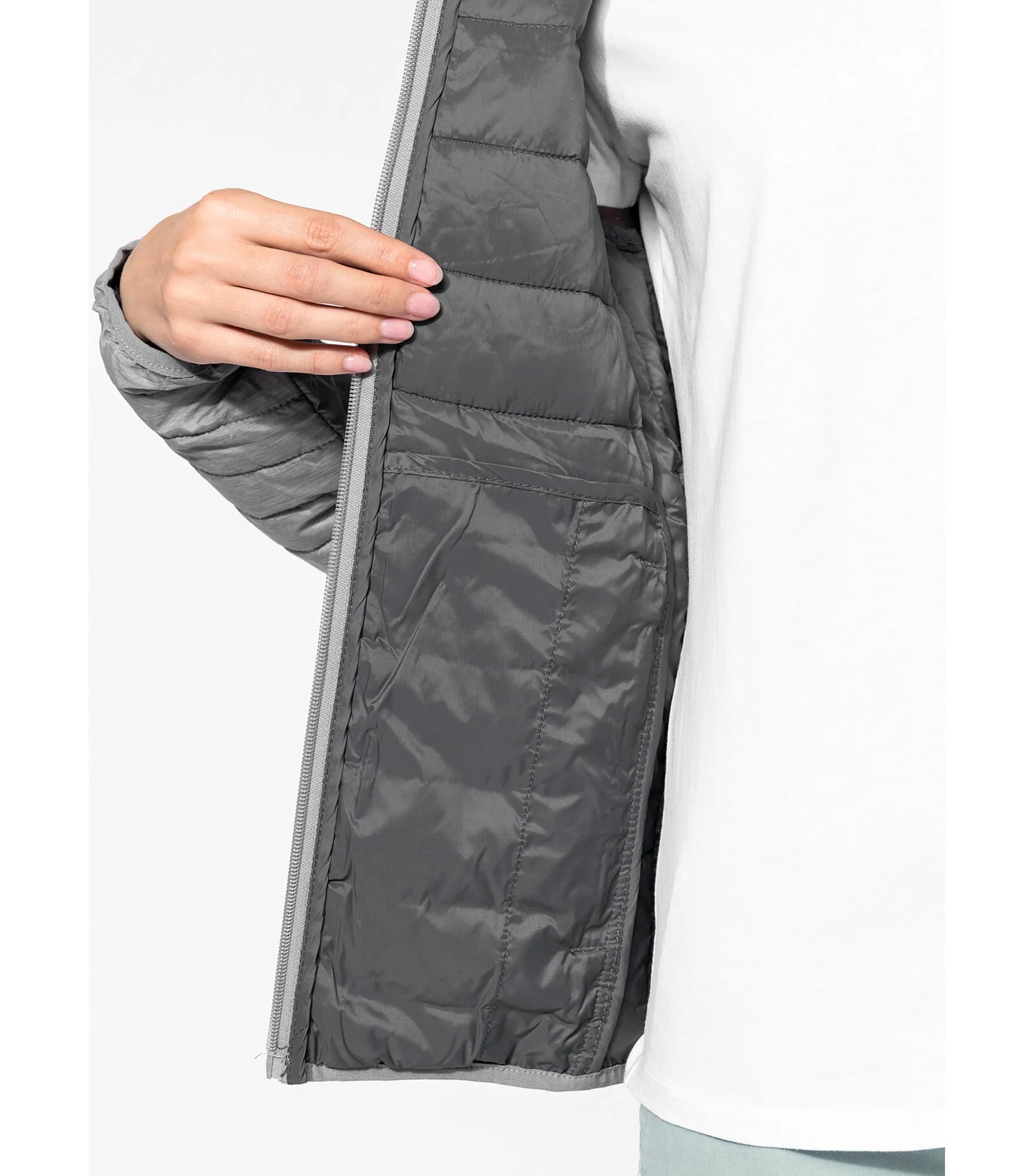 Damjacka med luva, tillverkad av polyamid. Varm och ultralätt som kan komprimeras i sin förvaringspåse. Två sidfickor med dragkedja.