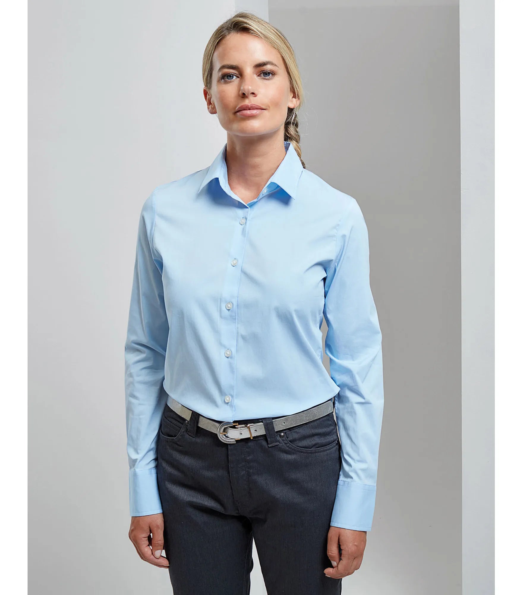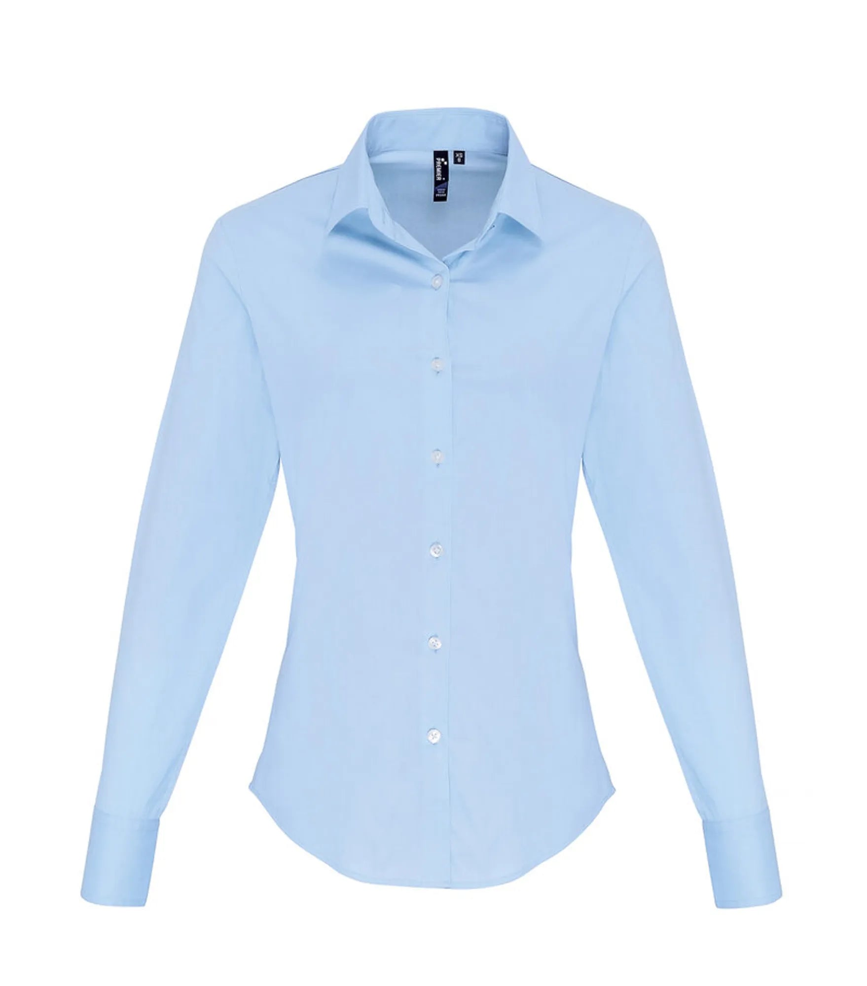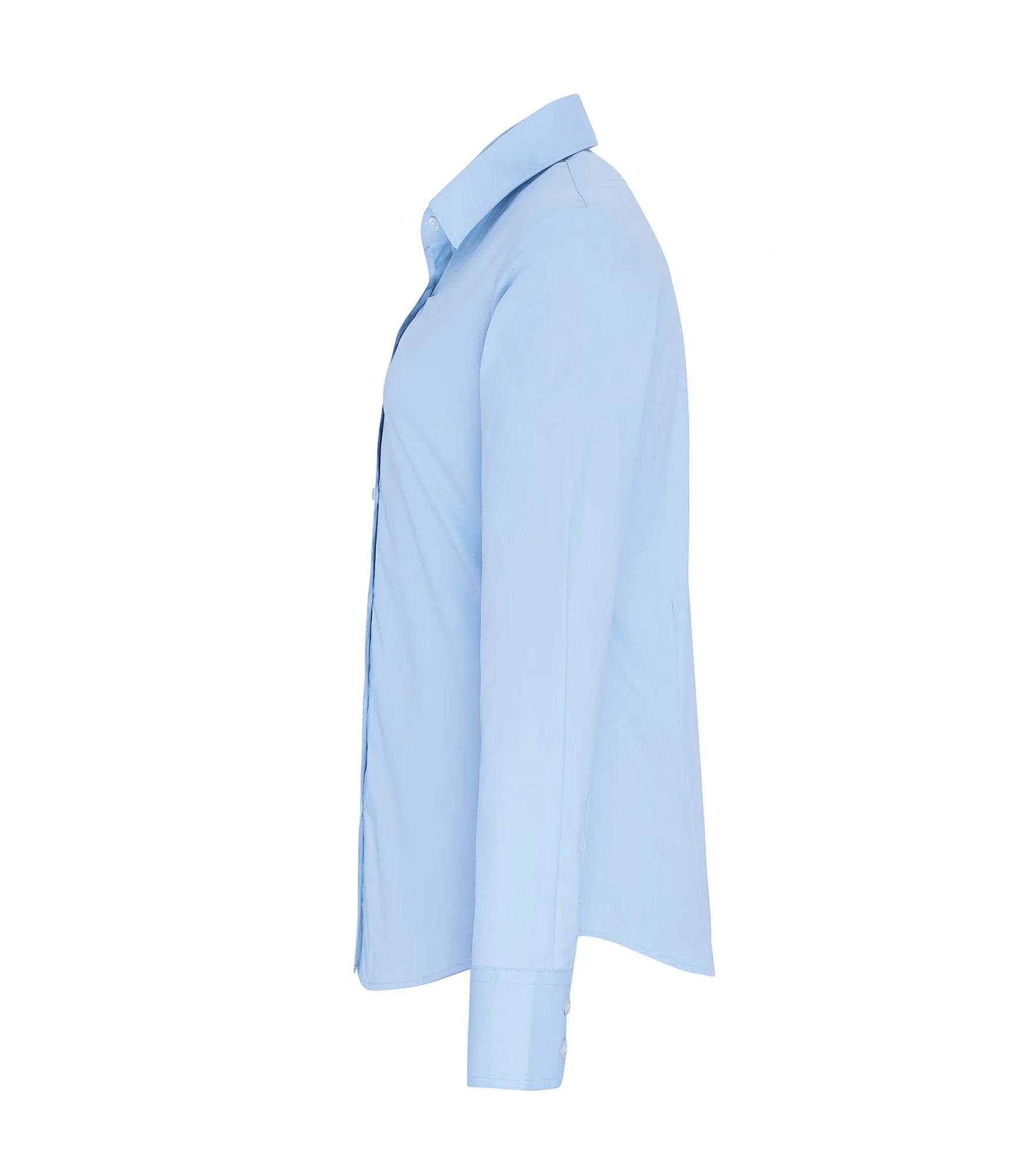 Poplin skjorta för kvinnor, tillverkad av bomull i kombination med elastan vilket ger en supermjuk, stretchig och bekväm passform. Figursydd. Sömlös knappslå. Dubbla knappar på manschetten och ett ärmskydd med en knapp. Mjuk utskuren krage med toppknapp.