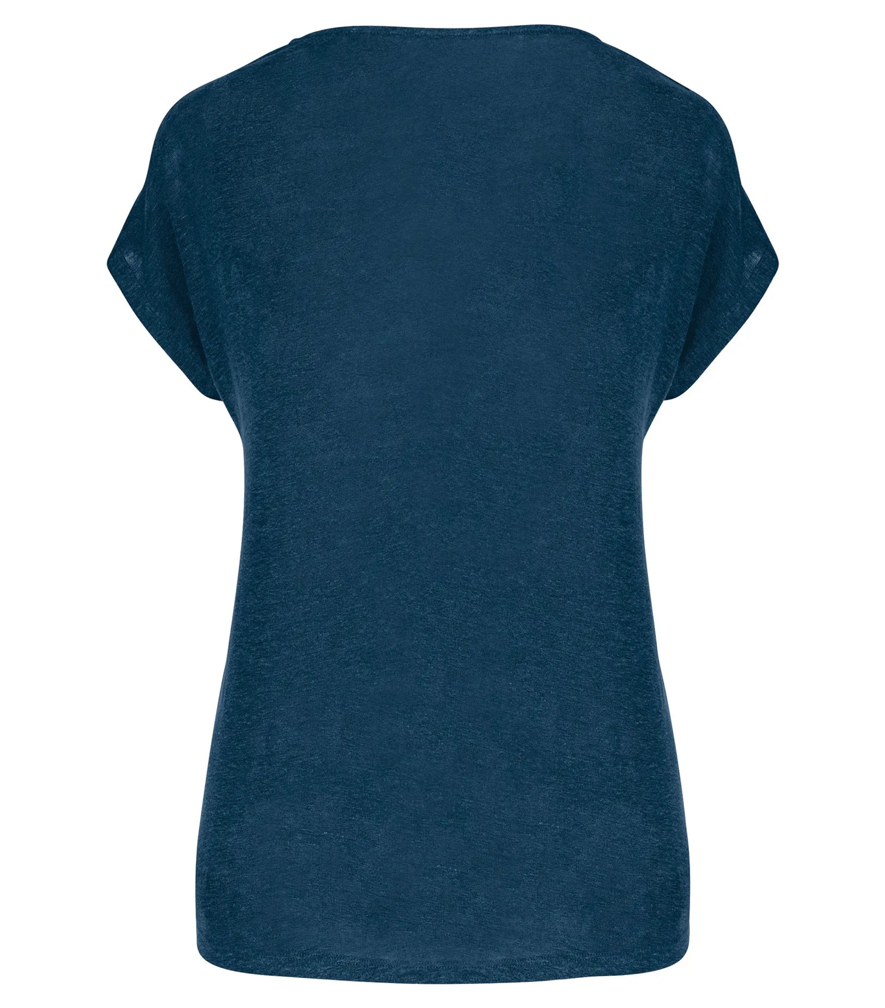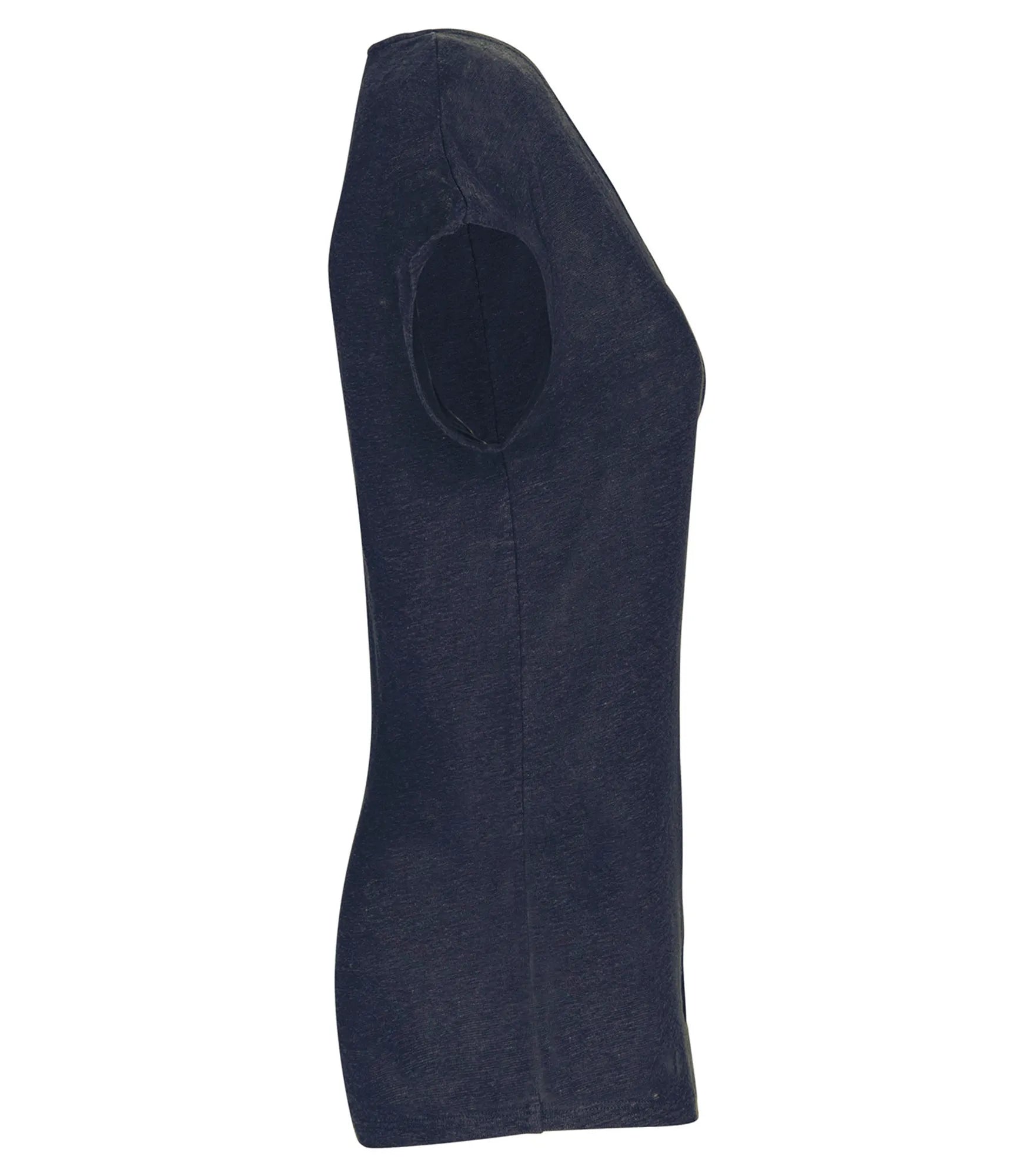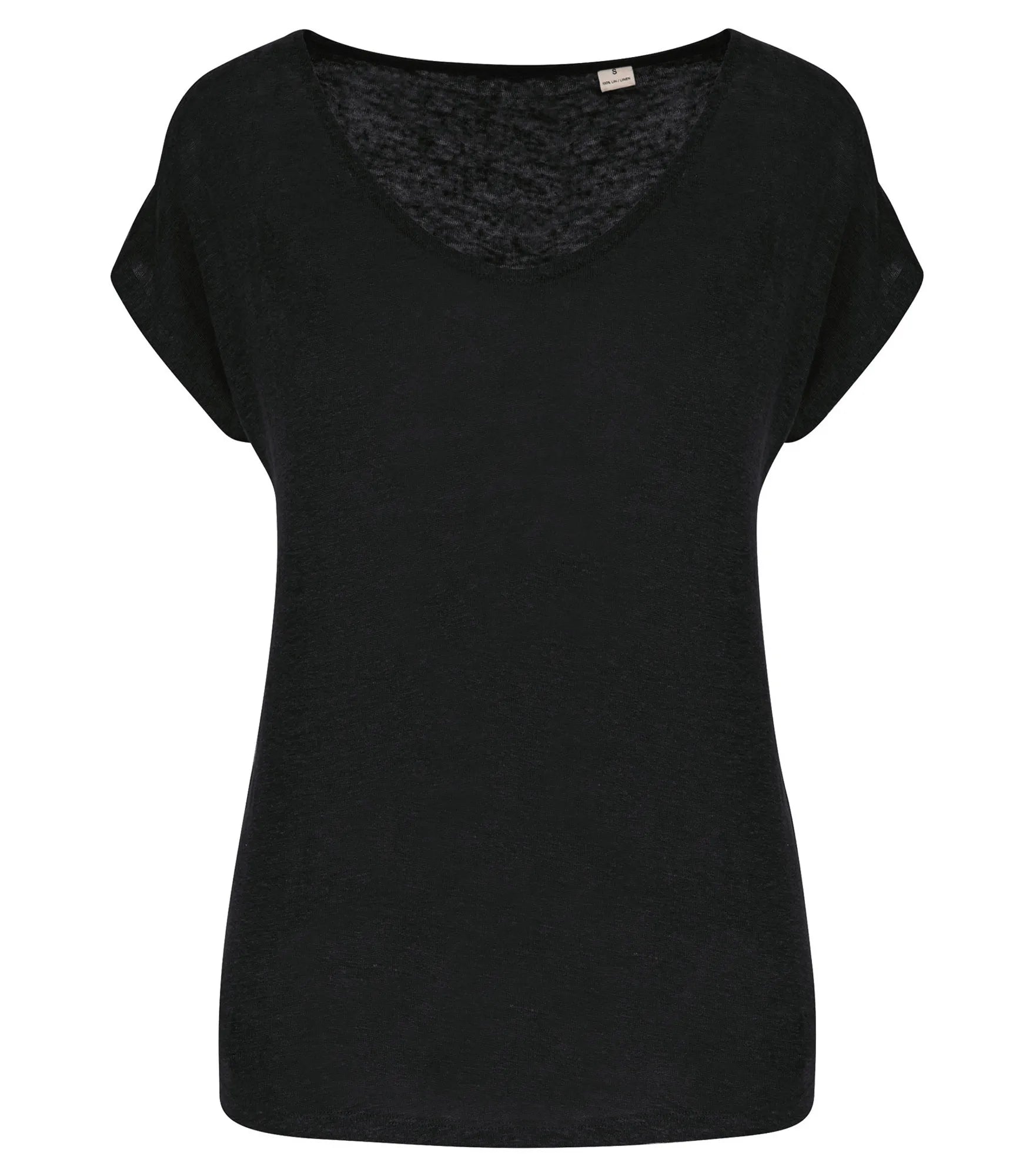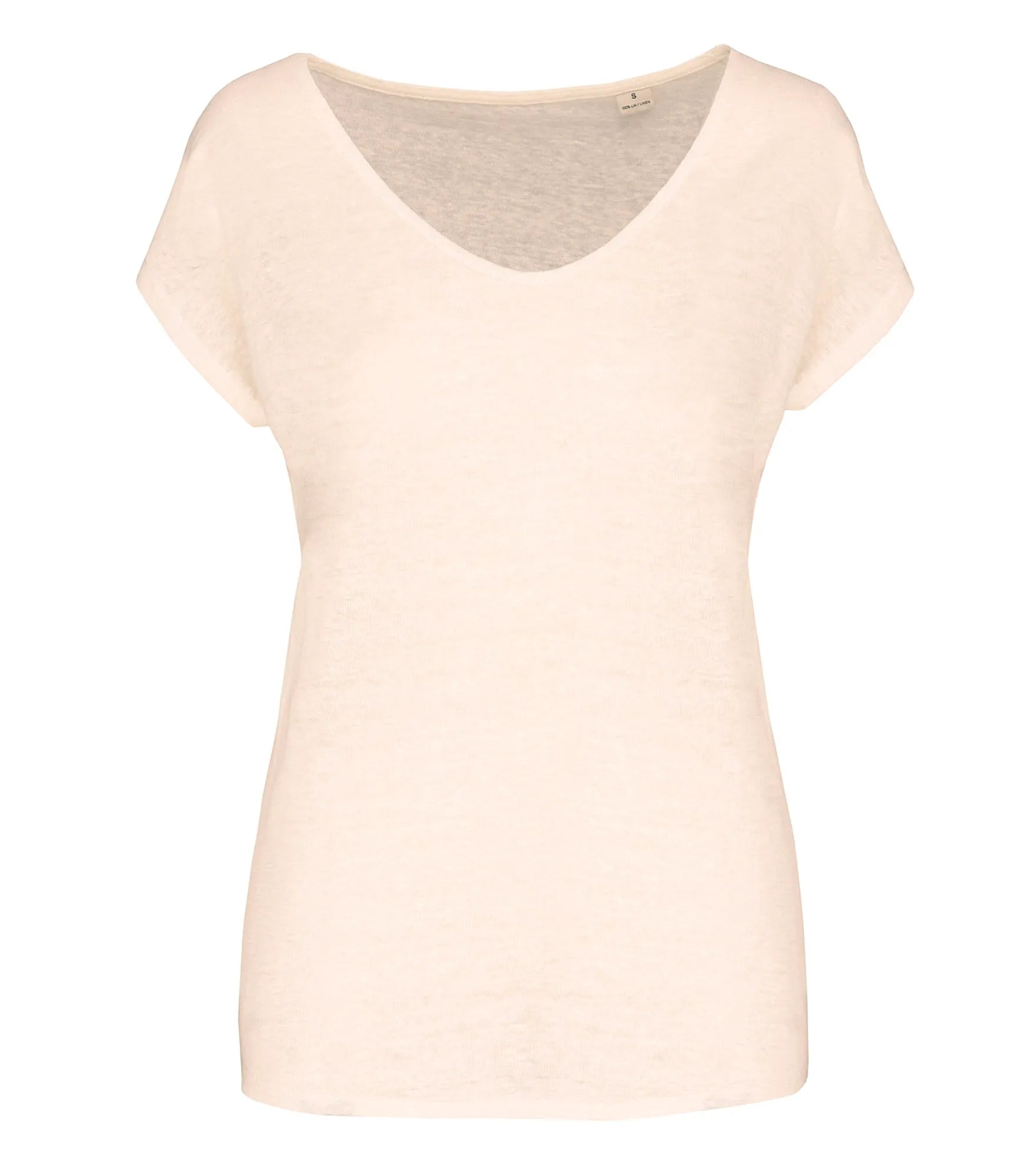 V-ringad t-shirt för dam tillverkad av 100% linne. Rak modell. Sidosömmar. Tejpad hals. Dubbla översömmar på ärmslut och nederkant. Satintejp på axlarna så att plagget kan hängas på en klädhängare. Ingen märkesetikett i nacken, endast storleksetikett för enkelt byte av varumärke.