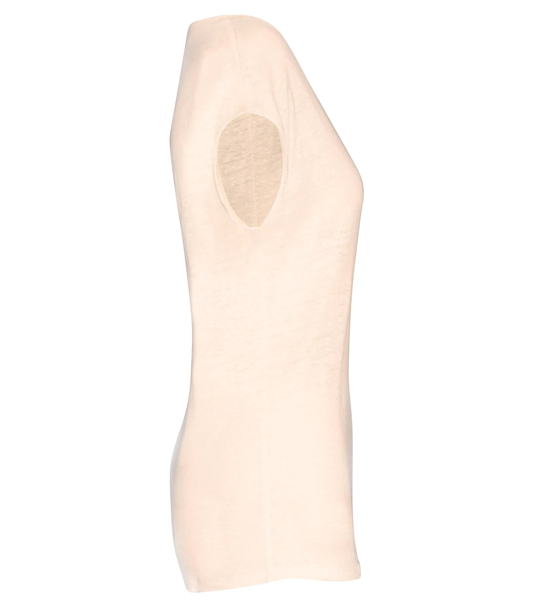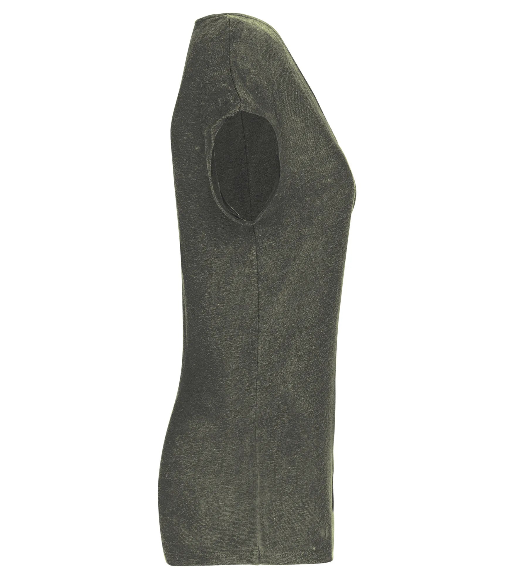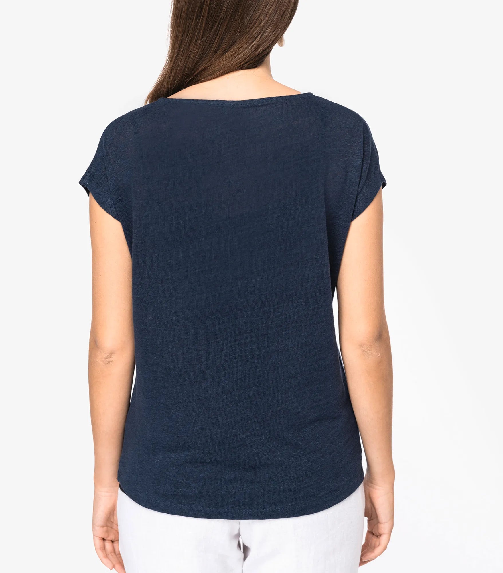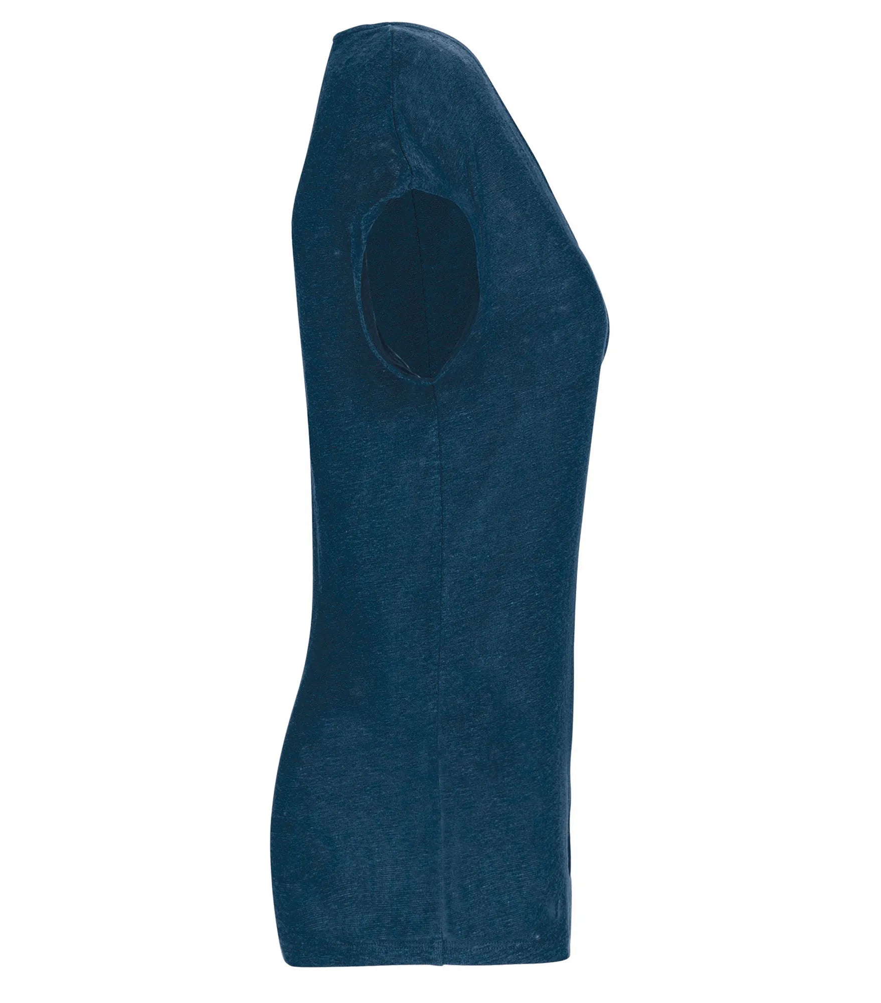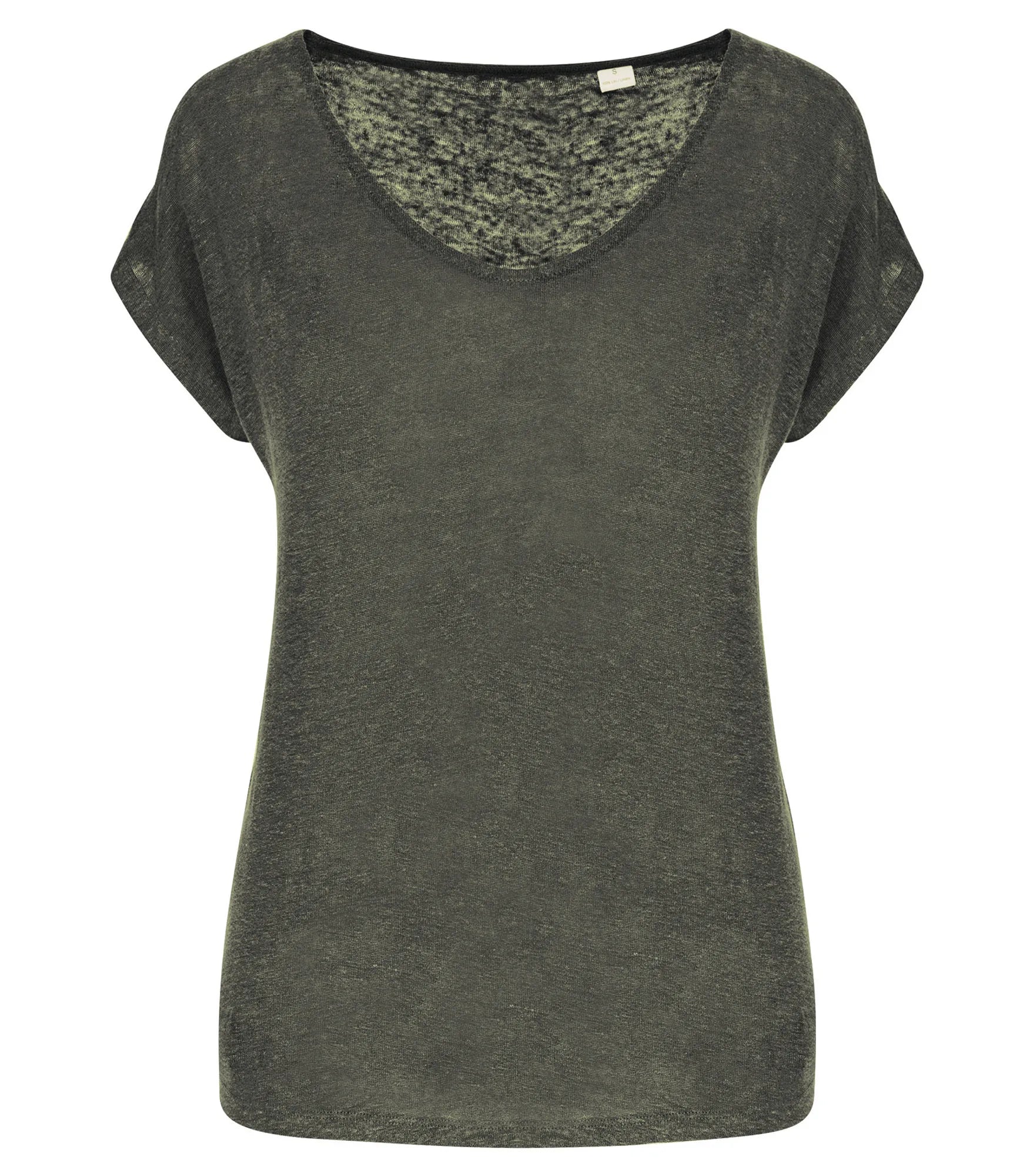 V-ringad t-shirt för dam tillverkad av 100% linne. Rak modell. Sidosömmar. Tejpad hals. Dubbla översömmar på ärmslut och nederkant. Satintejp på axlarna så att plagget kan hängas på en klädhängare. Ingen märkesetikett i nacken, endast storleksetikett för enkelt byte av varumärke.