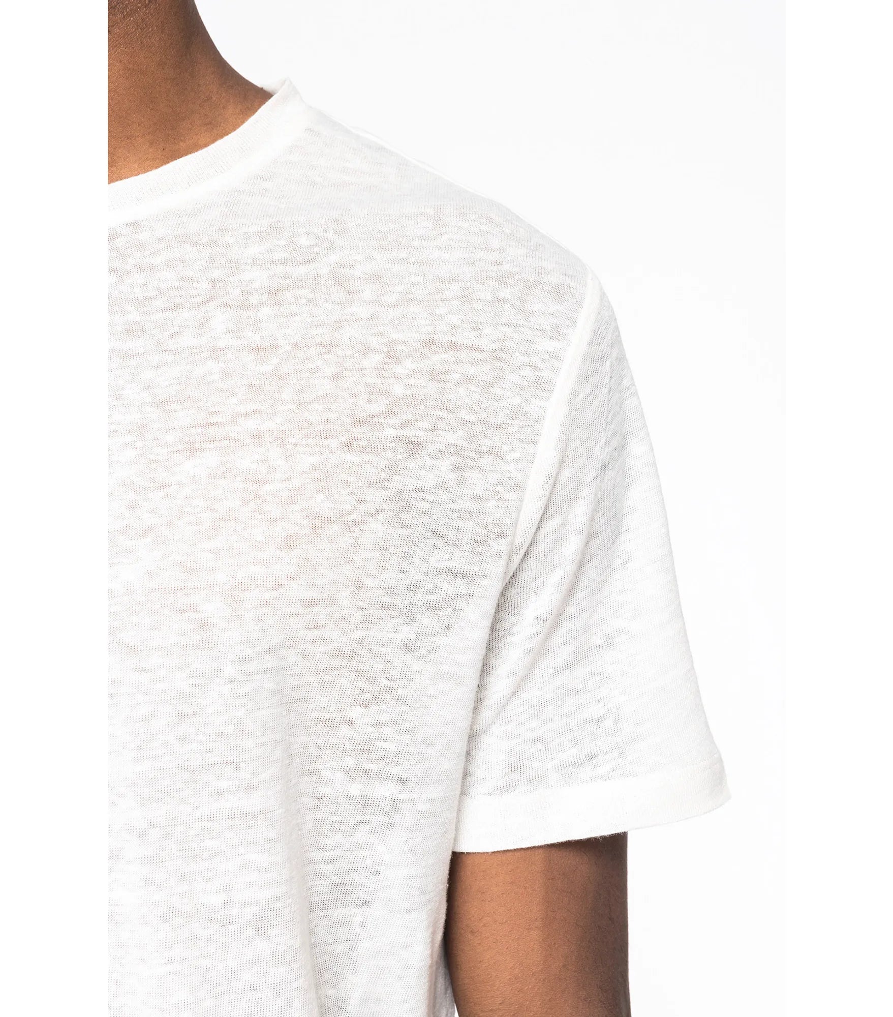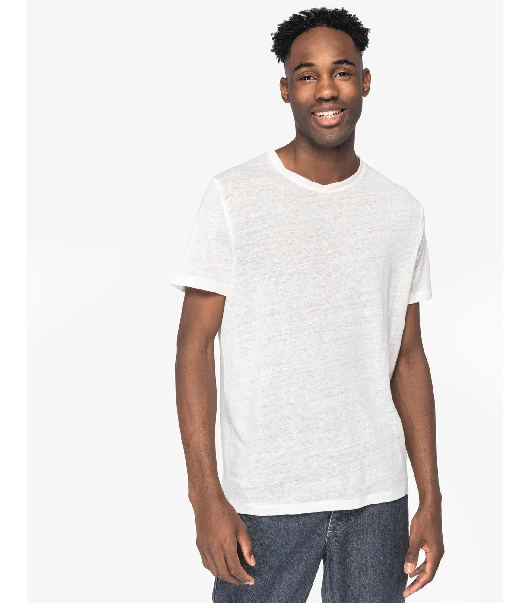 T-shirt tillverkad av 100% linne. Rak modell. Sidosömmar. Tejpad hals. Dubbla översömmar på ärmslut och nederkant. Ingen märkesetikett i nacken, endast storleksetikett för enkelt byte av varumärke. Finns även i dammodell NS321.