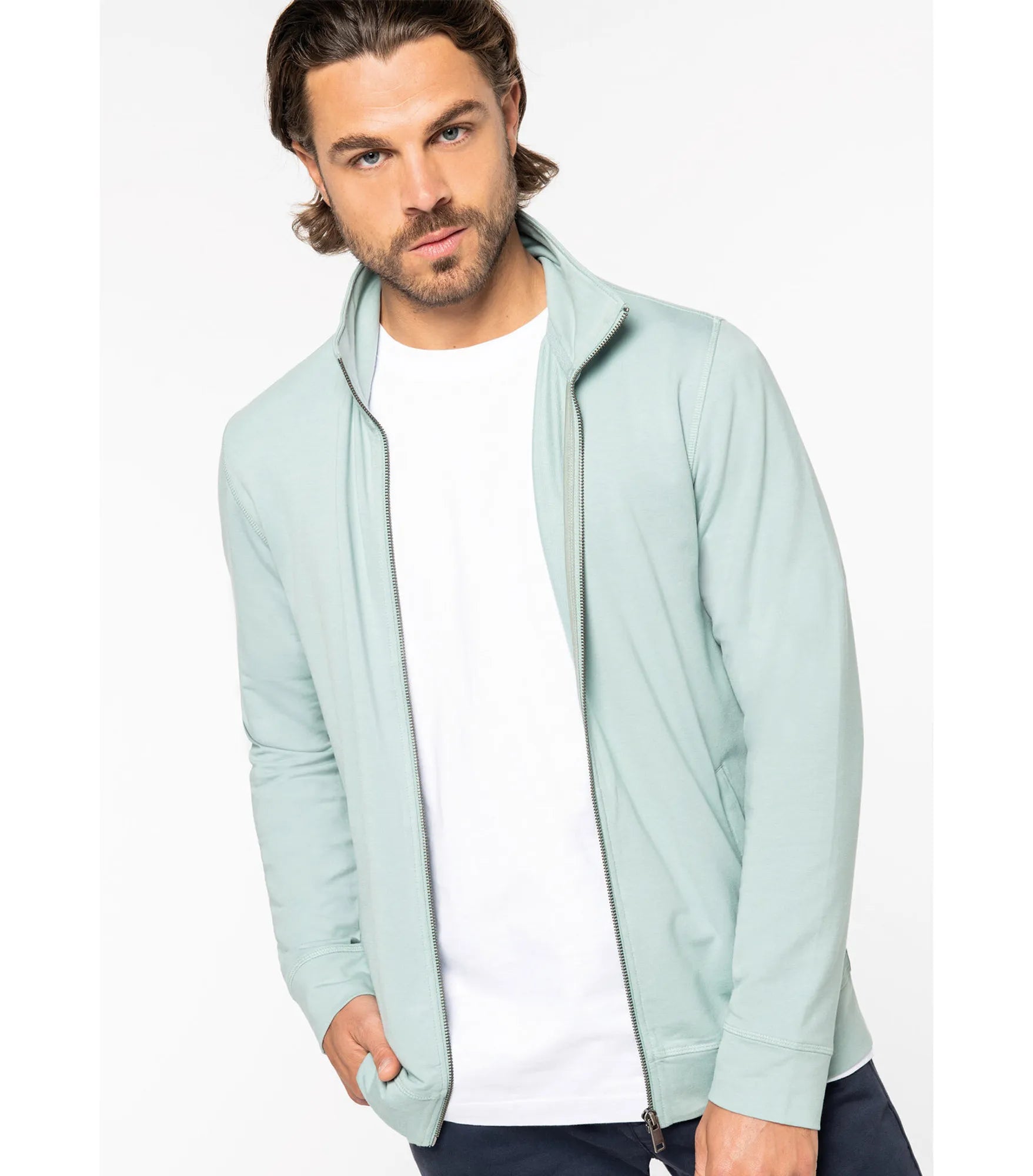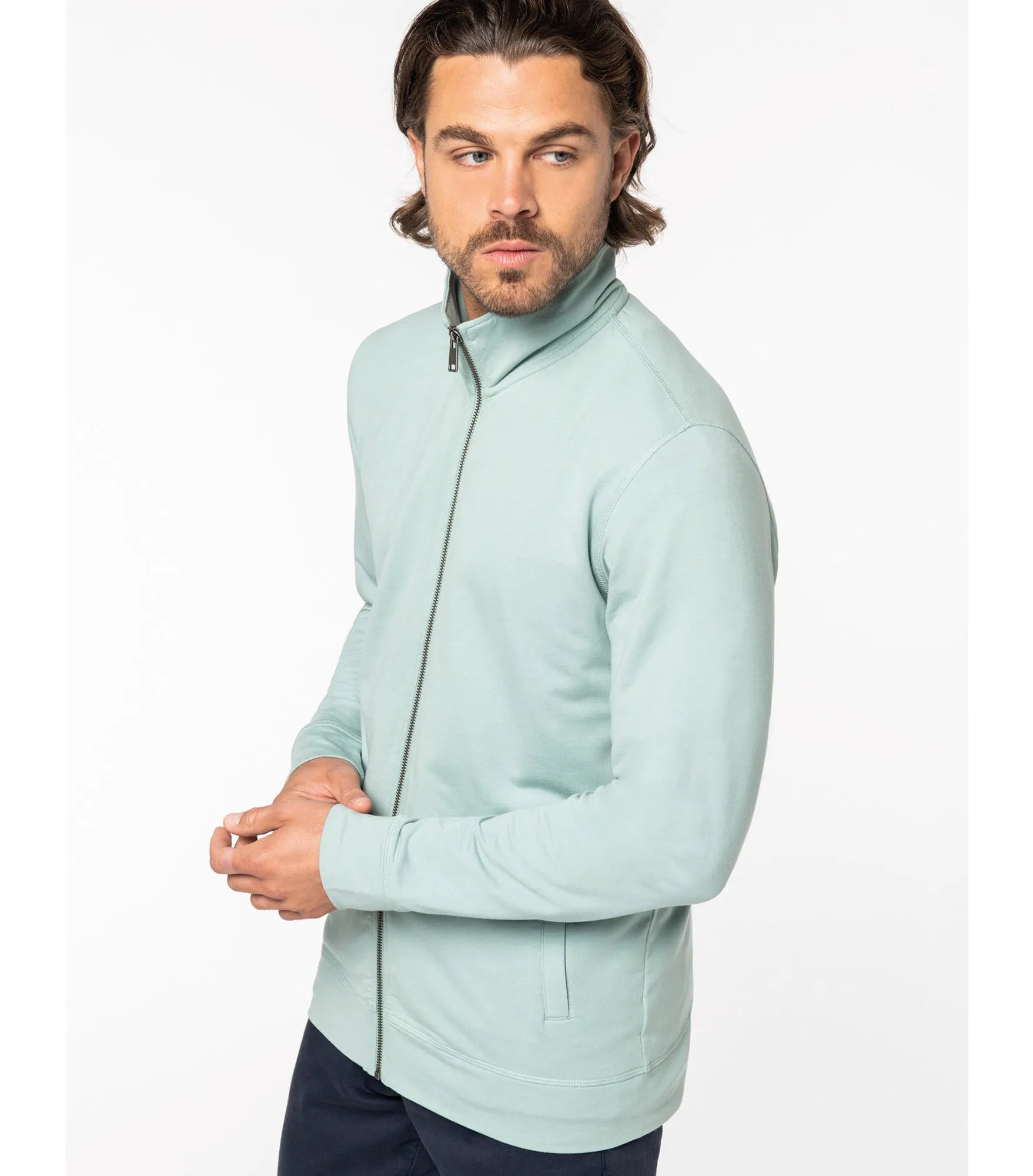 Sweatshirtjacka till herr tillverkad av TENCEL™ modal, ekologisk bomull och elastan. TENCEL™ är ett varumärke som tillhör Lenzing AG. Rak passform och hög hals. Ultramjukt tyg. Halvmåne bak och inre tejpad hals för ökad komfort. 2 frontfickor. Dragkedja i återvunnen metall. Dubbla översömmar på ärmslut, ärmhål och nederkant. Mudd i nederkant och på ärmslut.