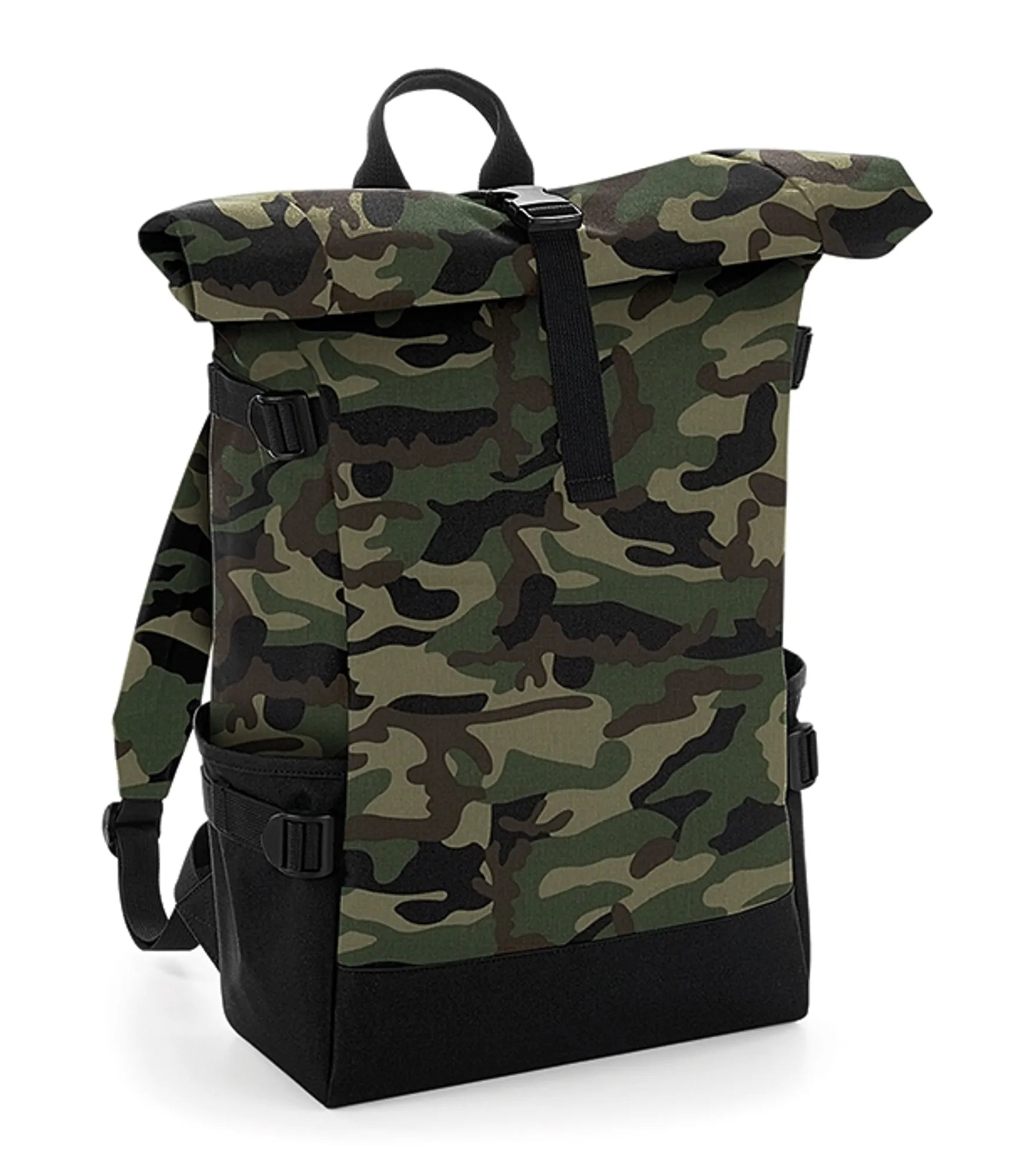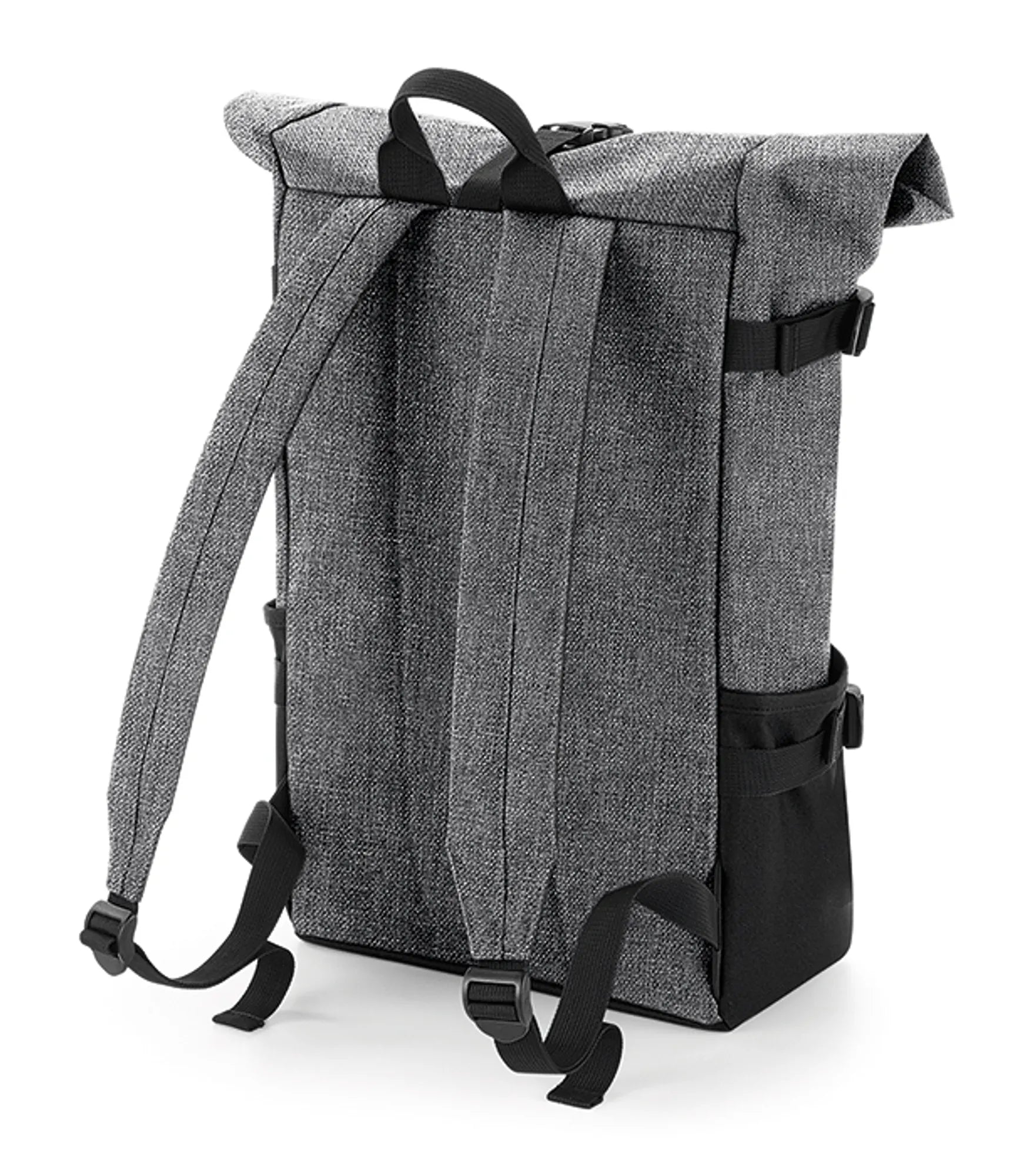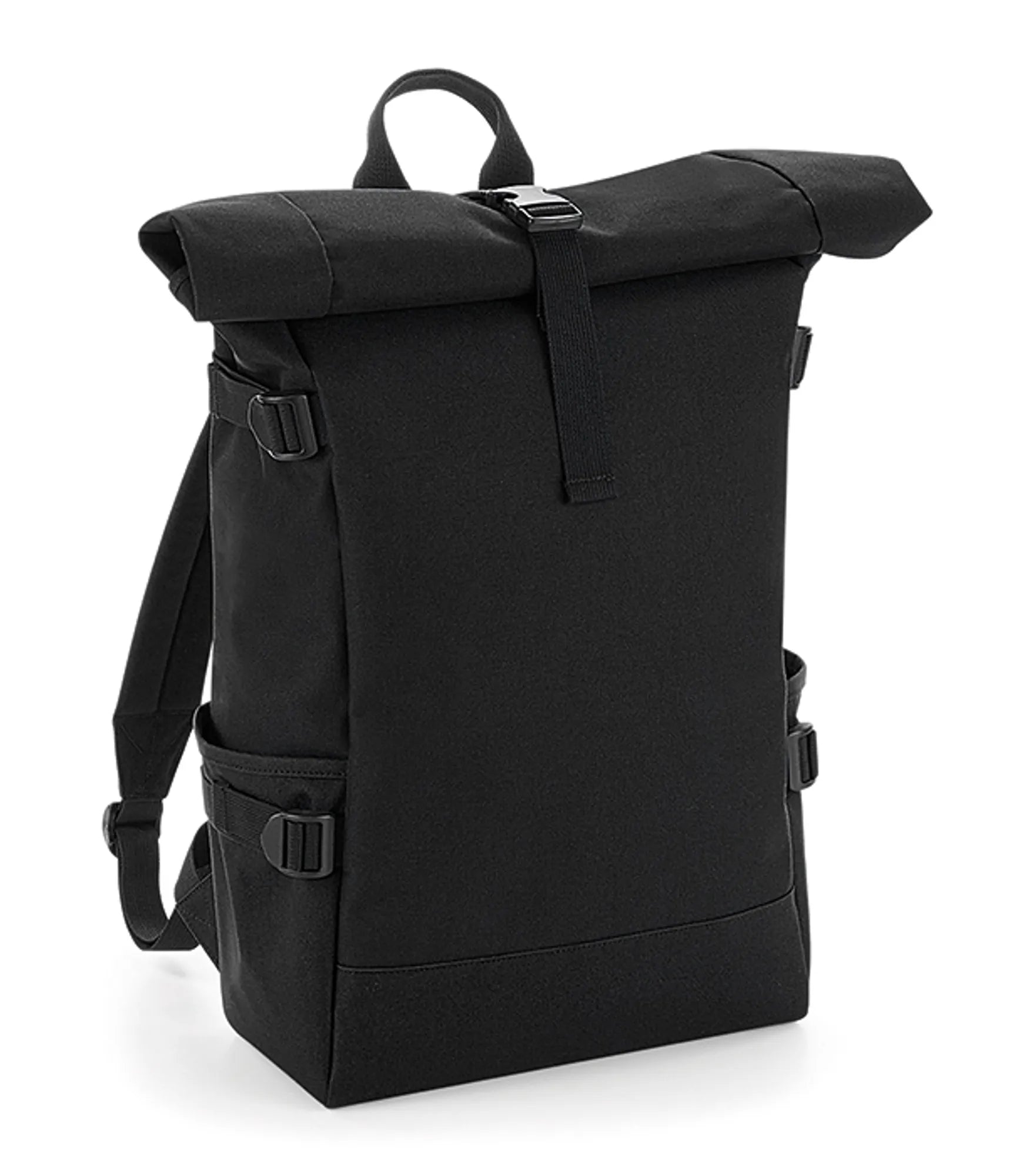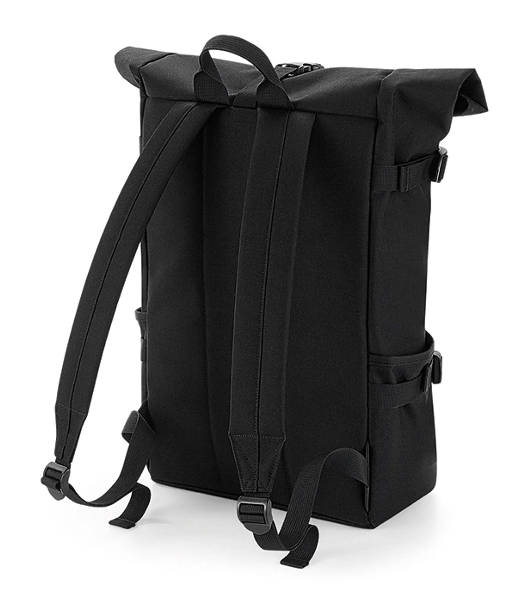 Backpack with roll-top closure. Spacious main compartment with padded pocket for a 17” laptop. Inner pockets with zipper closure. Compression straps. Padded back and adjustable, padded shoulder straps. Carrying handle. Rebrandable.