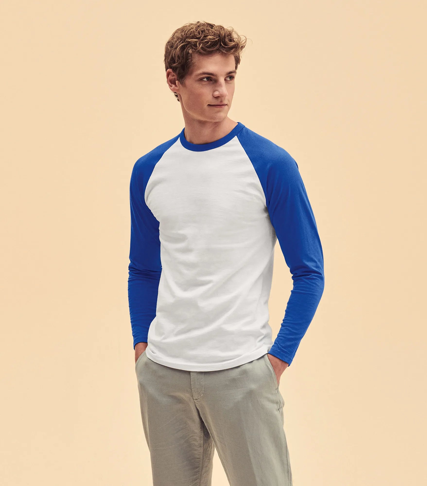 Long-sleeved T-shirt with contrasting colors on the sleeves and neckline. Classic fit.