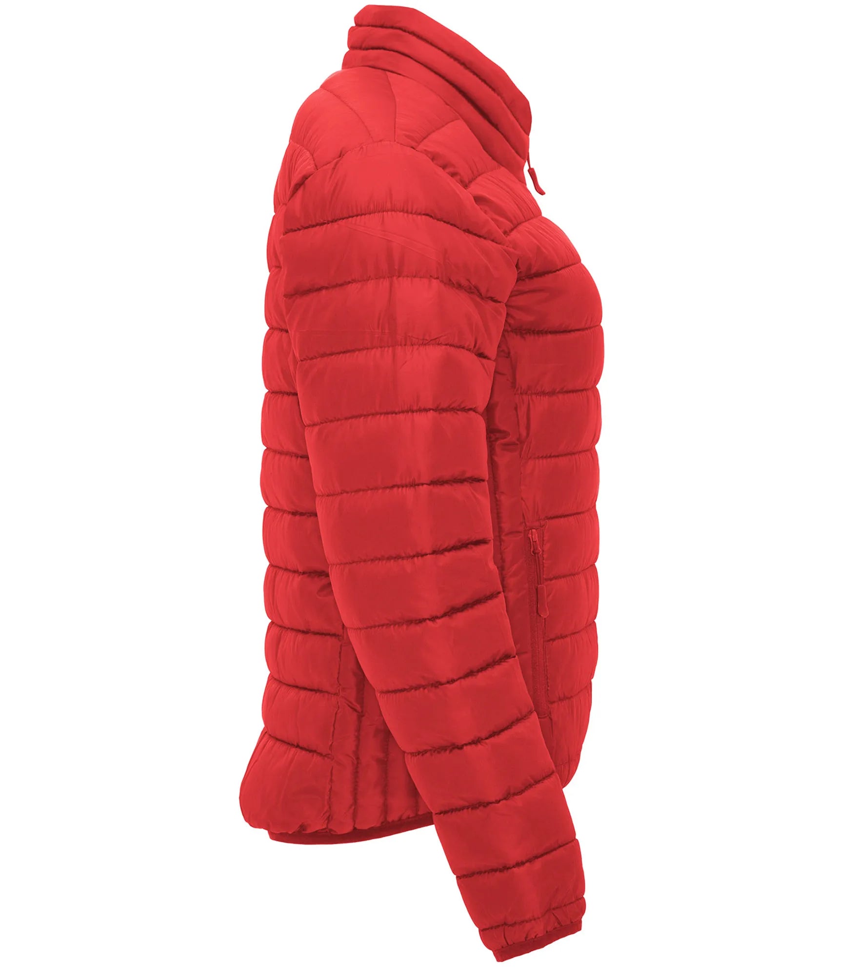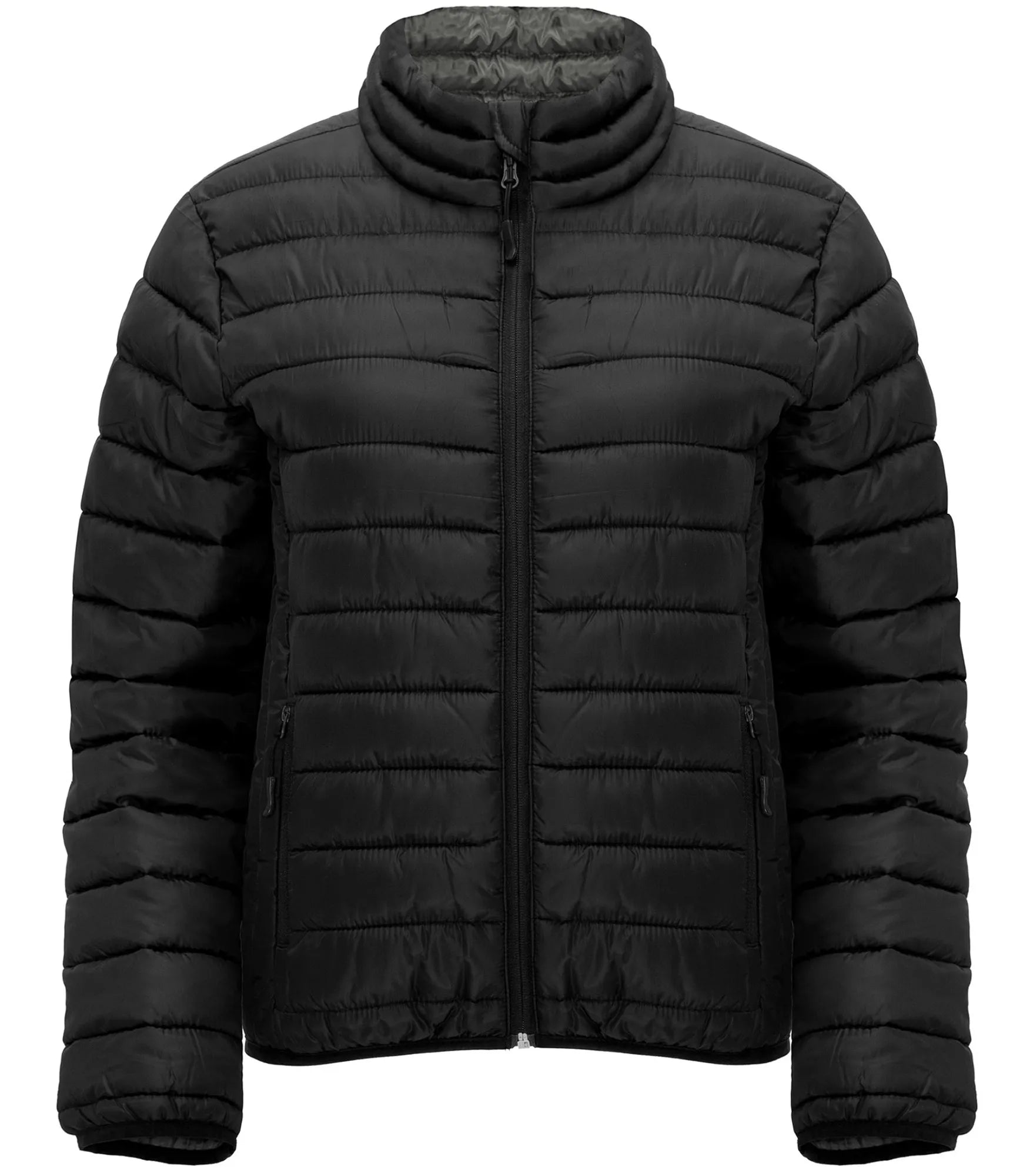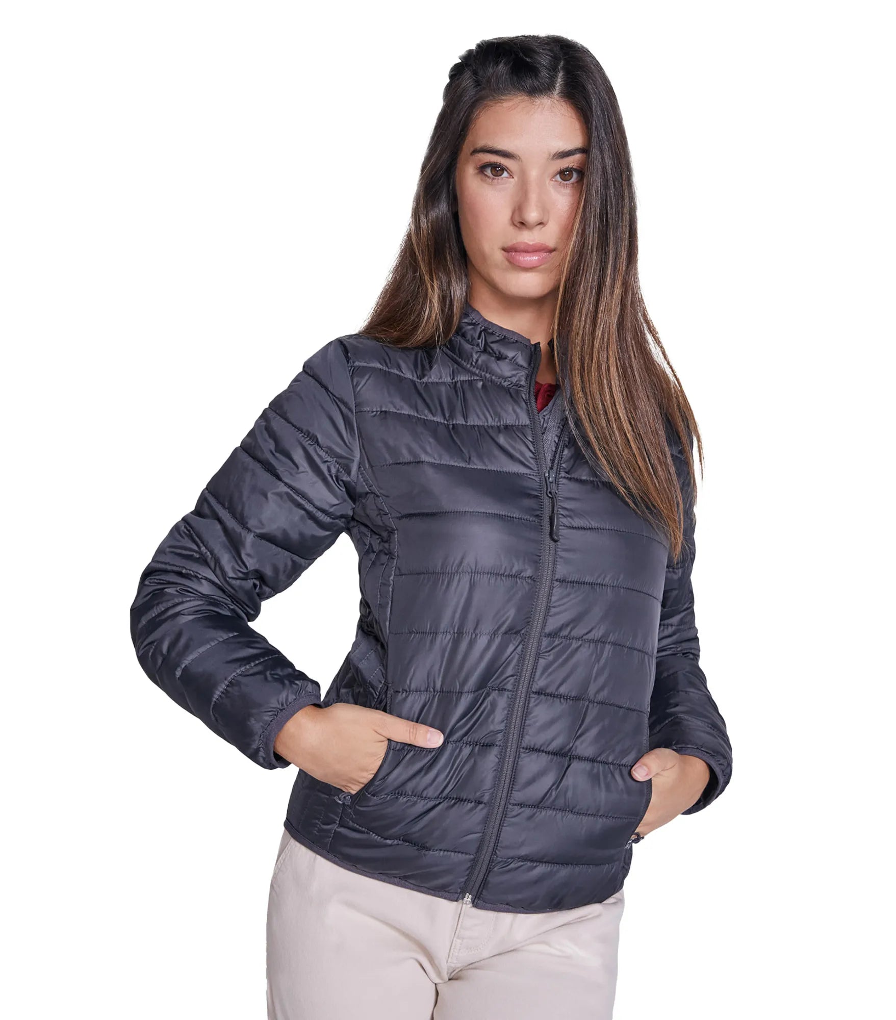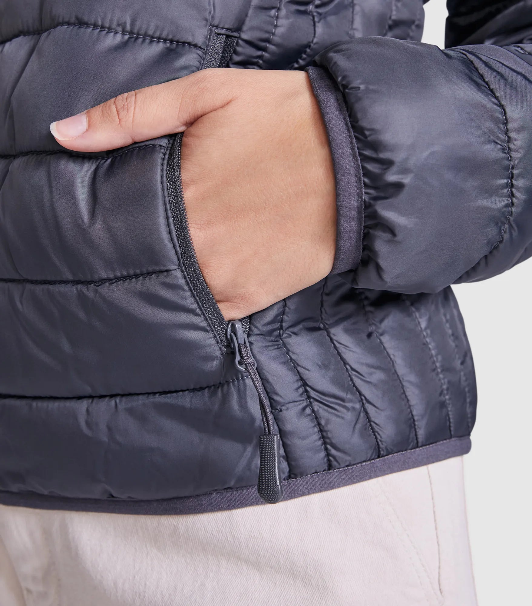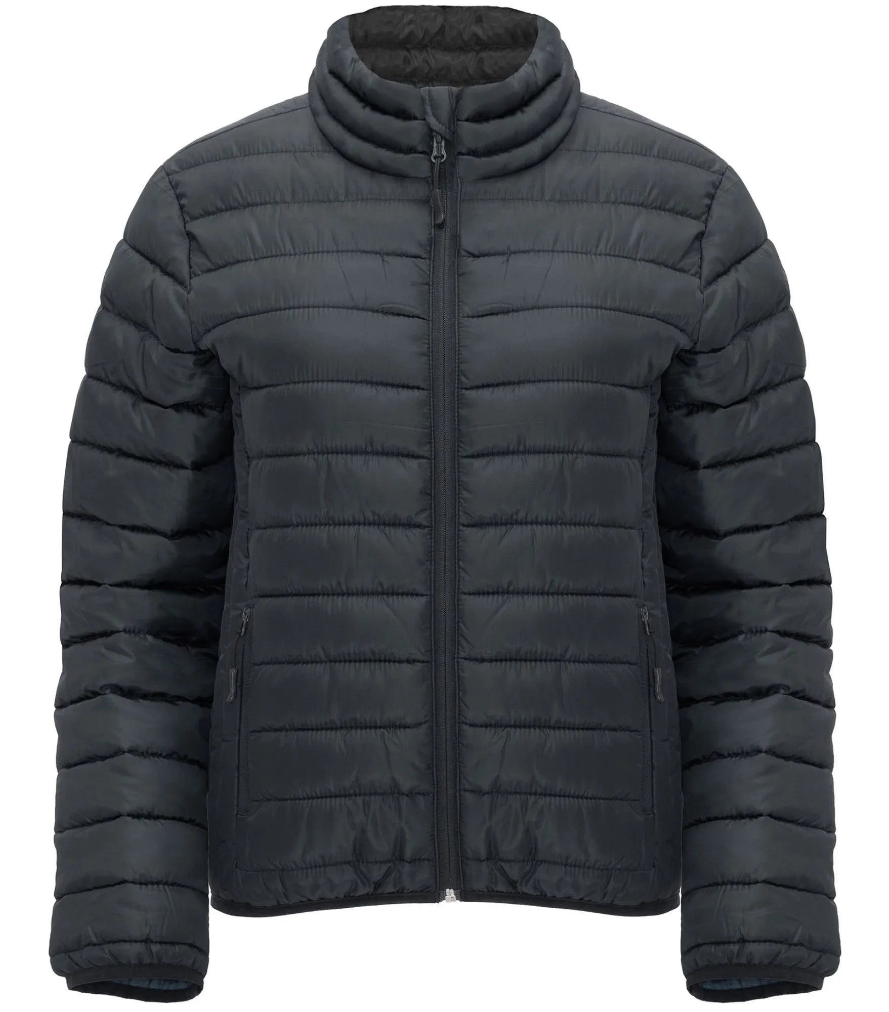 Quilted jacket with featherlight padding, in a fitted silhouette for women. Light and foldable in water-repellent and windproof material. High collar without hood. Inverted zippers with matching chin guard and zipper pull. Two side pockets with zipper. Matching elastic trim at cuffs and hem. Contrasting colored inner lining. Removable label.