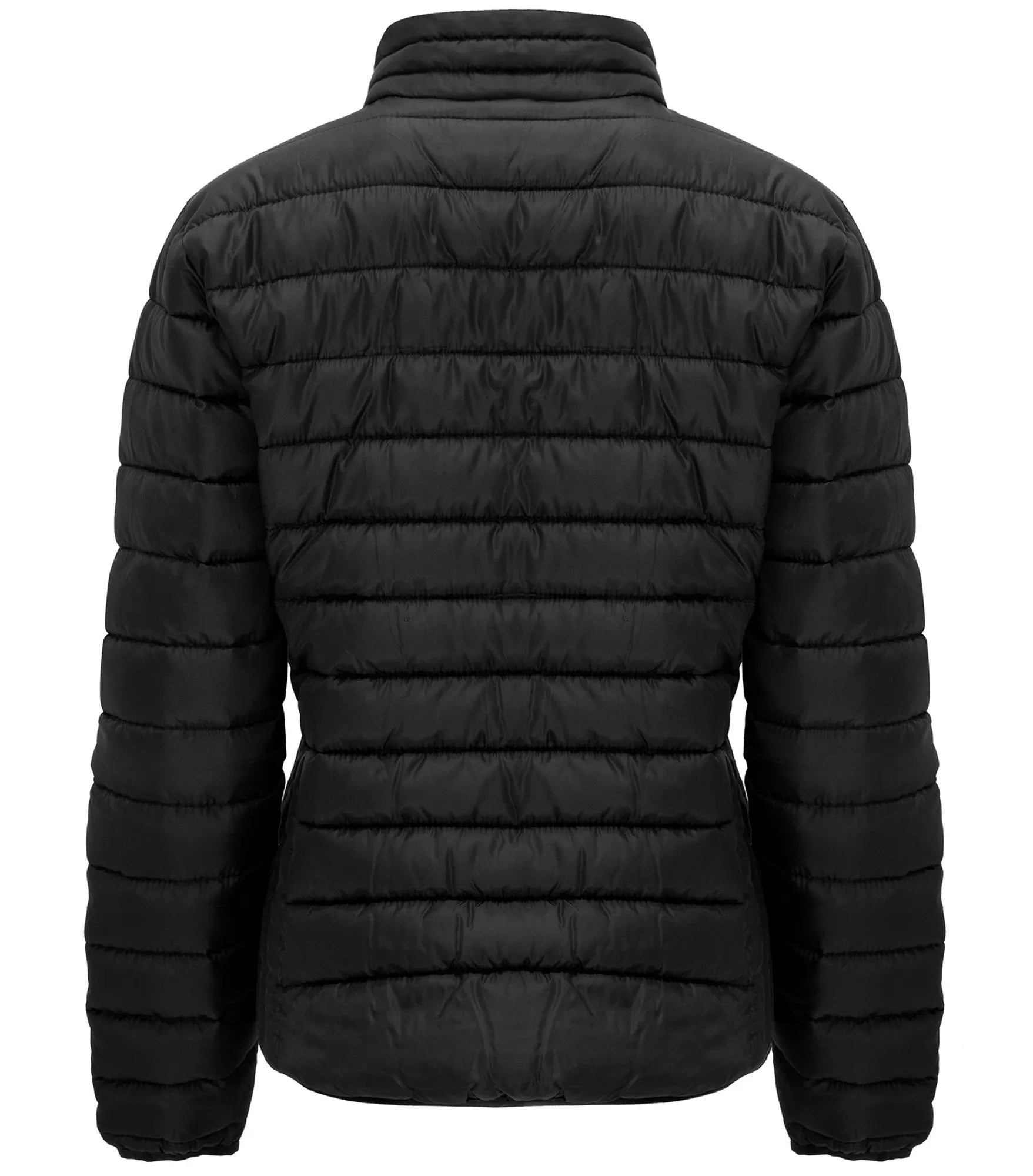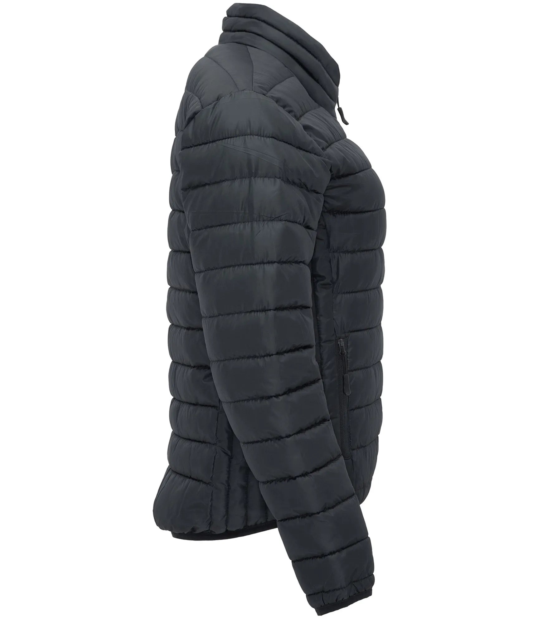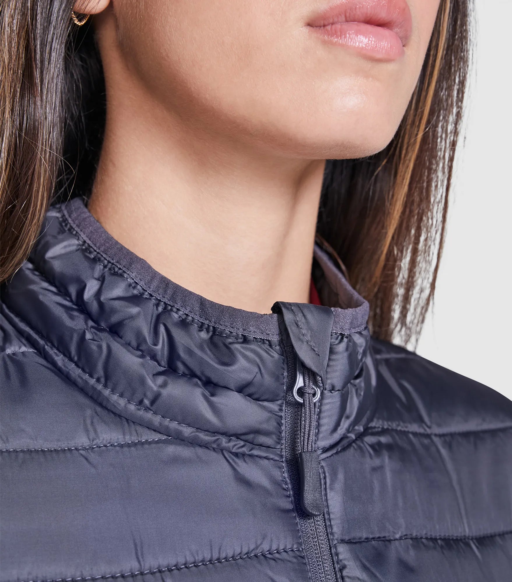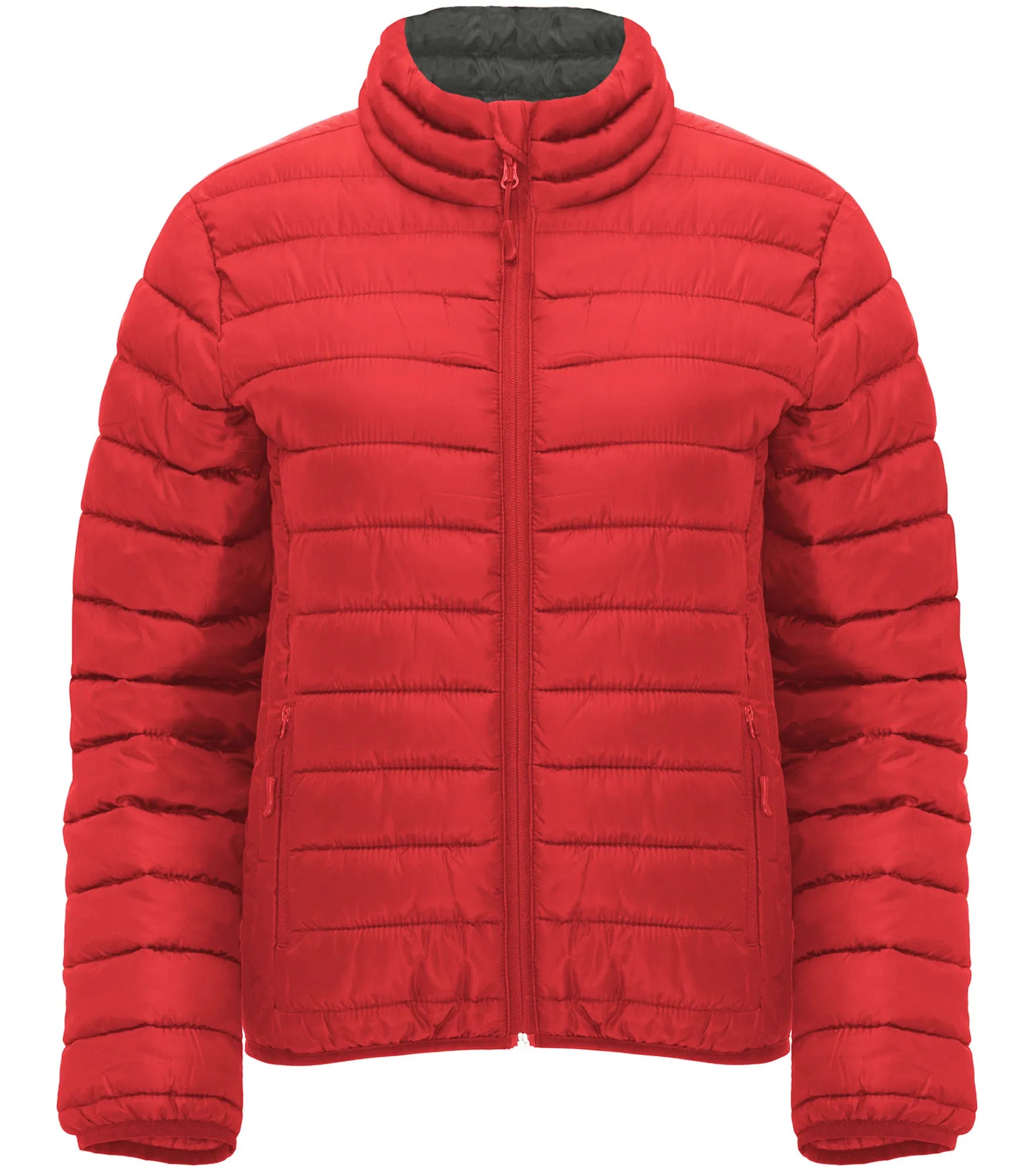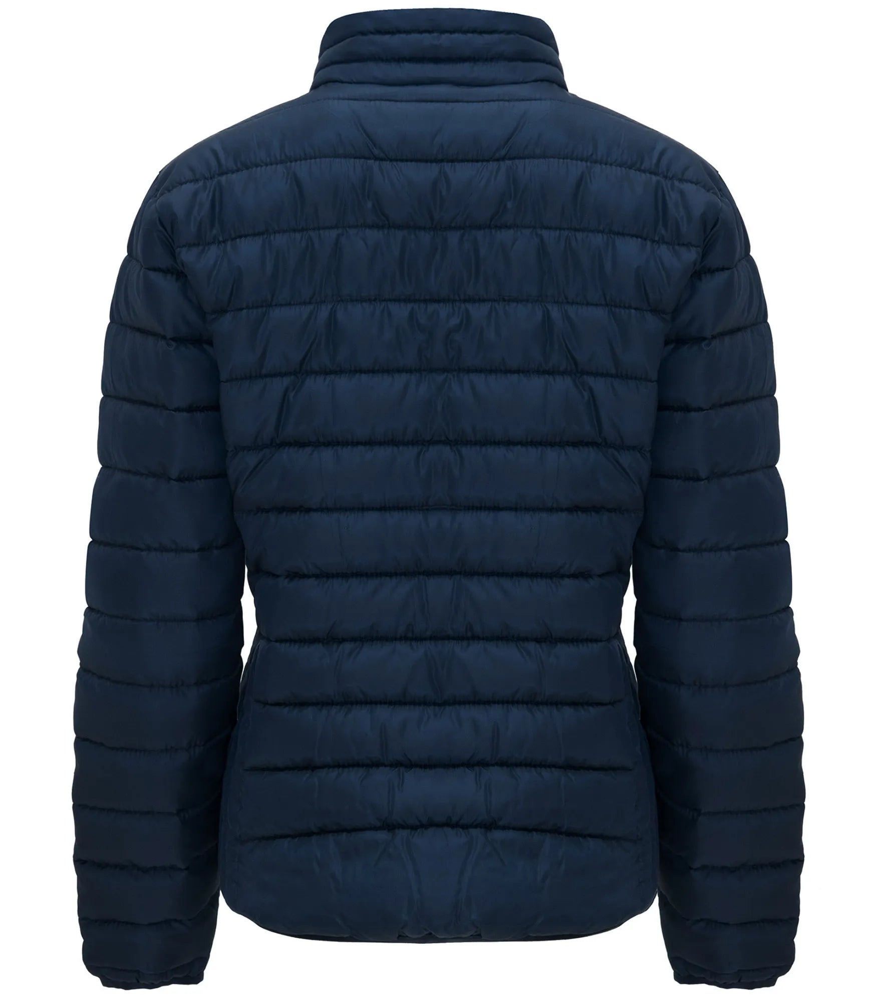 Quilted jacket with featherlight padding, in a fitted silhouette for women. Light and foldable in water-repellent and windproof material. High collar without hood. Inverted zippers with matching chin guard and zipper pull. Two side pockets with zipper. Matching elastic trim at cuffs and hem. Contrasting colored inner lining. Removable label.