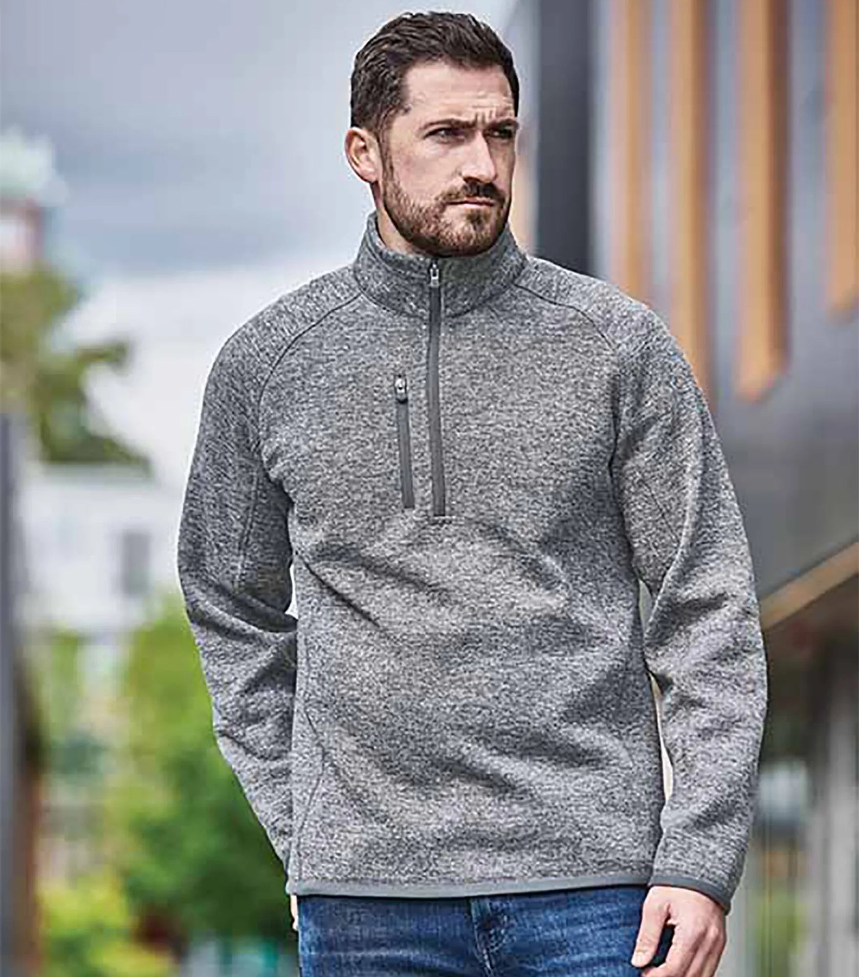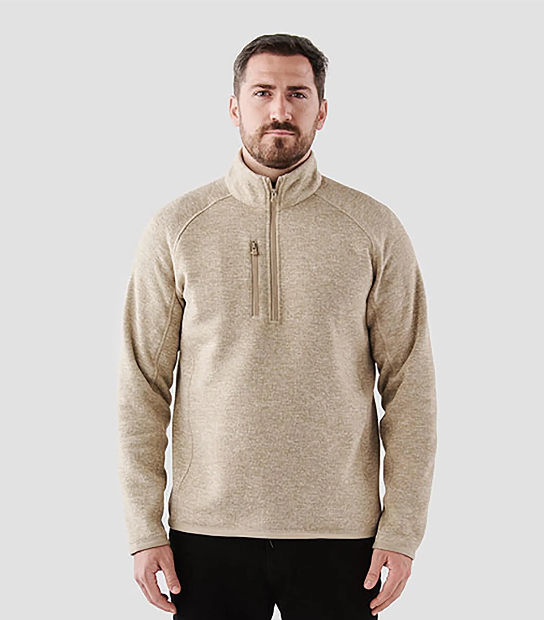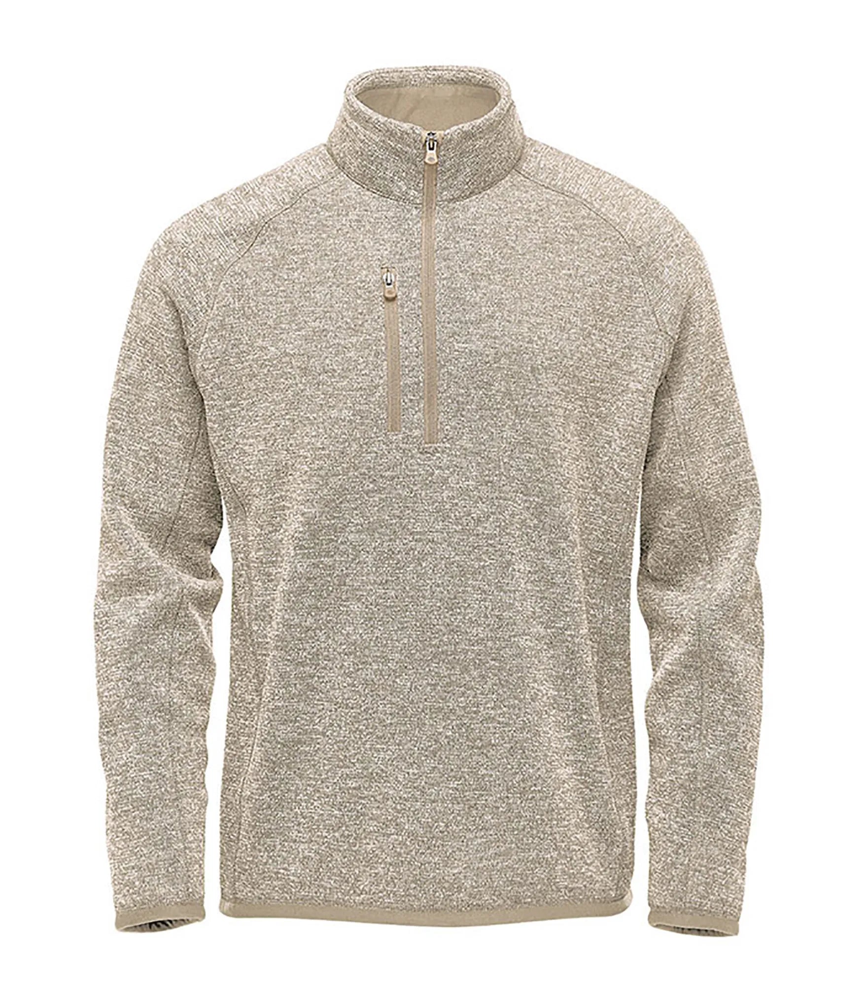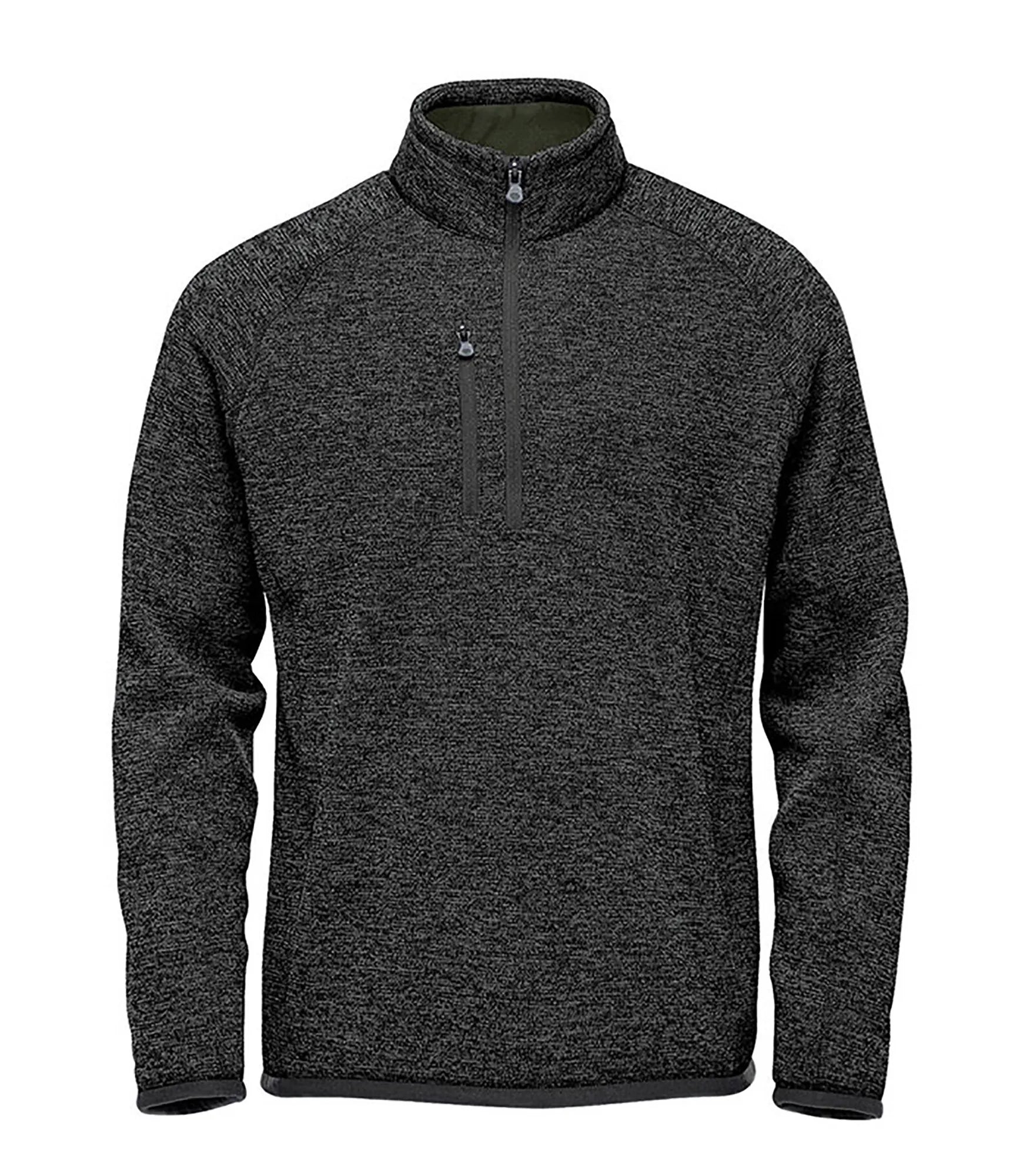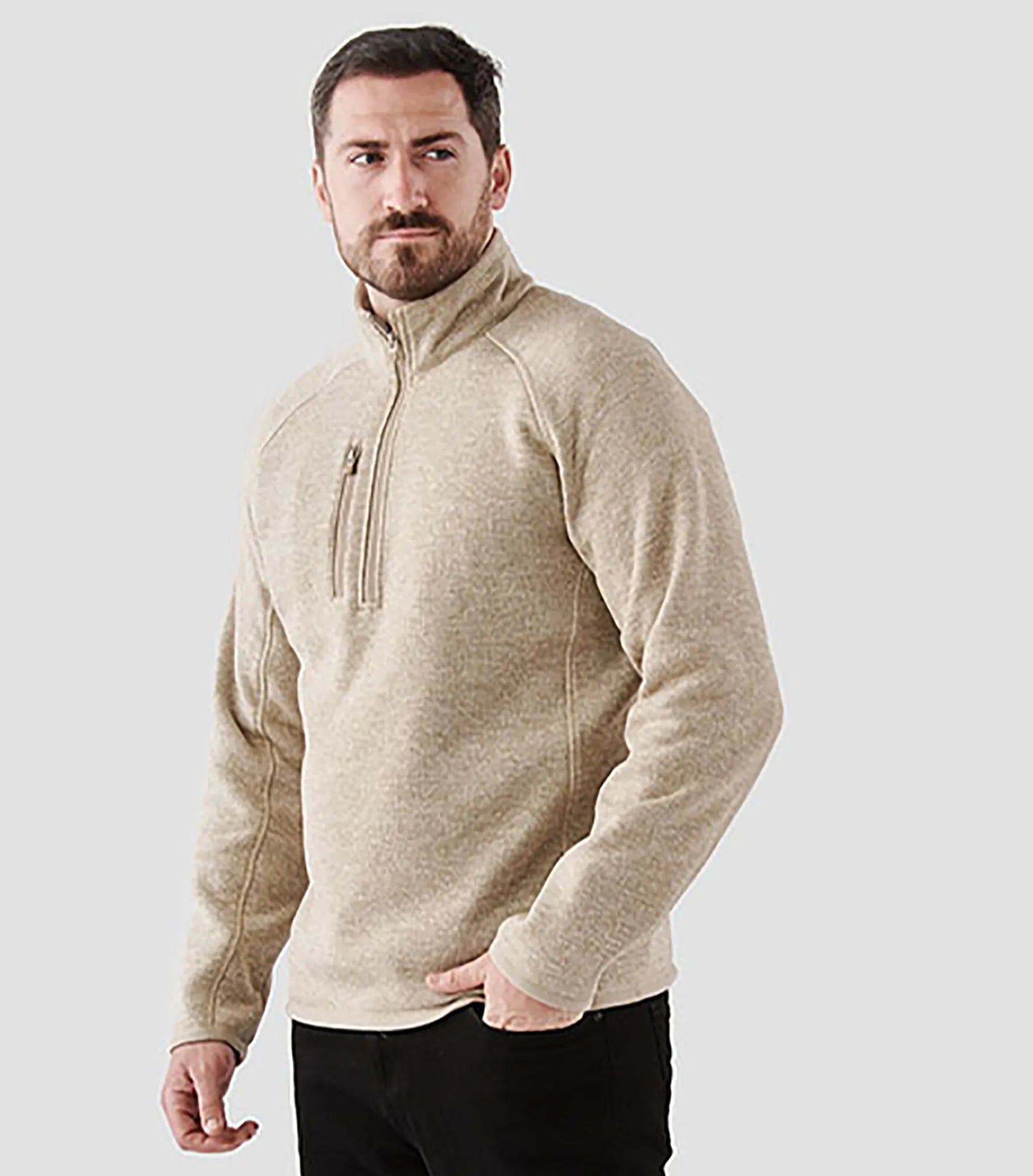 Fleece sweater with extended ¼ zipper for men. Brushed interior. Lined collar, cuffs and hem. Color-matching edge tape on sleeve cuffs and hem. Flatlock seams. Raglan sleeves for better freedom of movement. Pocket with zipper on chest. Chin guard. Made with recycled polyester for reduced environmental impact.