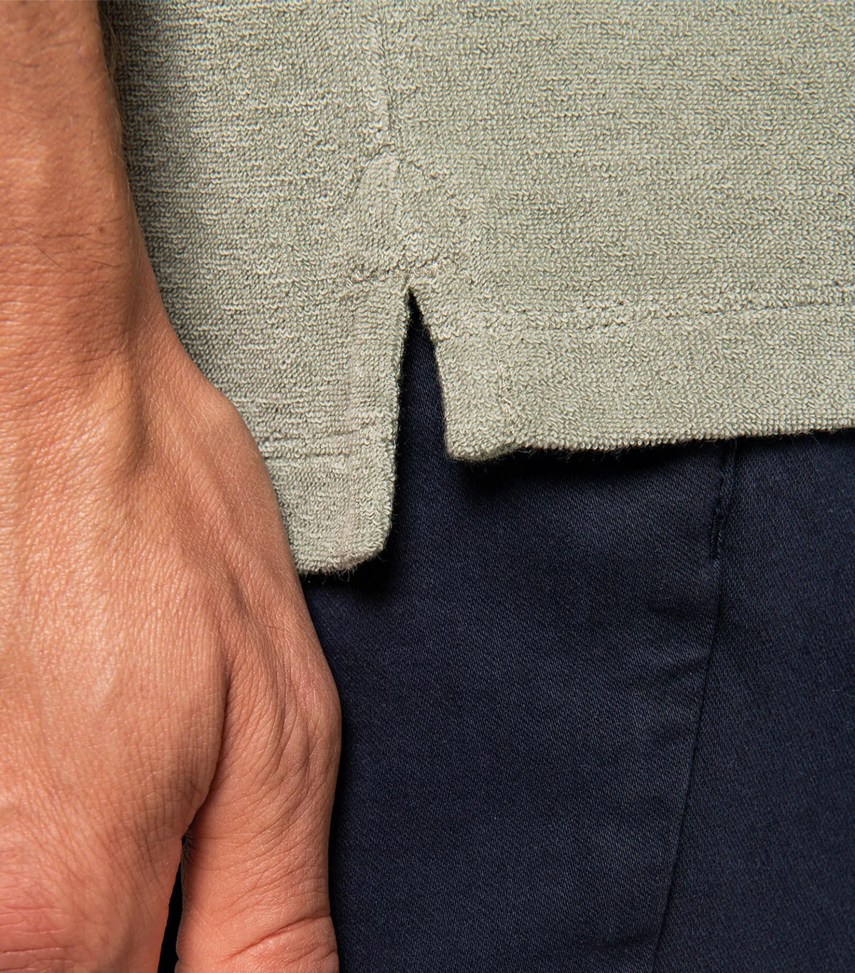 Men's piqué sweater made of terry material. Straight fit. The product is washed after assembly, so colors may vary slightly. Chest pocket. Button placket with two buttons. Half-moon back and inner taped collar for increased comfort. 1x1 ribbed knit at sleeve ends. Side slits. Made in Portugal.
