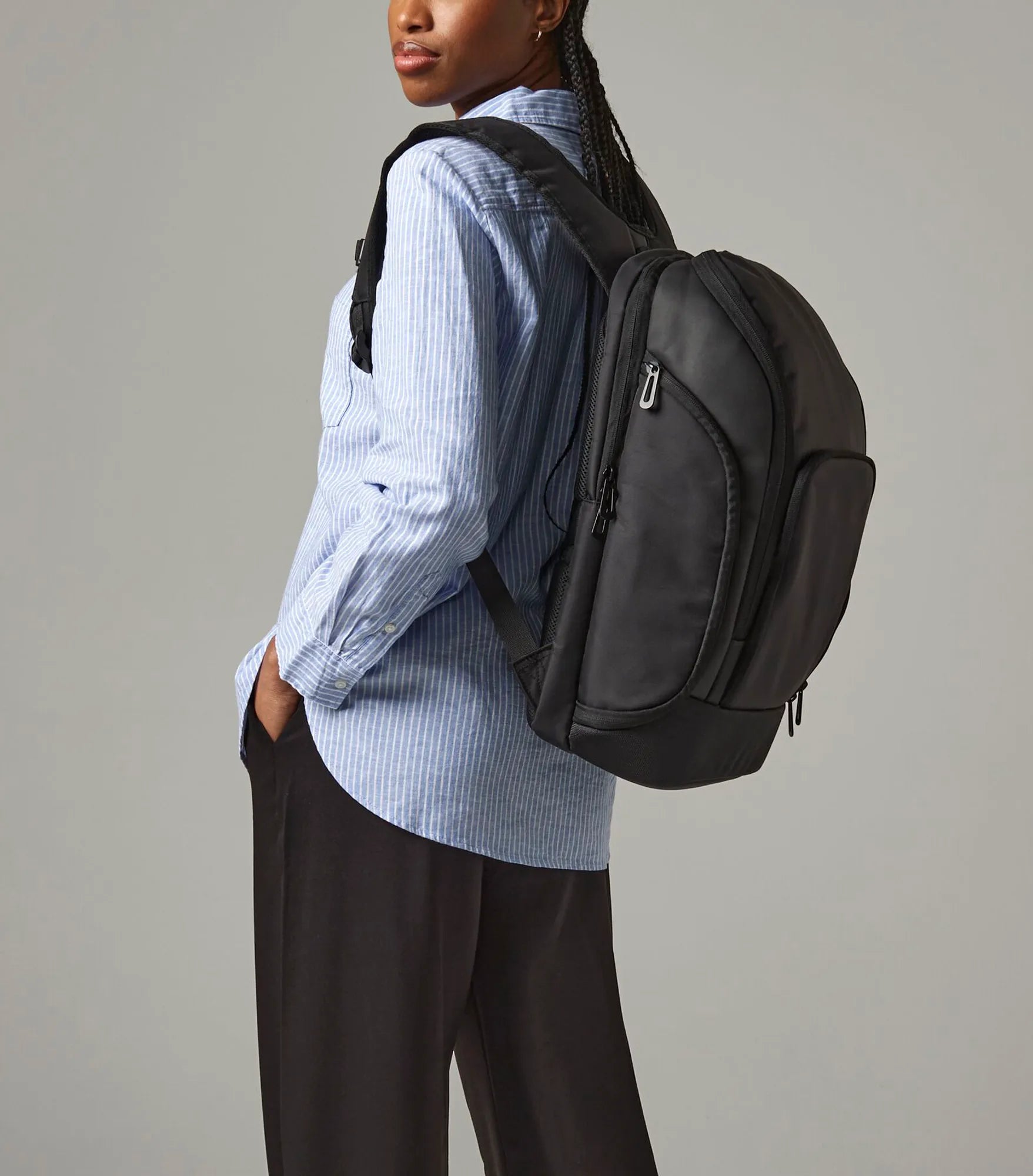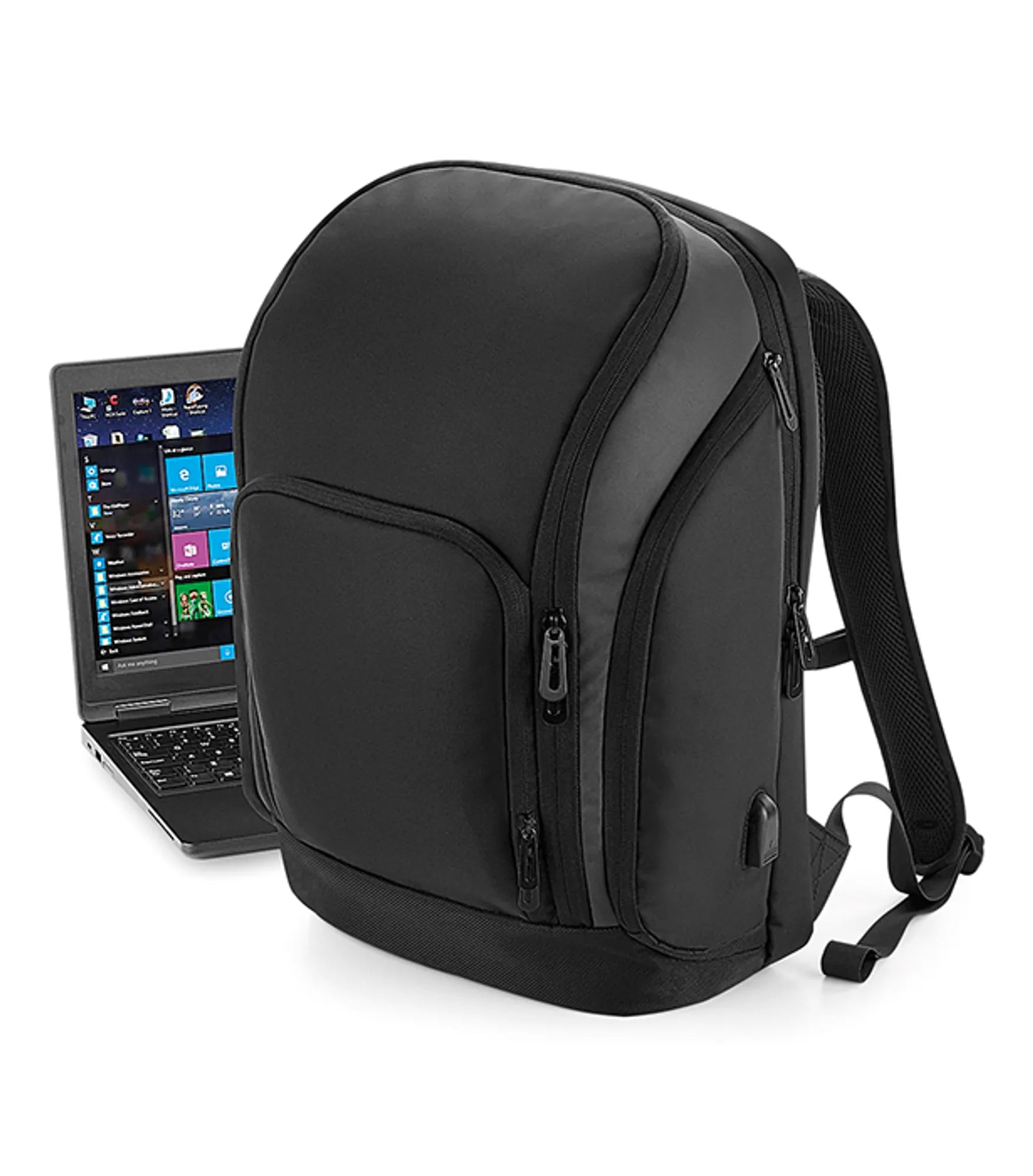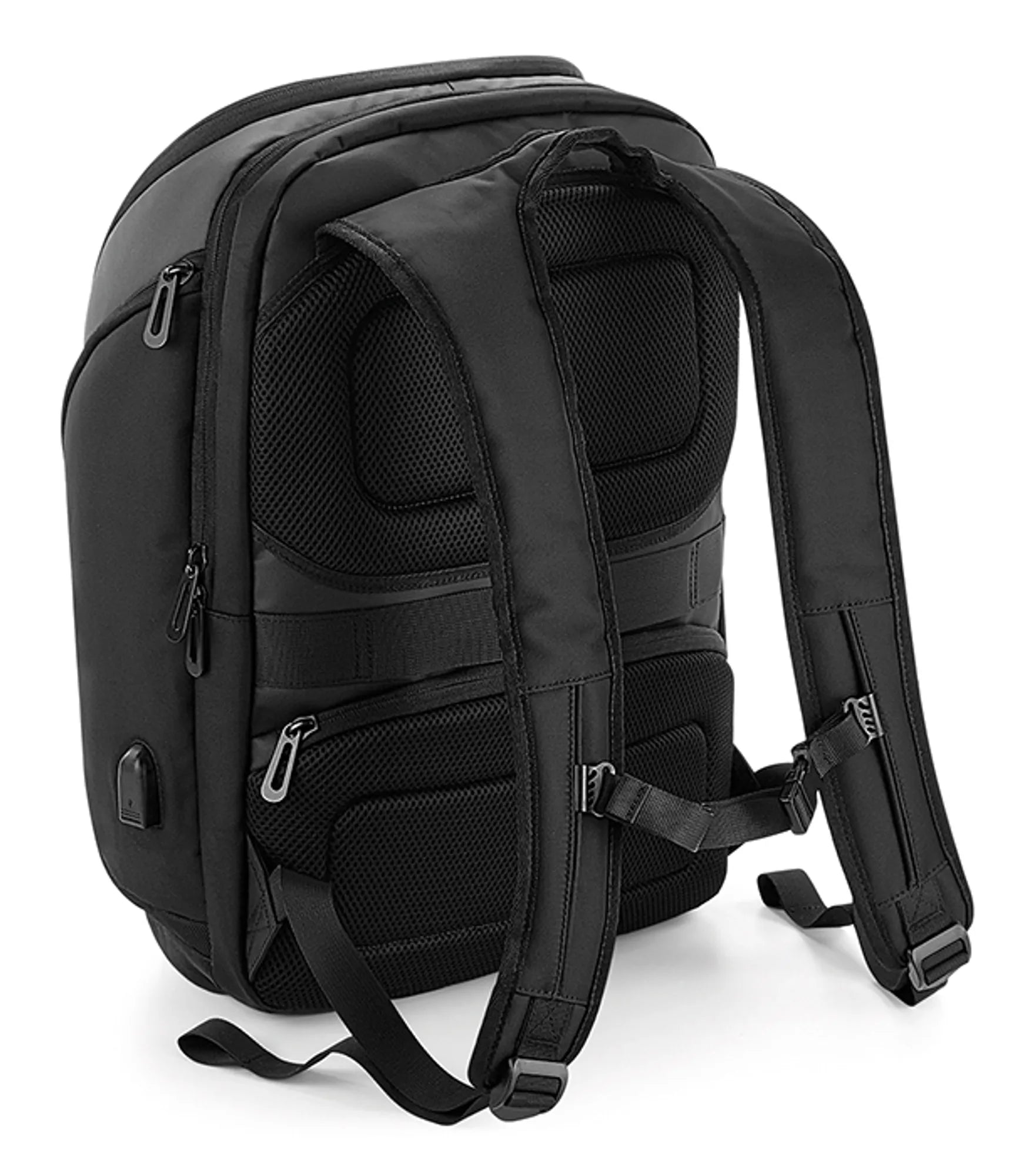 Technical backpack with integrated charging portal (usb). External, padded compartment for a 17" laptop with zip closure and padded pocket for tablet. Front pocket with organizational section. Discreet pocket with zip closure on back. Powerbank pocket. Interior pockets for valuables. Key holder. External side pockets with zip closure. Padded, ergonomic back. Carrying handle. Adjustable, padded shoulder straps and chest strap. Strap for attaching to trolley. Powerbank not included. Rebrandable.