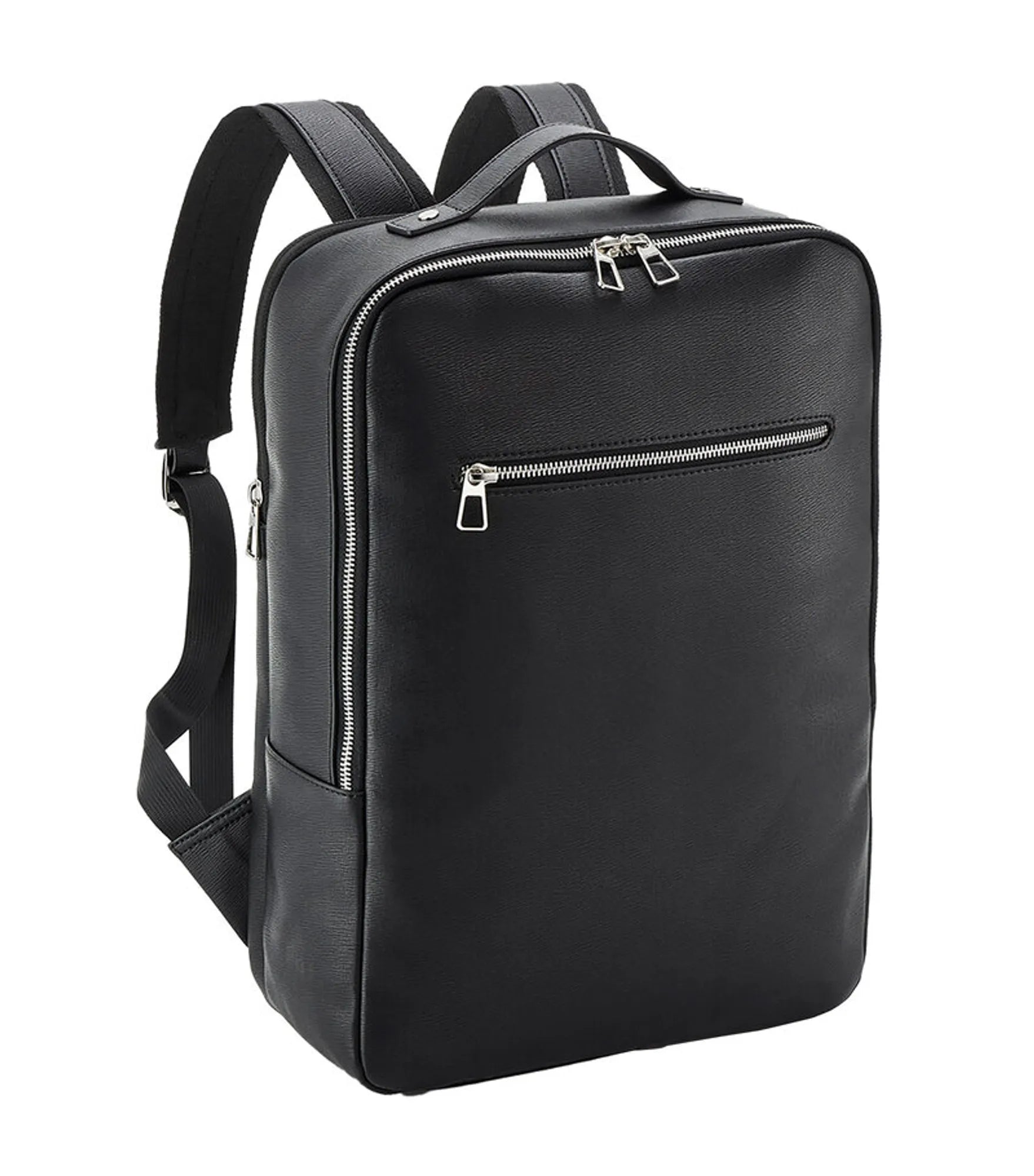 Backpack in leather imitation. Contains 100% GRS certified recycled polyester, certified by Control Union CU811033. Main compartment with two-way zipper. Rear padded laptop compartment, with room for a 16 inch laptop. Front zipper pocket. Internal bottle holder. Two internal slip pockets. Adjustable shoulder straps. Carrying handle. Rear strap for compatibility with rolling luggage cases. Lining with hidden zipper for decoration. TearAway label.