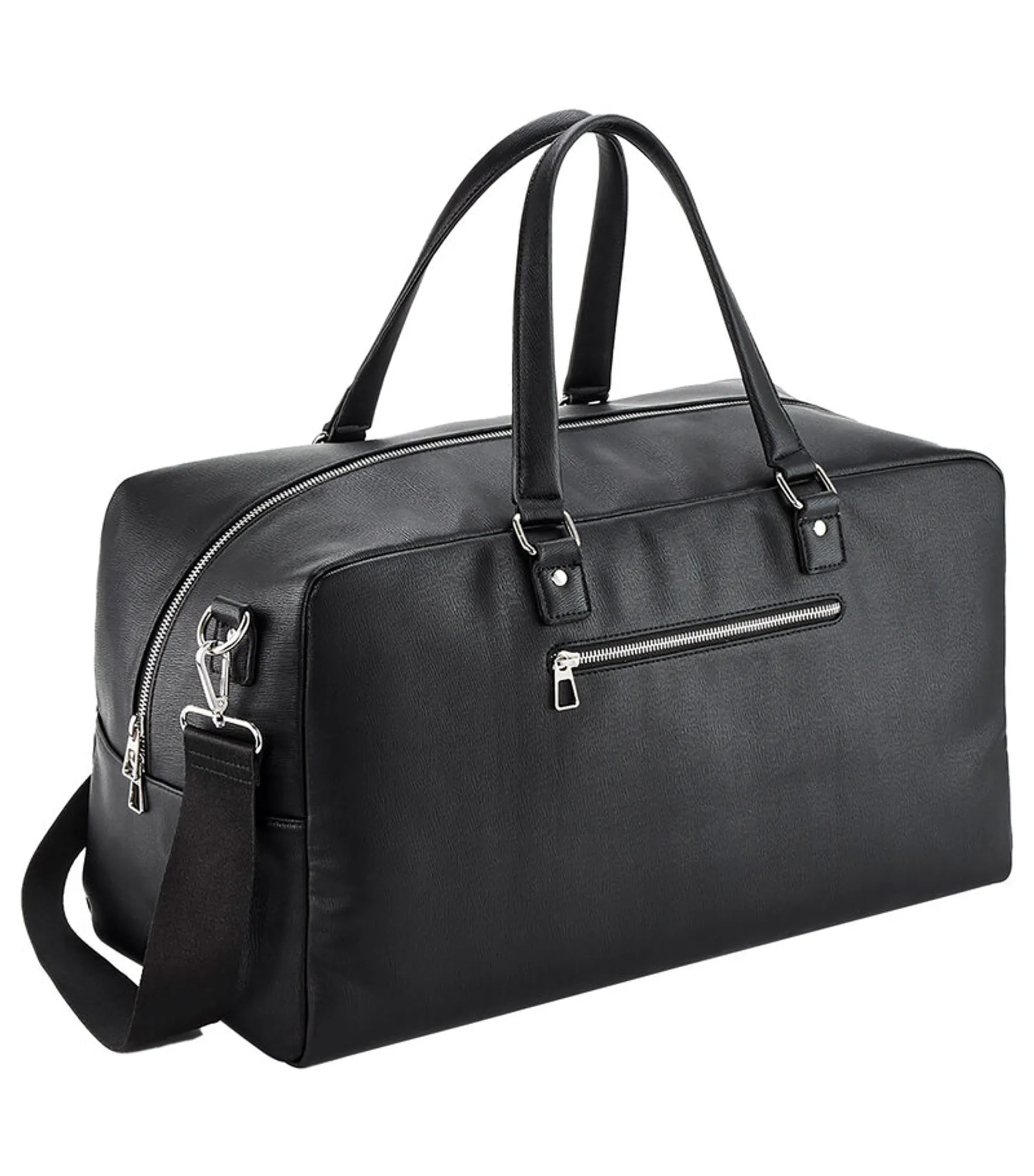 Weekender bag in faux leather. Contains 100% GRS-certified recycled polyester, certified by Control Union CU811033. Large main compartment with zipper. Front zipper pocket. Internal zipper pocket. Two internal slip pockets. Removable adjustable shoulder strap. Carry handle. Lining with hidden zipper for decoration. TearAway label.