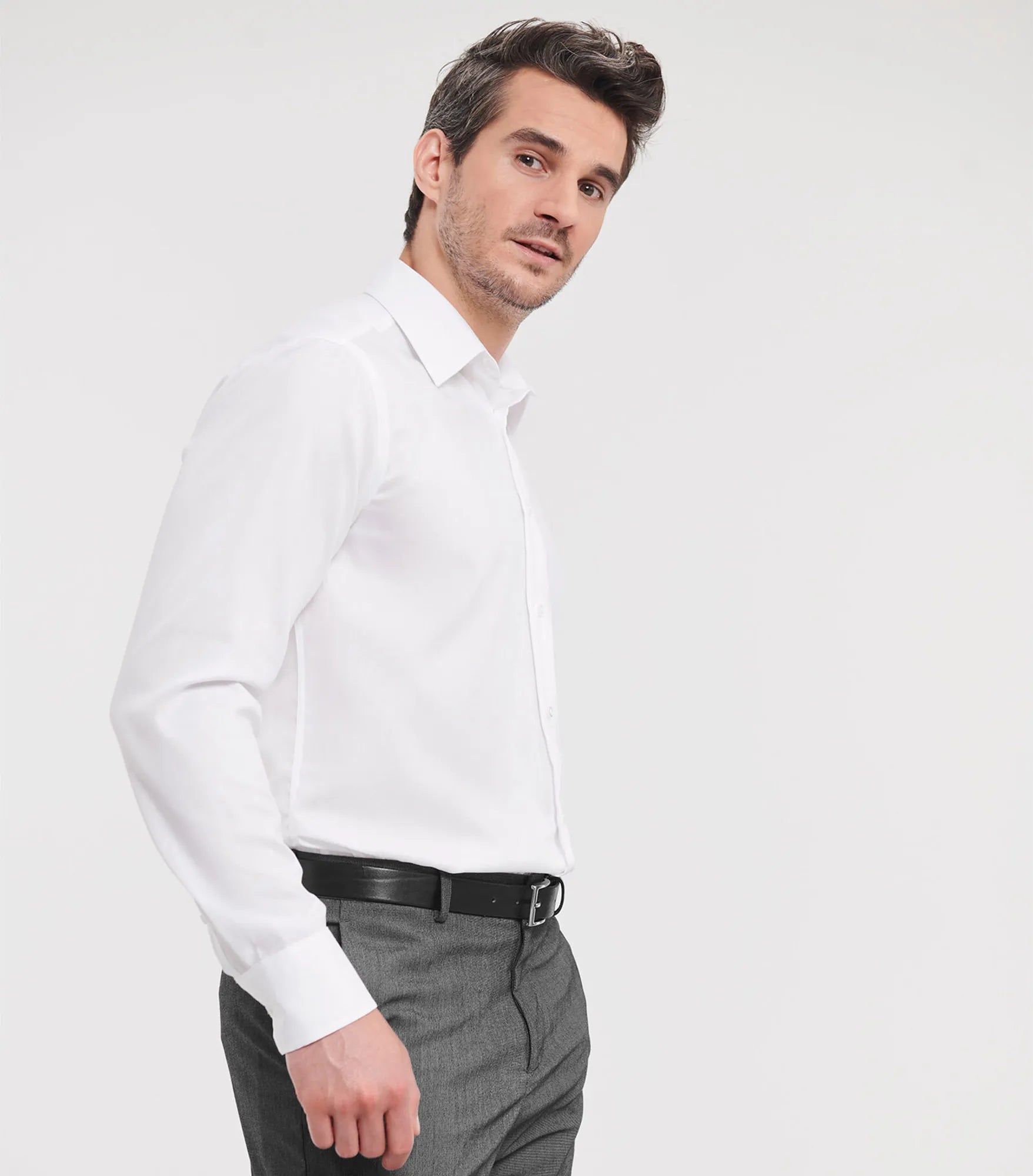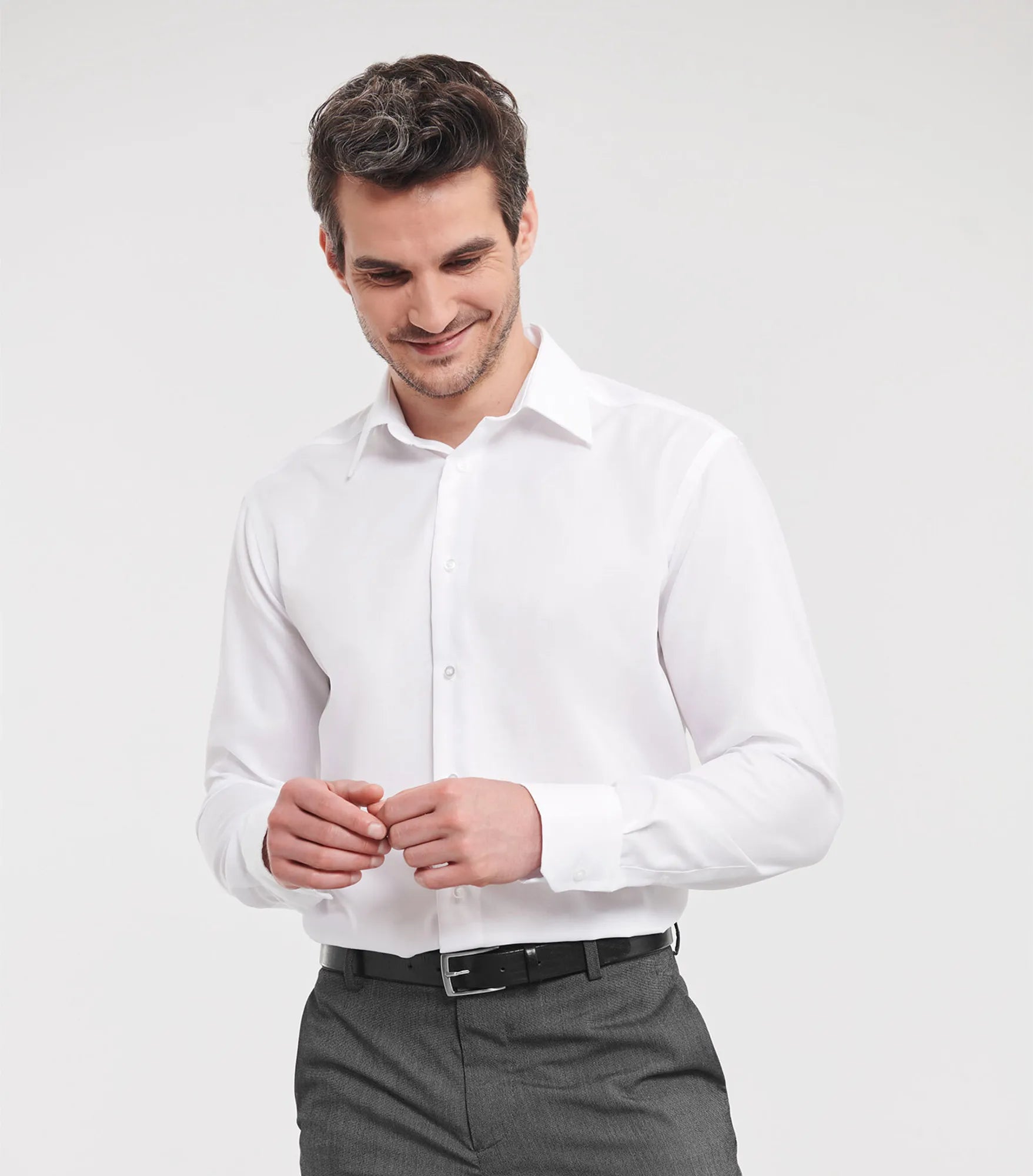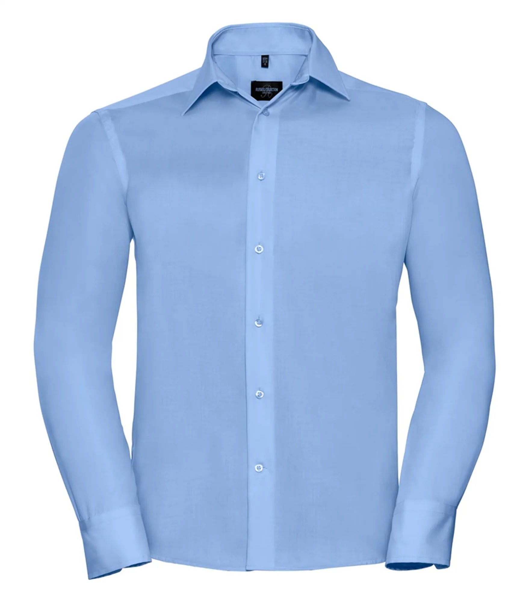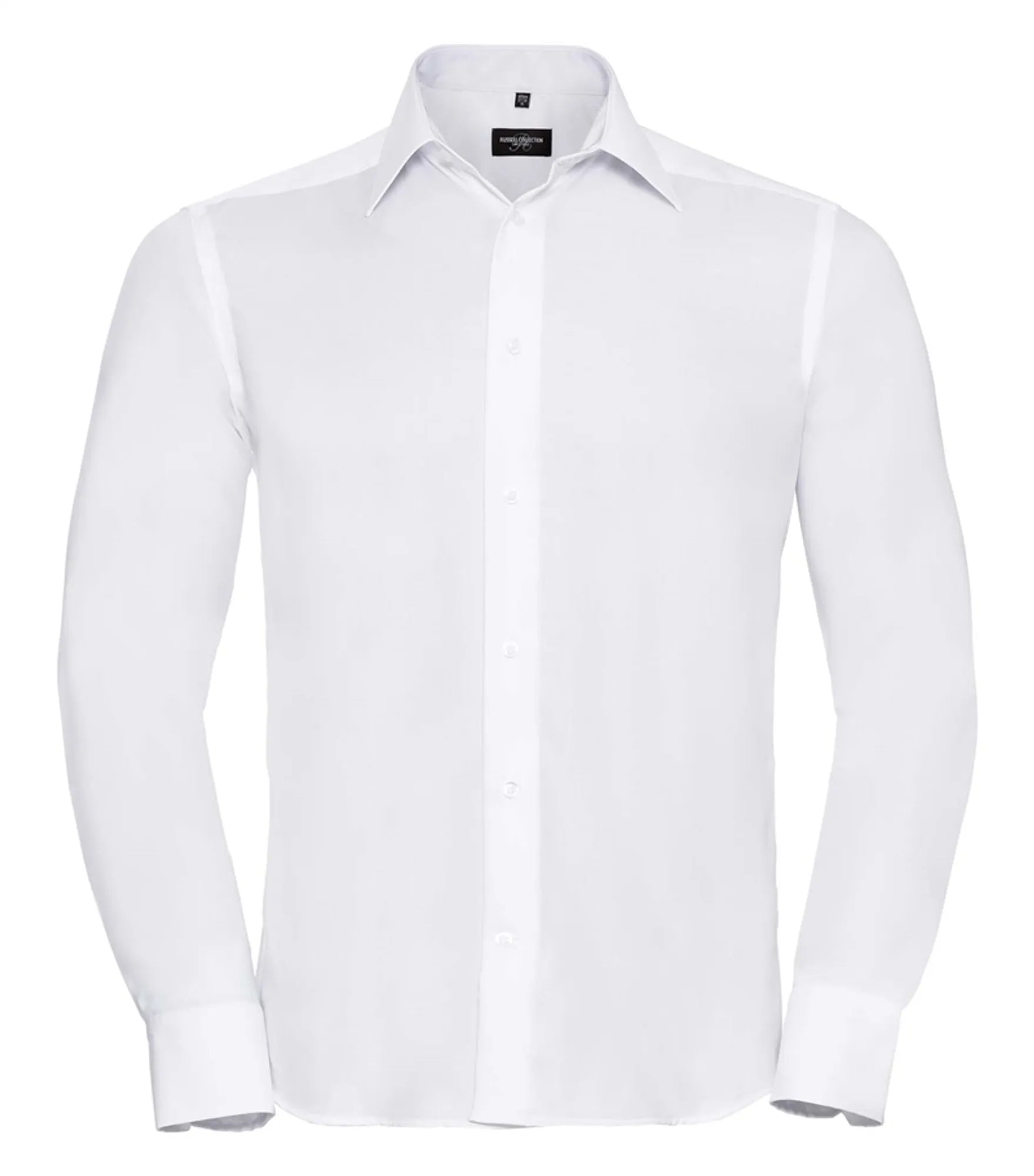 Non-iron business shirt with a slimmer fit. Cufflinks can be used.