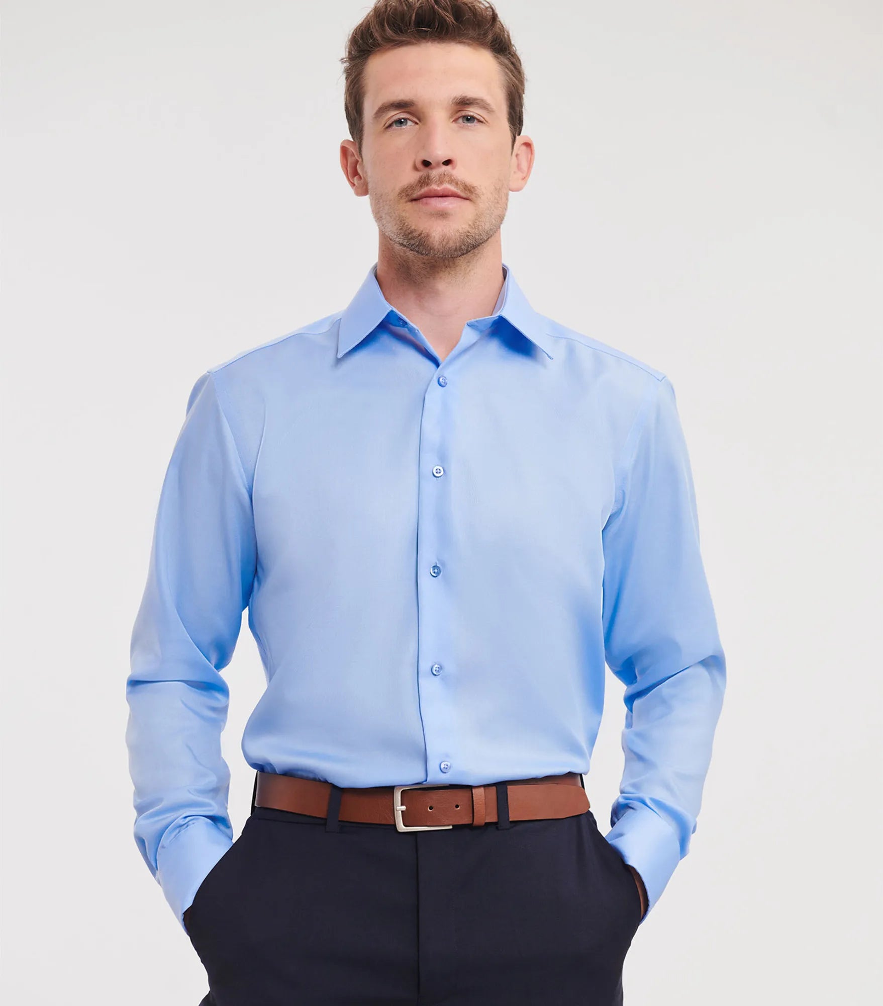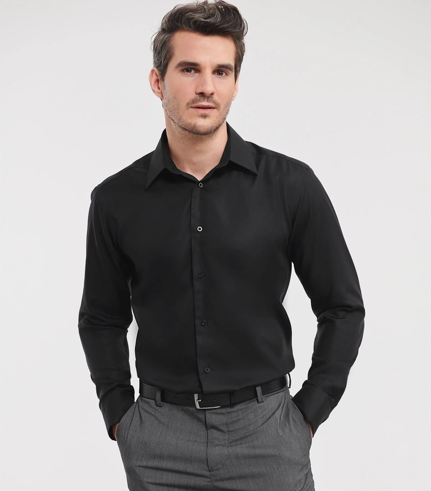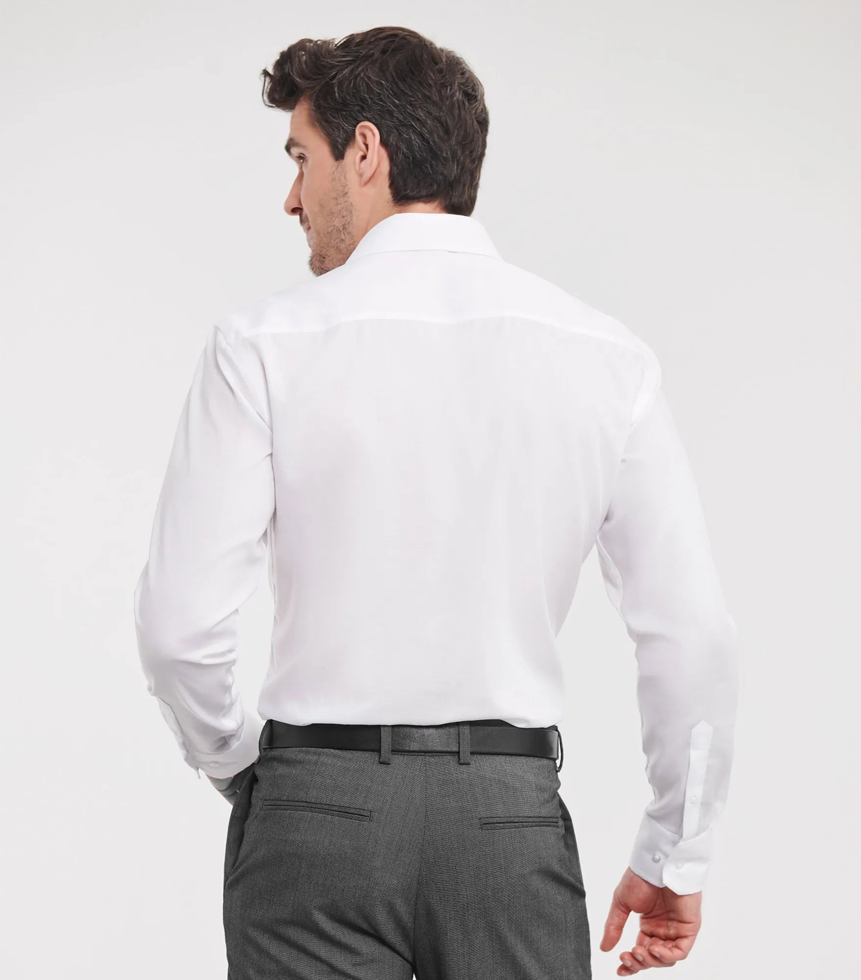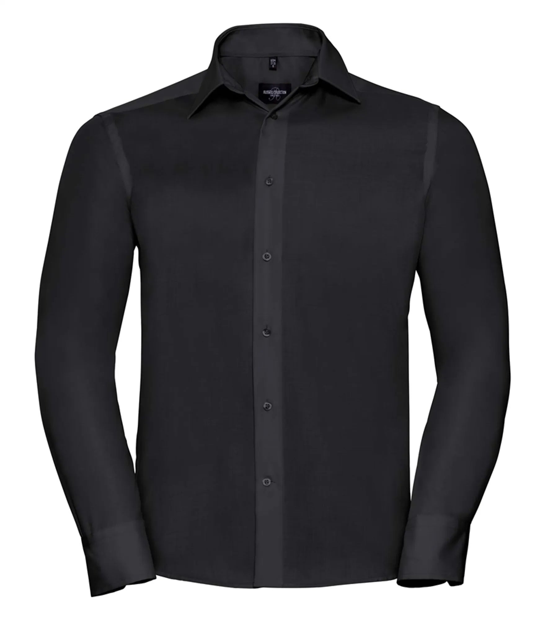 Non-iron business shirt with a slimmer fit. Cufflinks can be used.