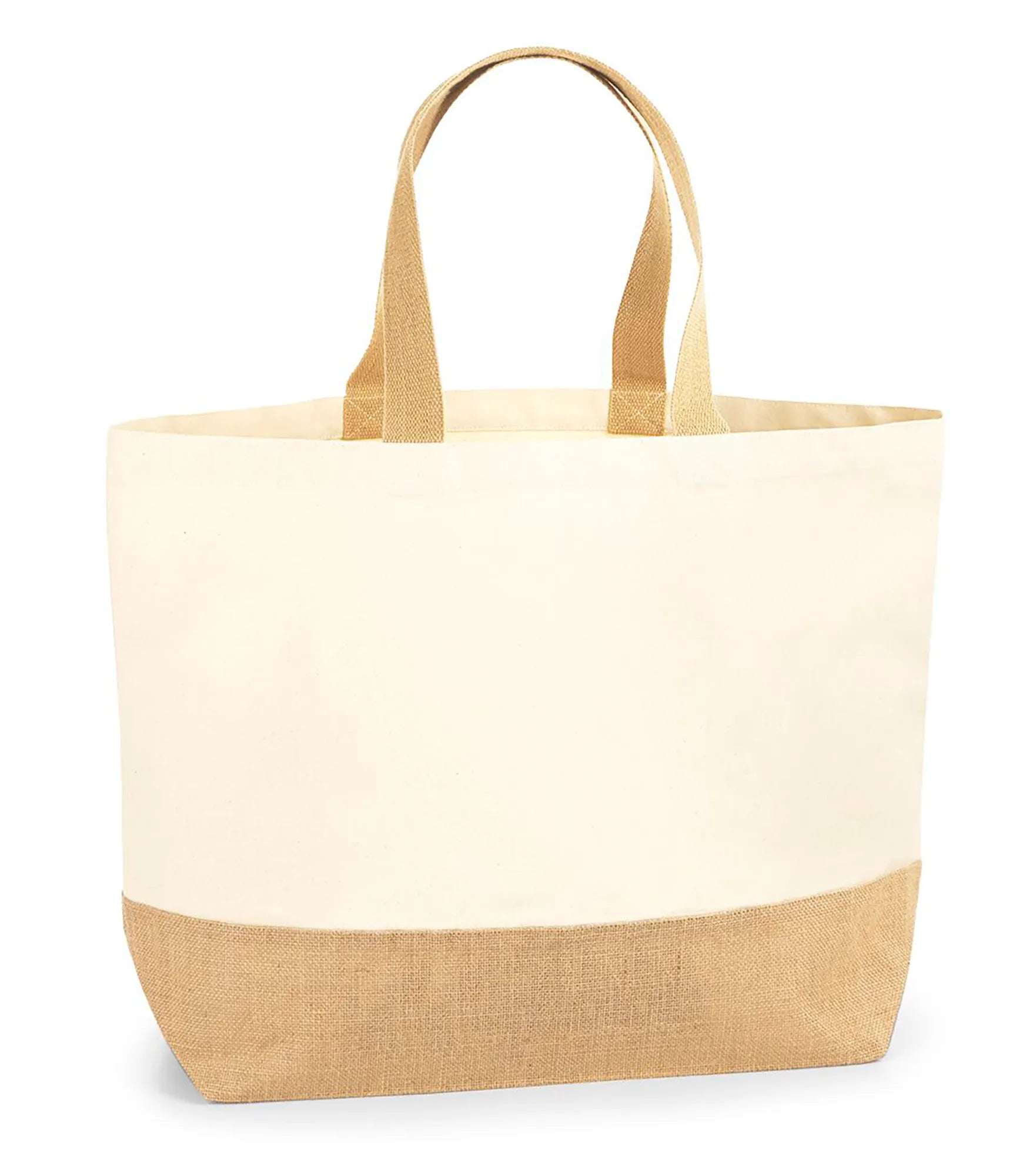 A stylish and durable tote with a large capacity that combines heavy cotton canvas with a robust laminated jute base. The premium heavyweight quality makes the bag perfect for shopping, everyday use and branding. With print-friendly canvas and comfortable woven handles it can be carried by hand or over the shoulder, handle length: 63 cm. TearAway label for easy rebranding.