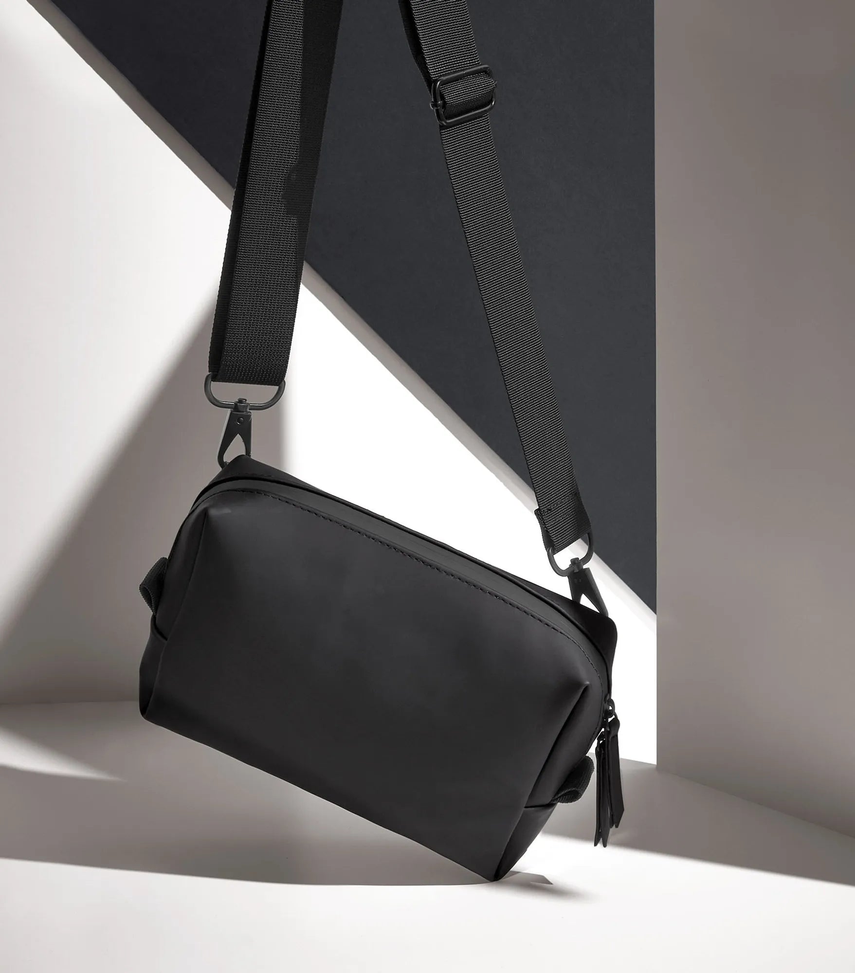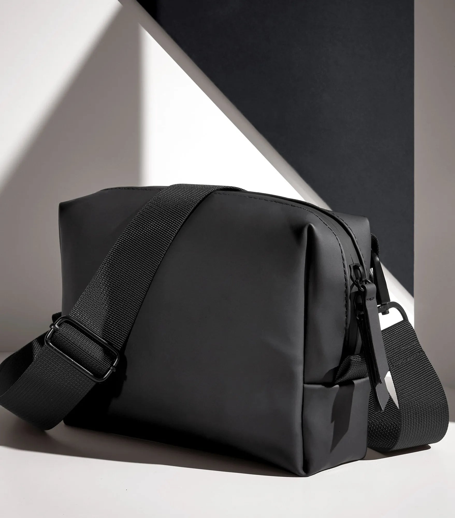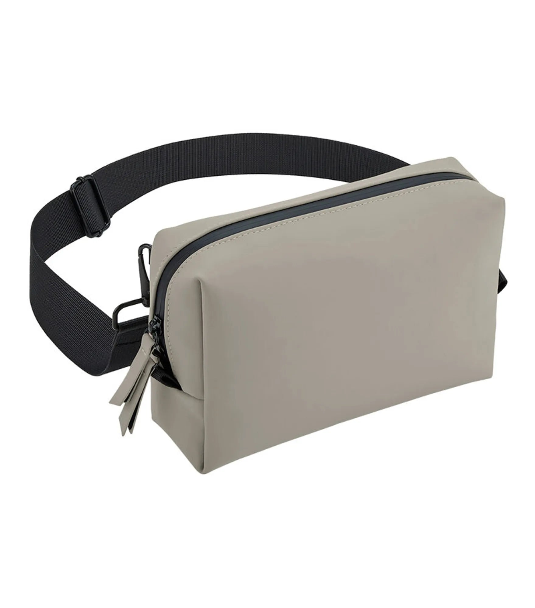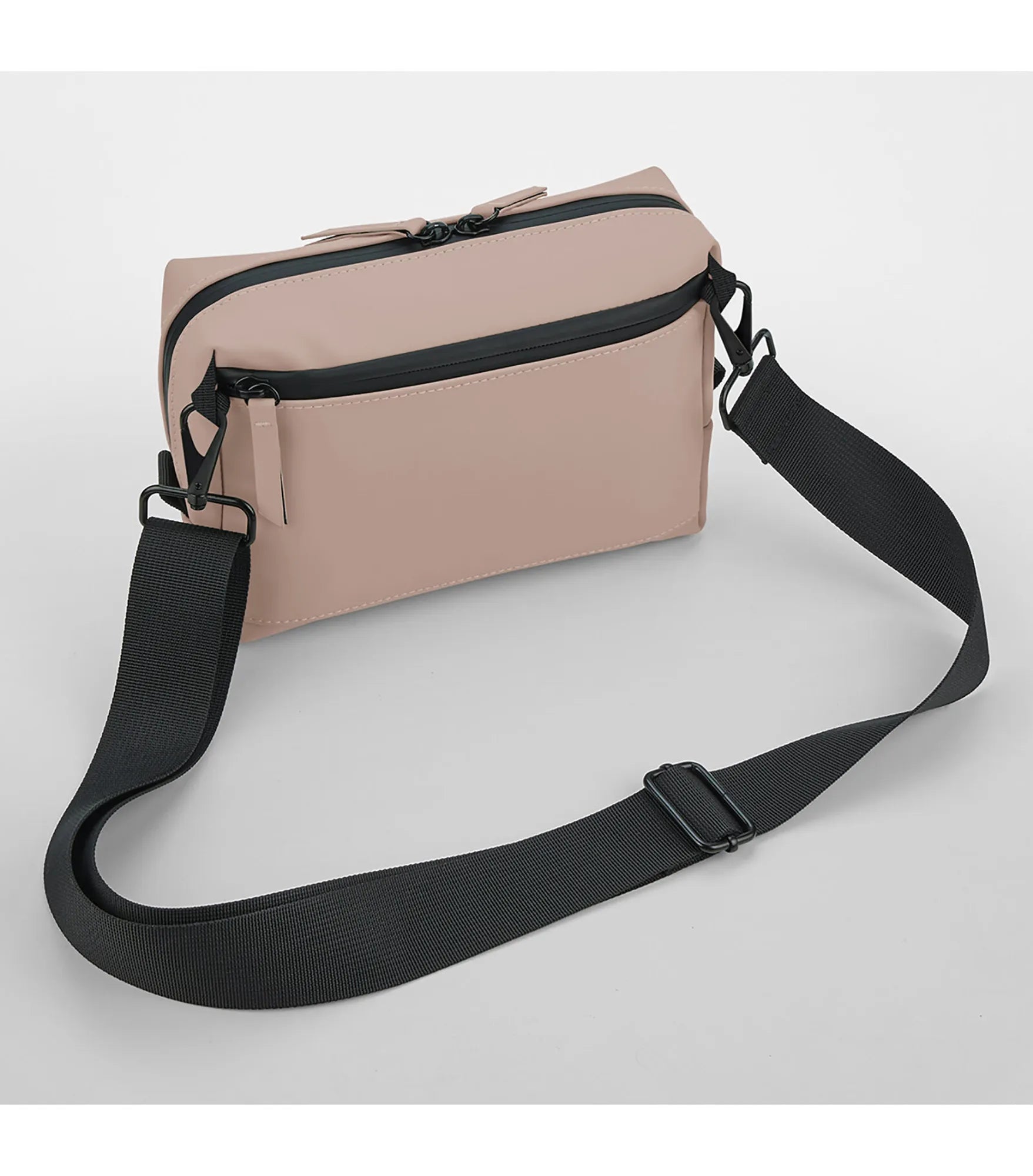 Shoulder bag made of recycled, water-resistant material with a matt PU coating. Main compartment with two-way zipper for easy access. Zippered pocket on the back. Interior mesh pocket. Rubber coated zippers. Removable adjustable shoulder strap. PVC-free. TearAway label.