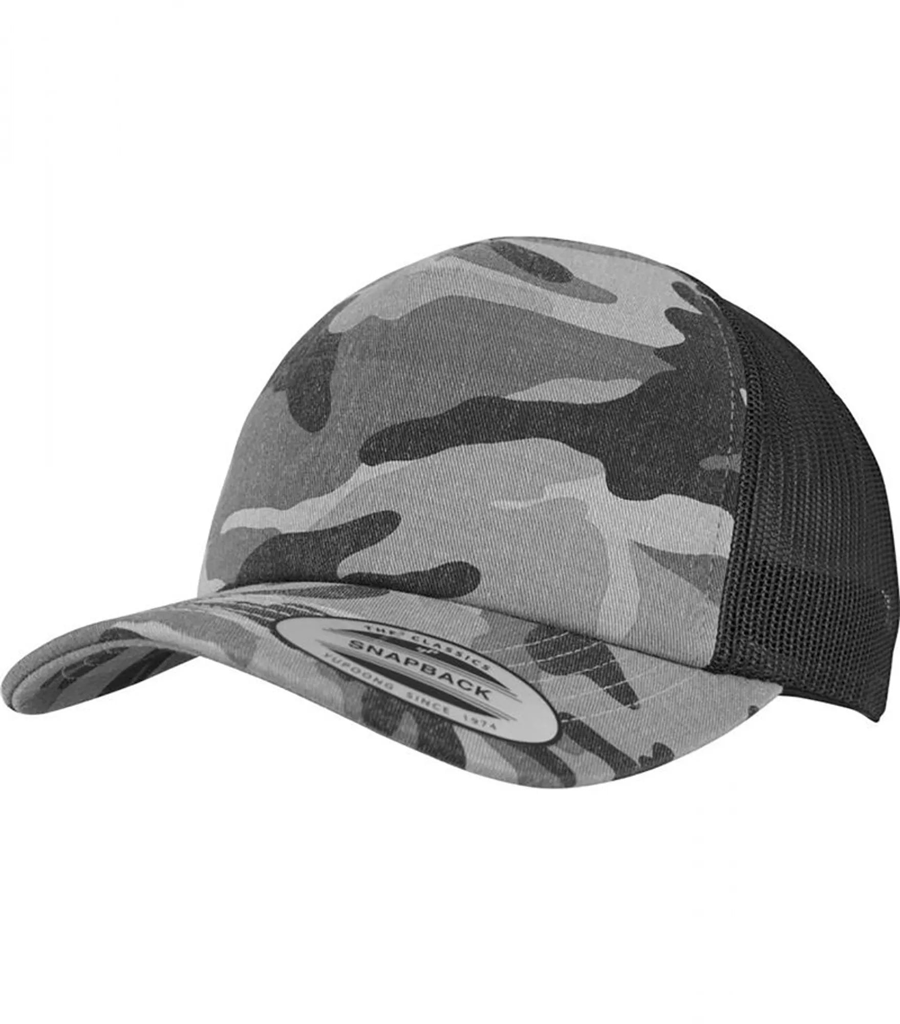 Klassisk truckercap med kamuflasjetrykk i vintage stil. Forsterker framside og luftig meshbakside. 6 paneler og forbøyd skjerm med matchende underside. Justerbar snapbackspenne av plast i matchende farge.