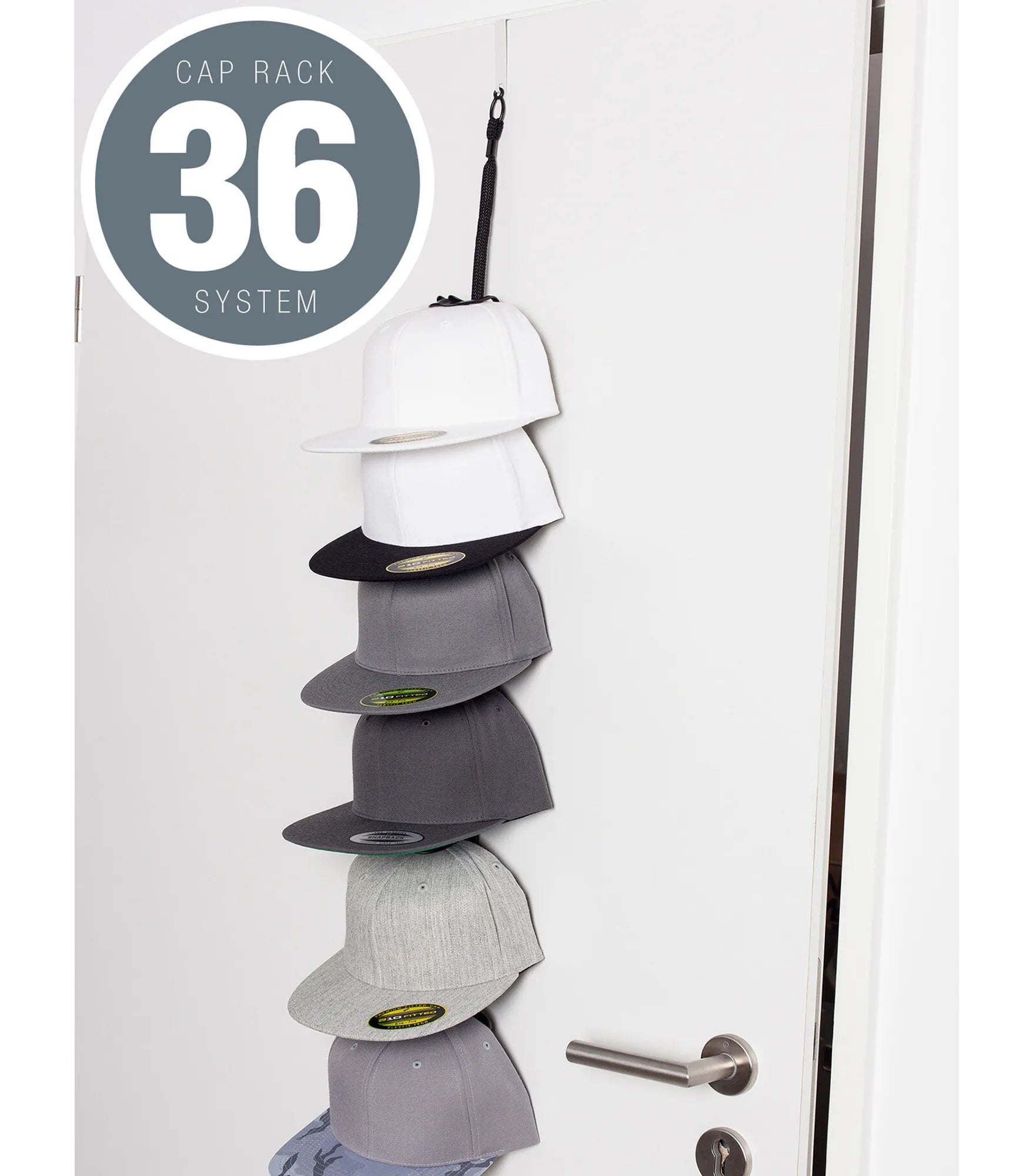 CapRack 36-systemet är det mest avancerade display-, organisering- och förvaringssystemet som någonsin utvecklats. Visa 12 kepsar samtidigt som du samtidigt förvarar ytterligare 24 bakom dem för totalt 36 kepsar. CapRack 36-systemet kan hängas över en dörr, på en vägg, snurras över en garderobsstav - till och med hängas från taket som en mobil. Perfekt för både kepsbärare och samlare, det kan användas i vardagsrummet, sovrummet, uterummet, garaget, studentrummet - var som helst där du vill visa upp eller förvara dina kepsar. Kittet inkluderar 12 klämmor och en 5-fots snodd i svart plus monteringsmaterial. Avståndet mellan kepsarna kan justeras individuellt.